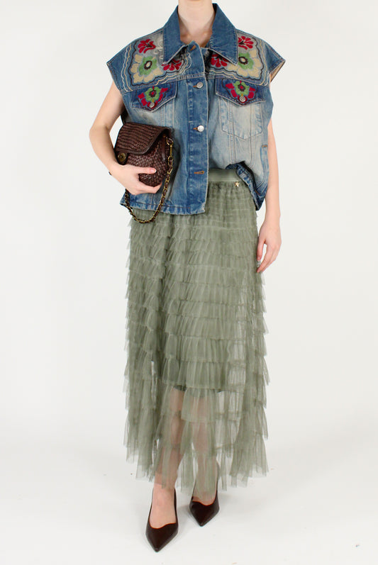 Gilet in Denim con Ricami Floreali