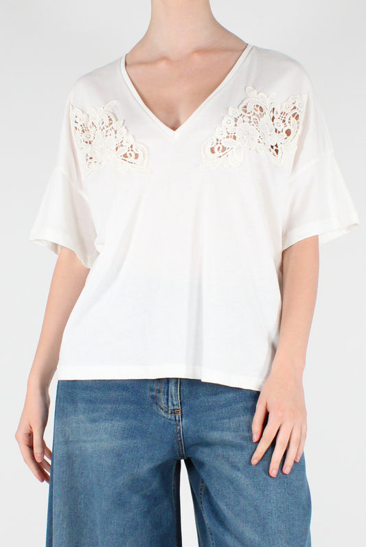 T-shirt Scollo a V Inserti in Pizzo