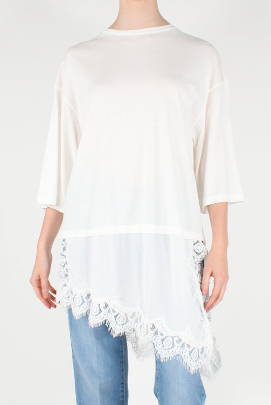 T-shirt Over con Tulle e Pizzo Asimmetrico