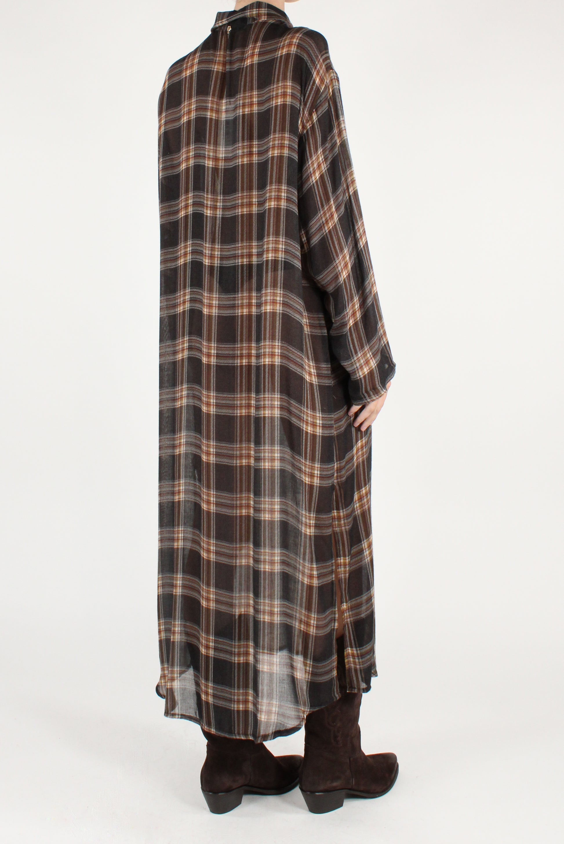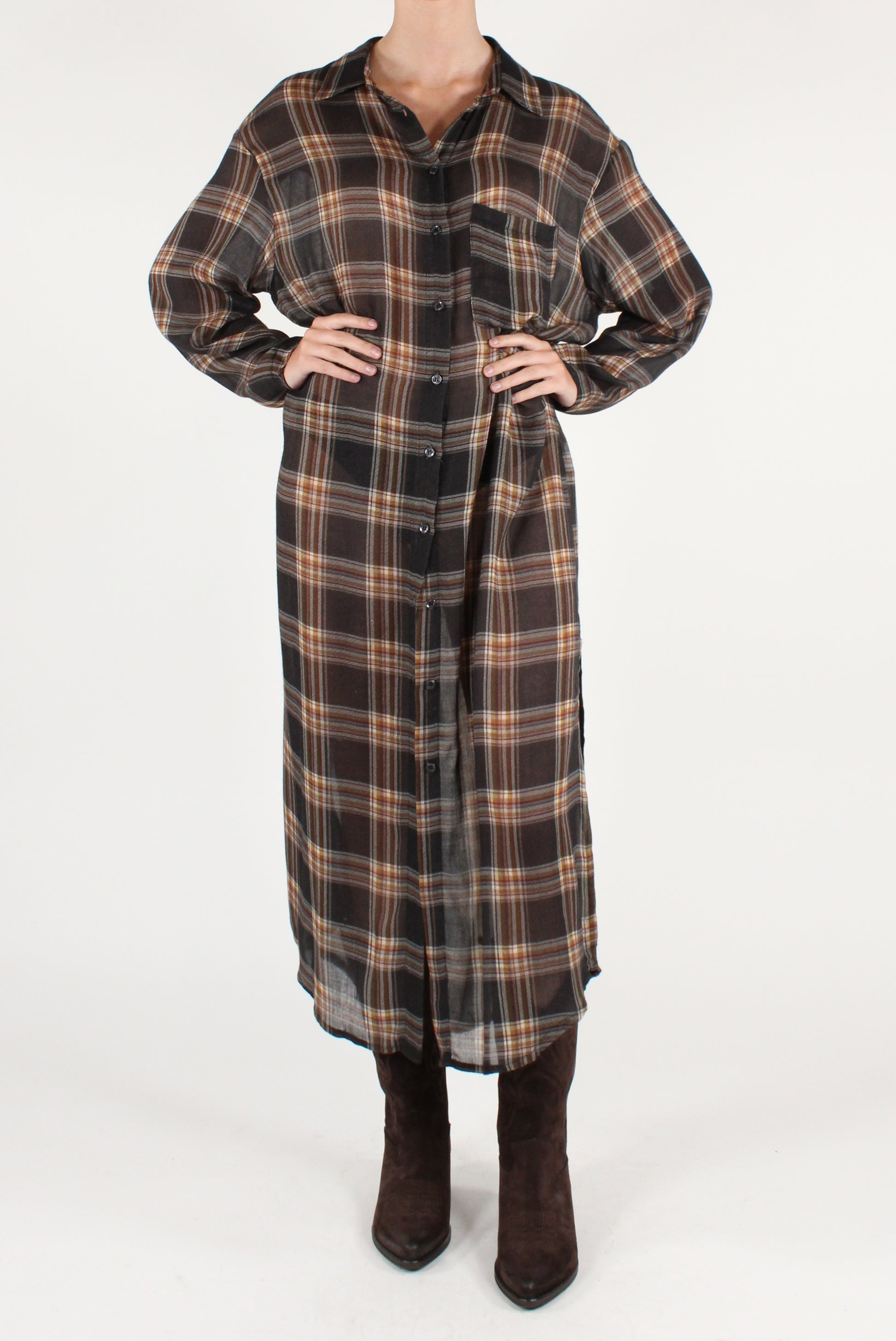 Tartan shirt dress in a viscose and wool blend. Featuring a classic shirt collar, long sleeves with a button fastening and side slits. Patch pocket detail on the front.