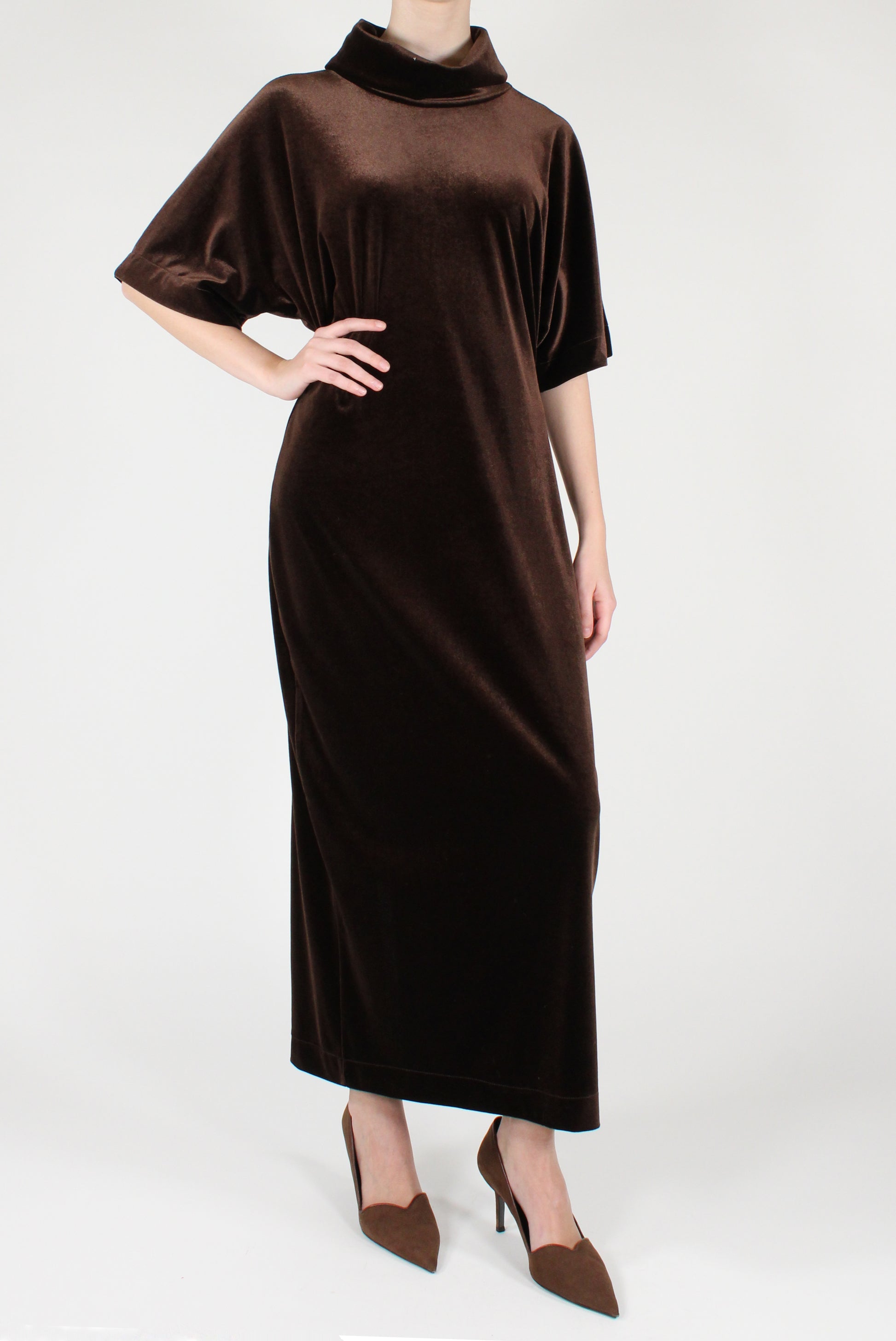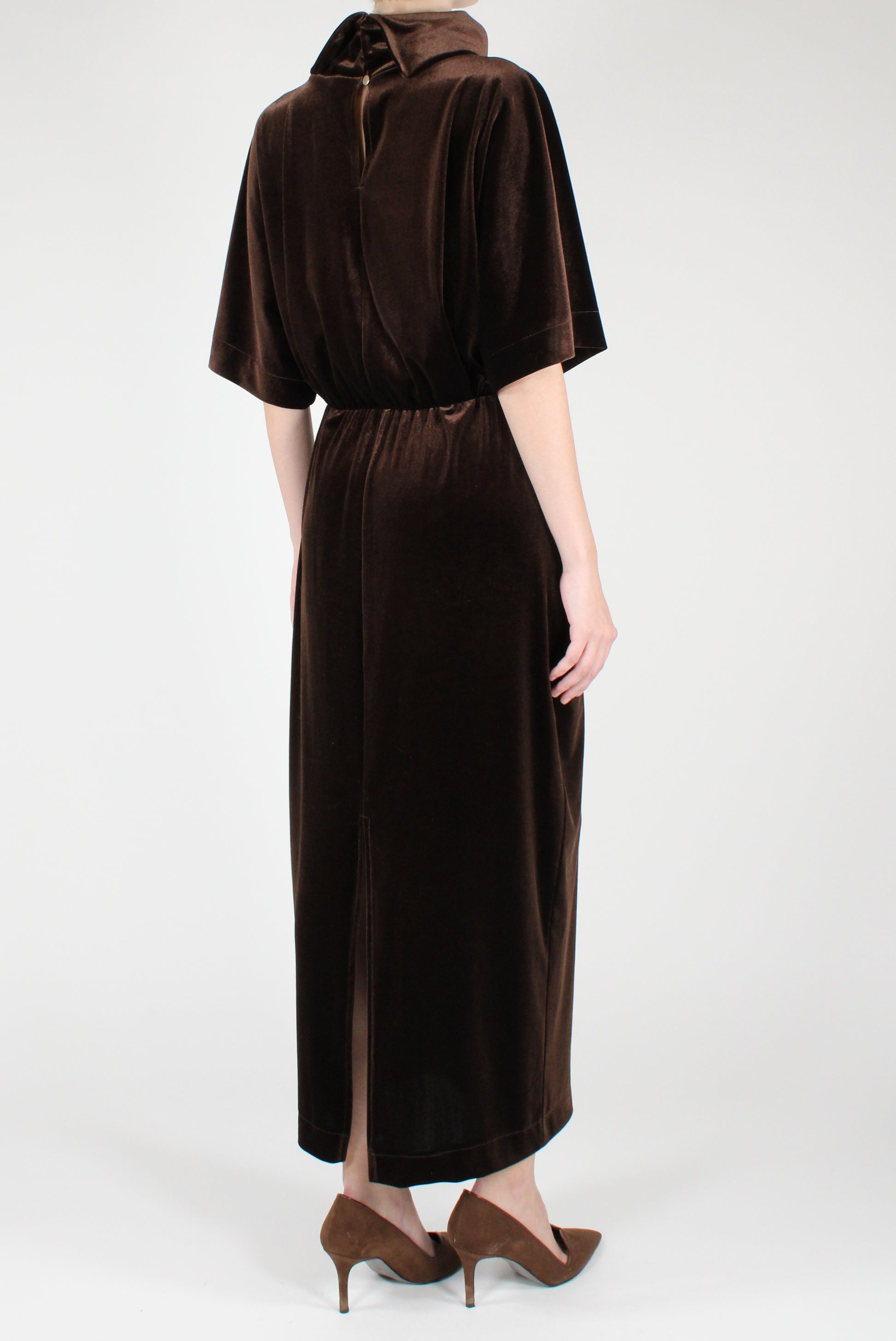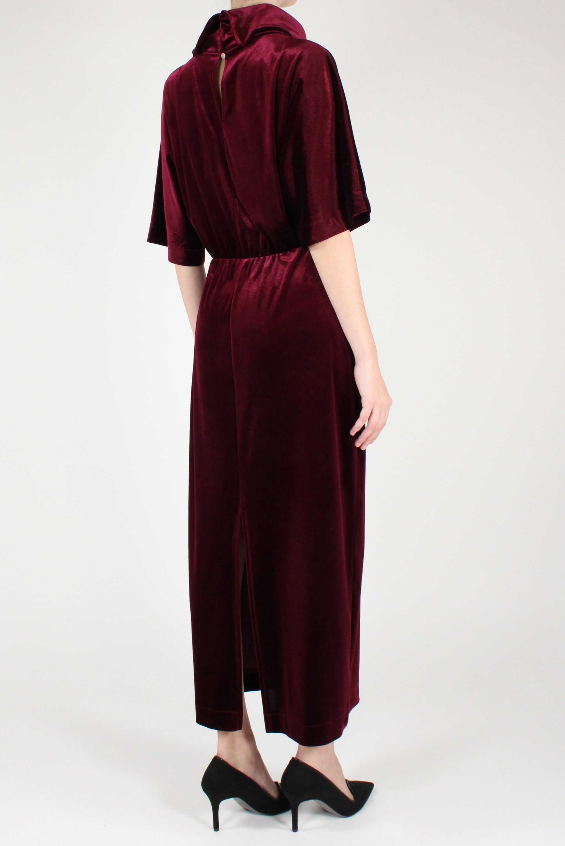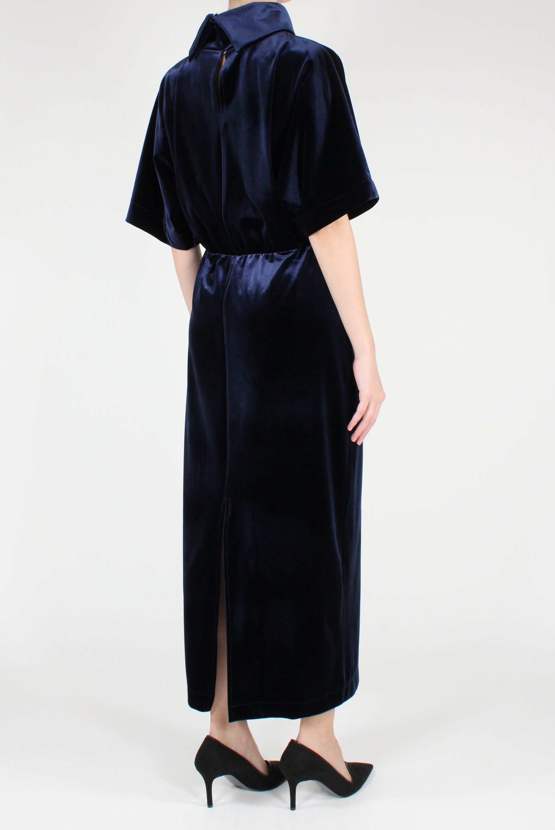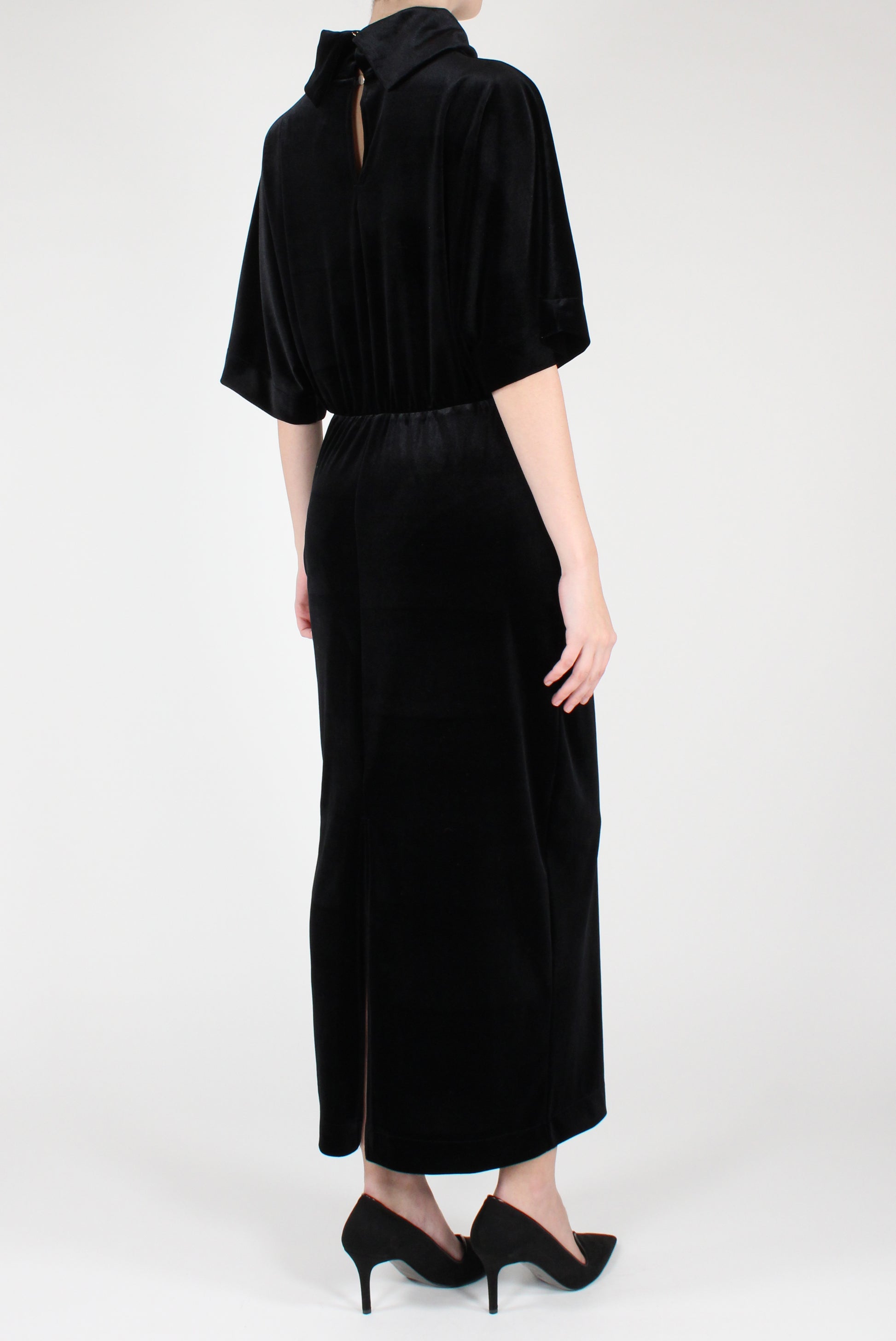 Abito lungo in velluto. Maniche lunghe fino al gomito, colletto con allacciatura a bottoni dietro al collo, elastico in vita solo sul retro, con spacco dietro. Leggermente elasticizzato.