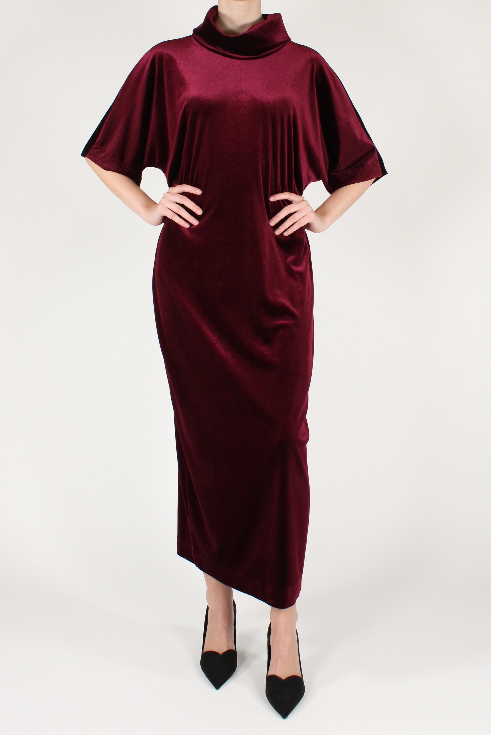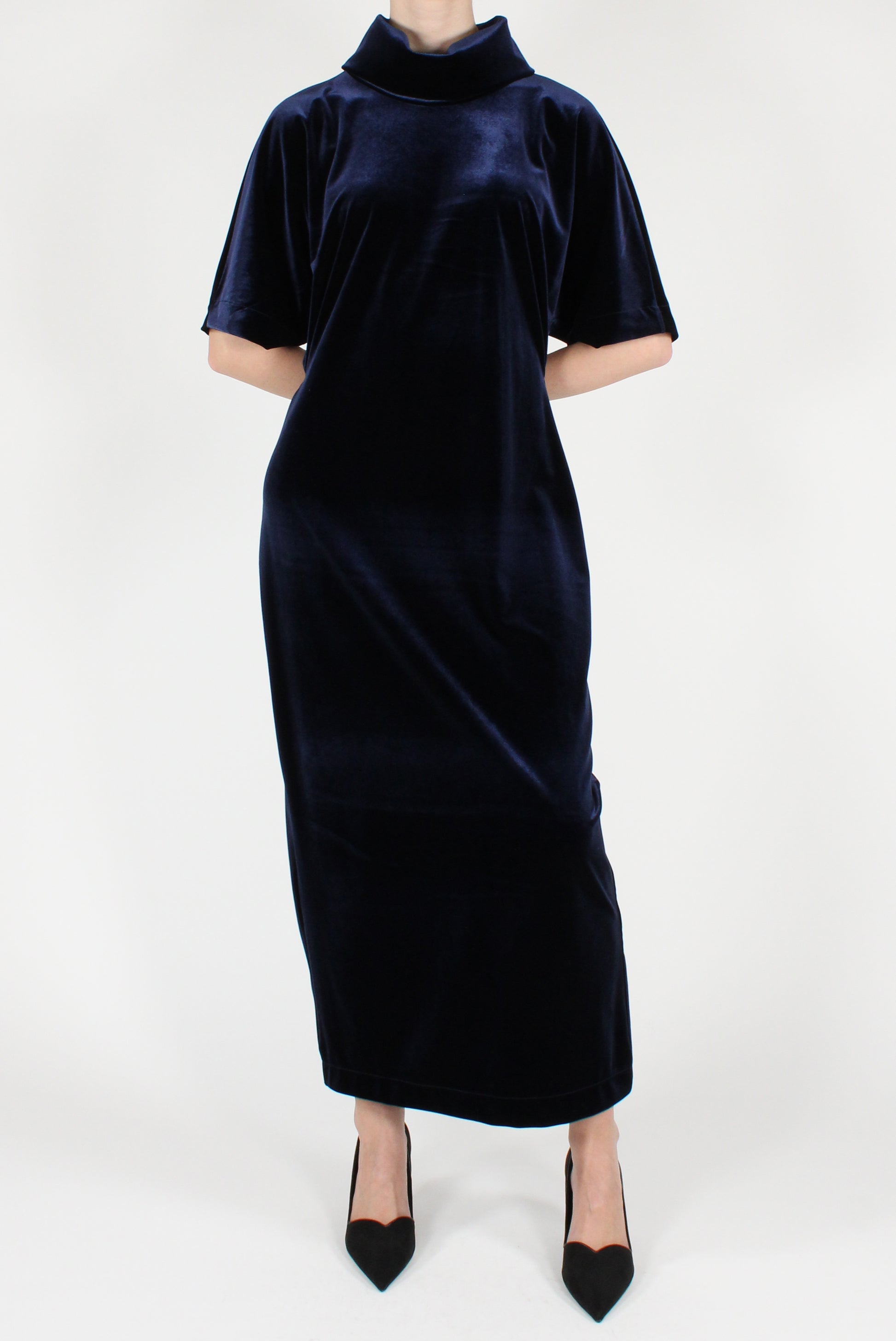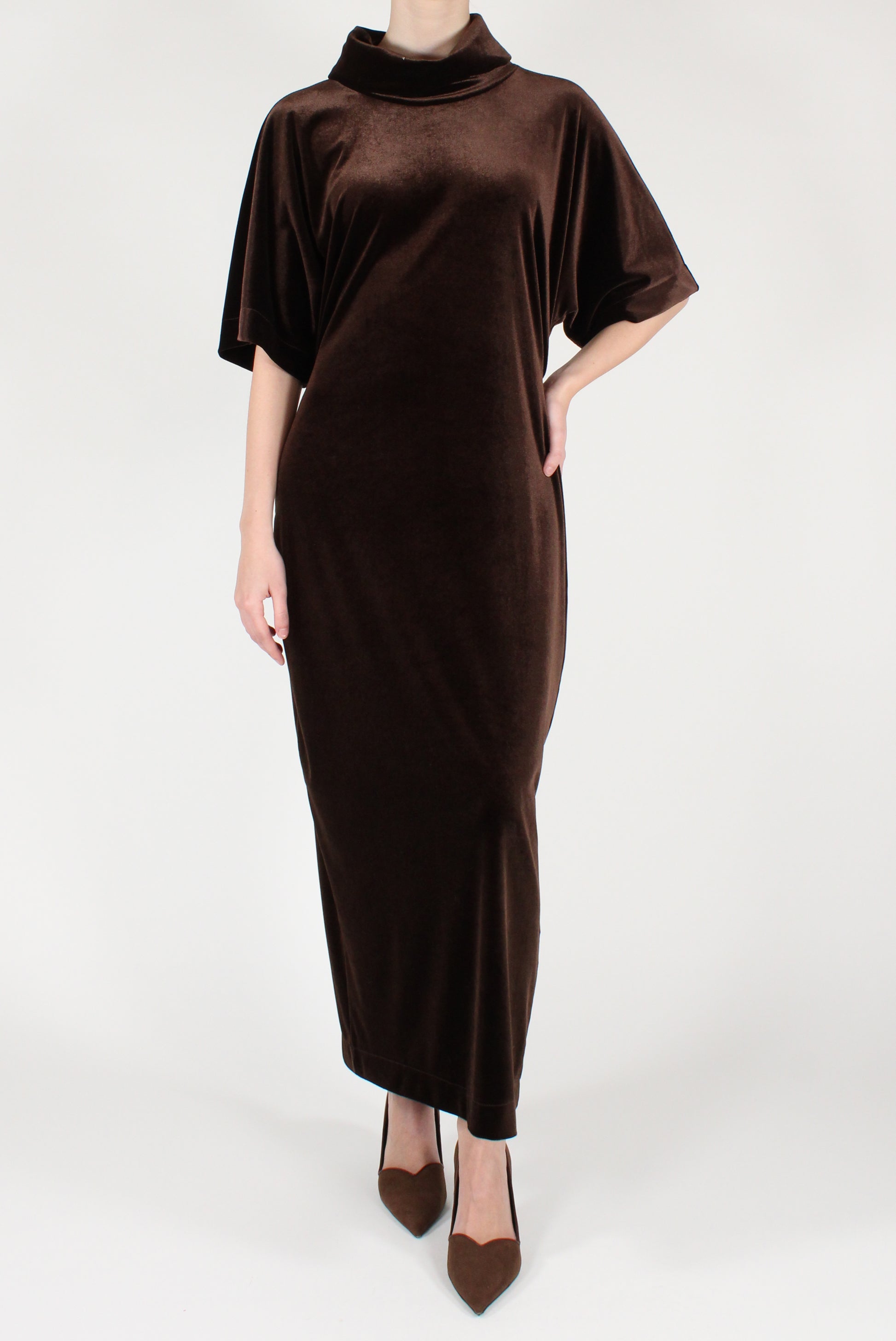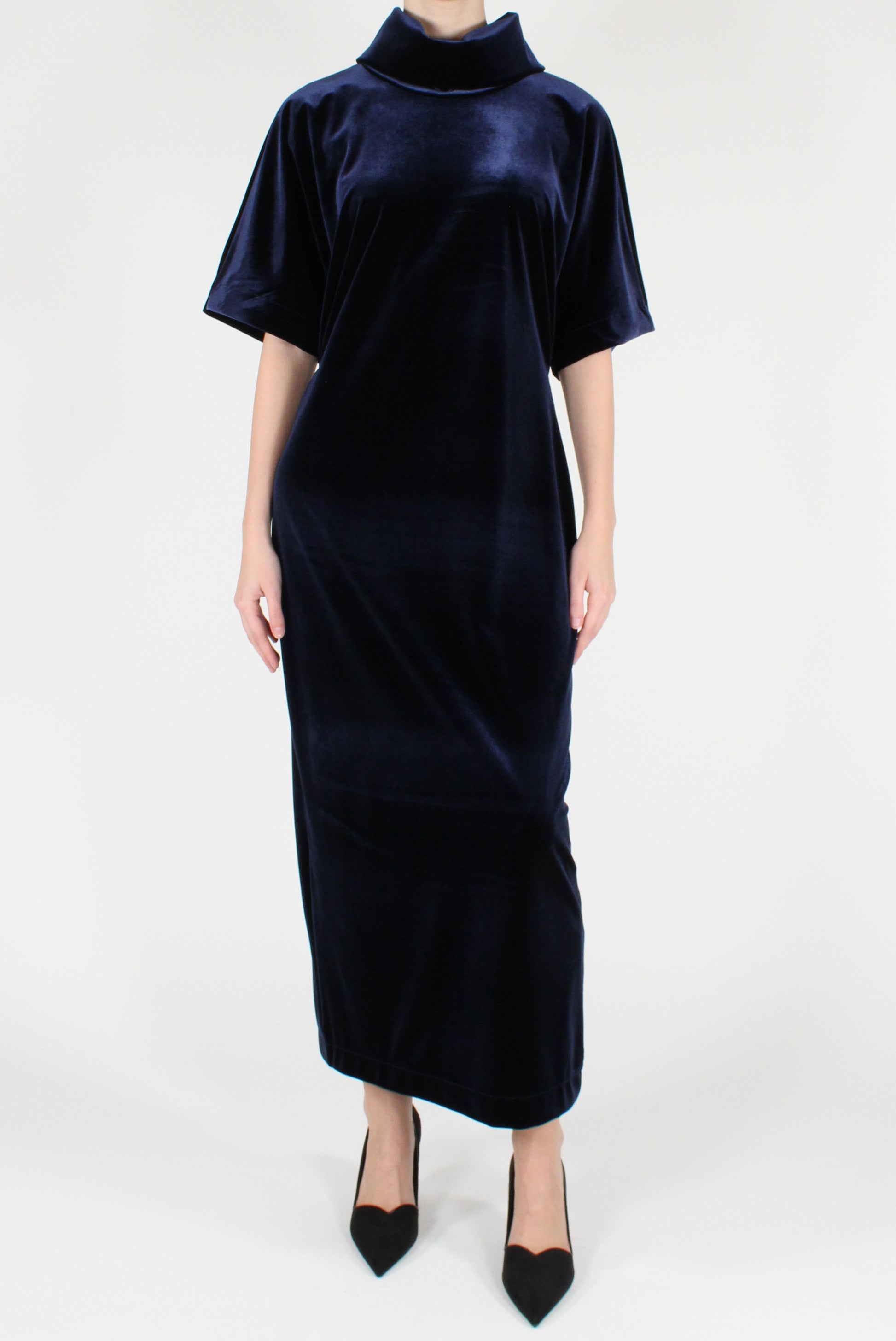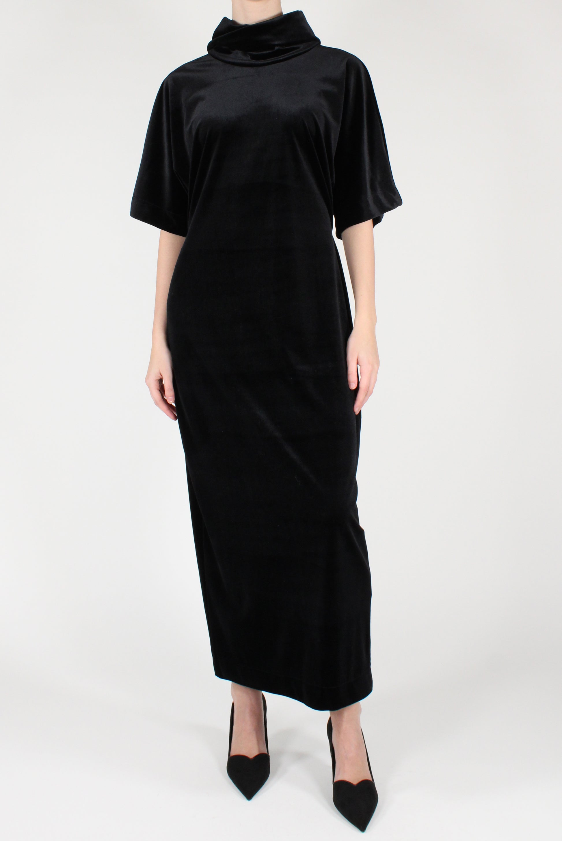 Abito lungo in velluto. Maniche lunghe fino al gomito, colletto con allacciatura a bottoni dietro al collo, elastico in vita solo sul retro, con spacco dietro. Leggermente elasticizzato.