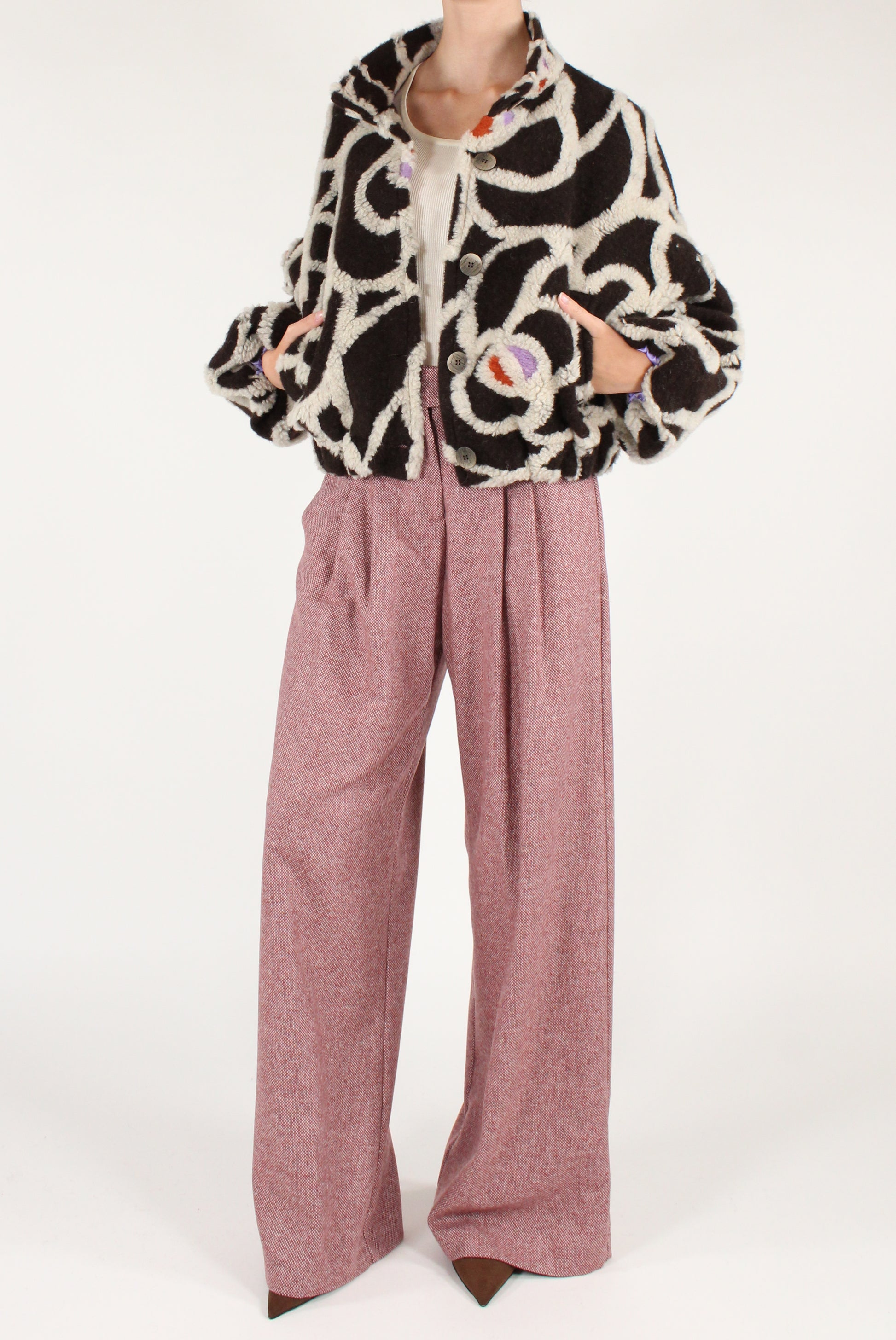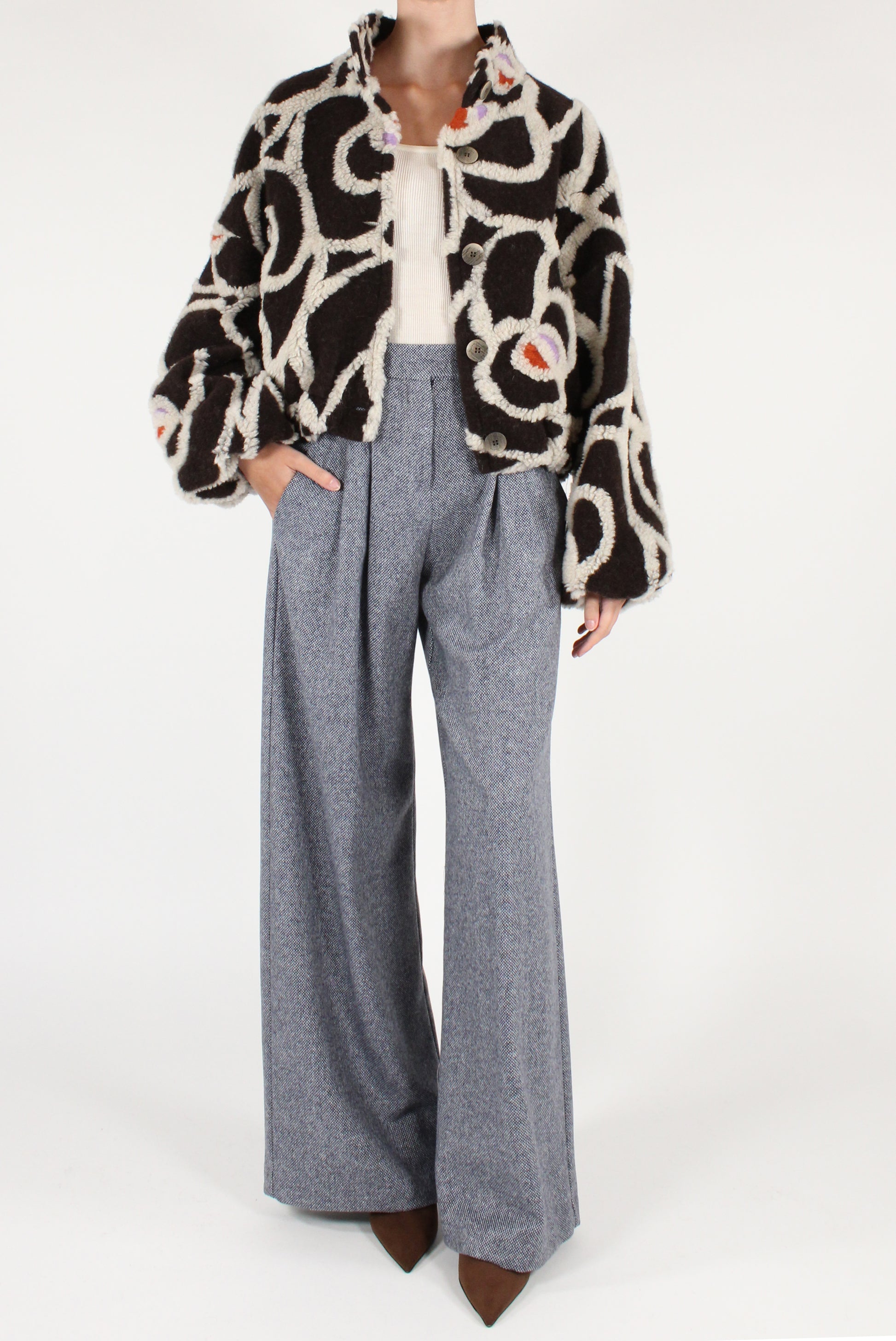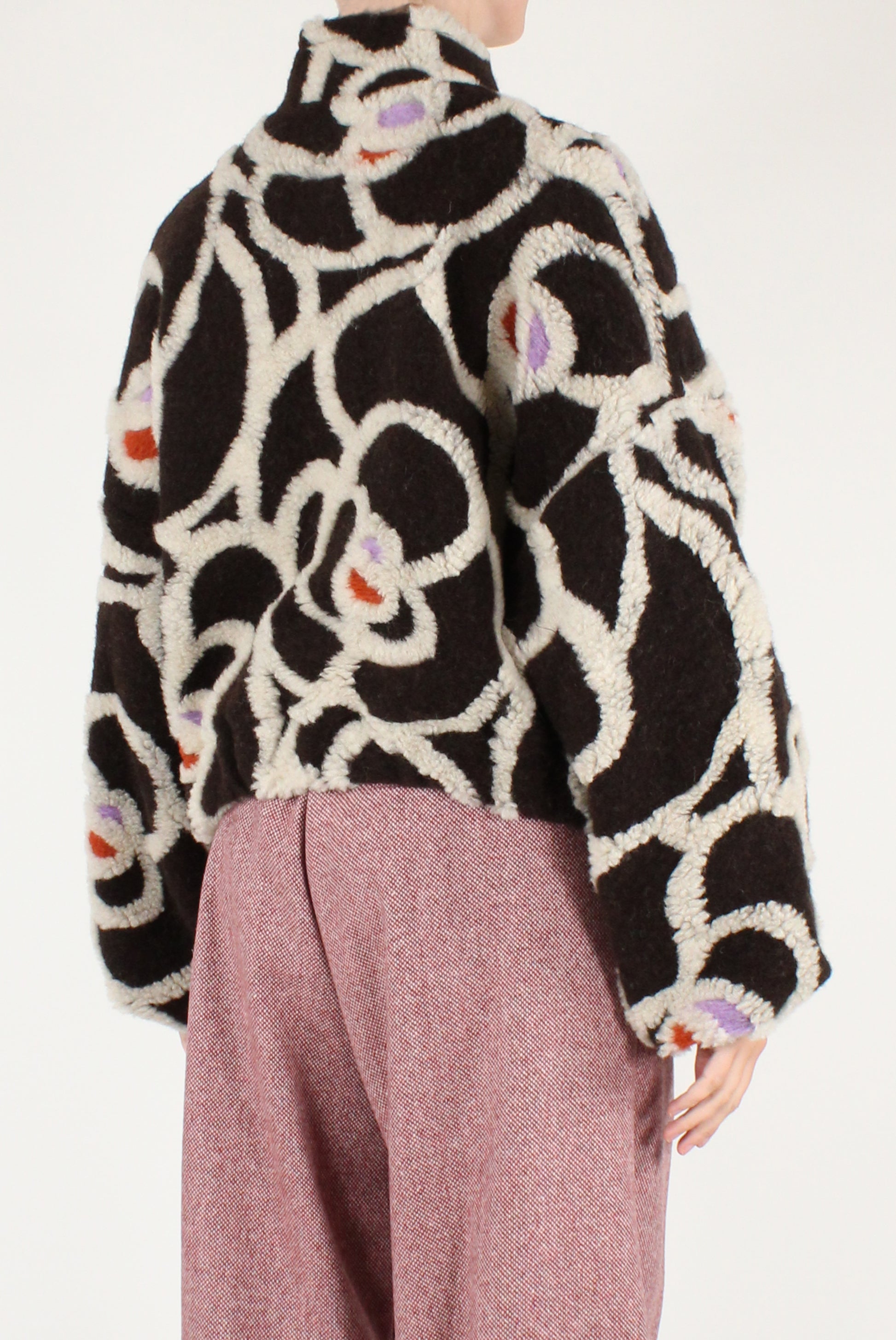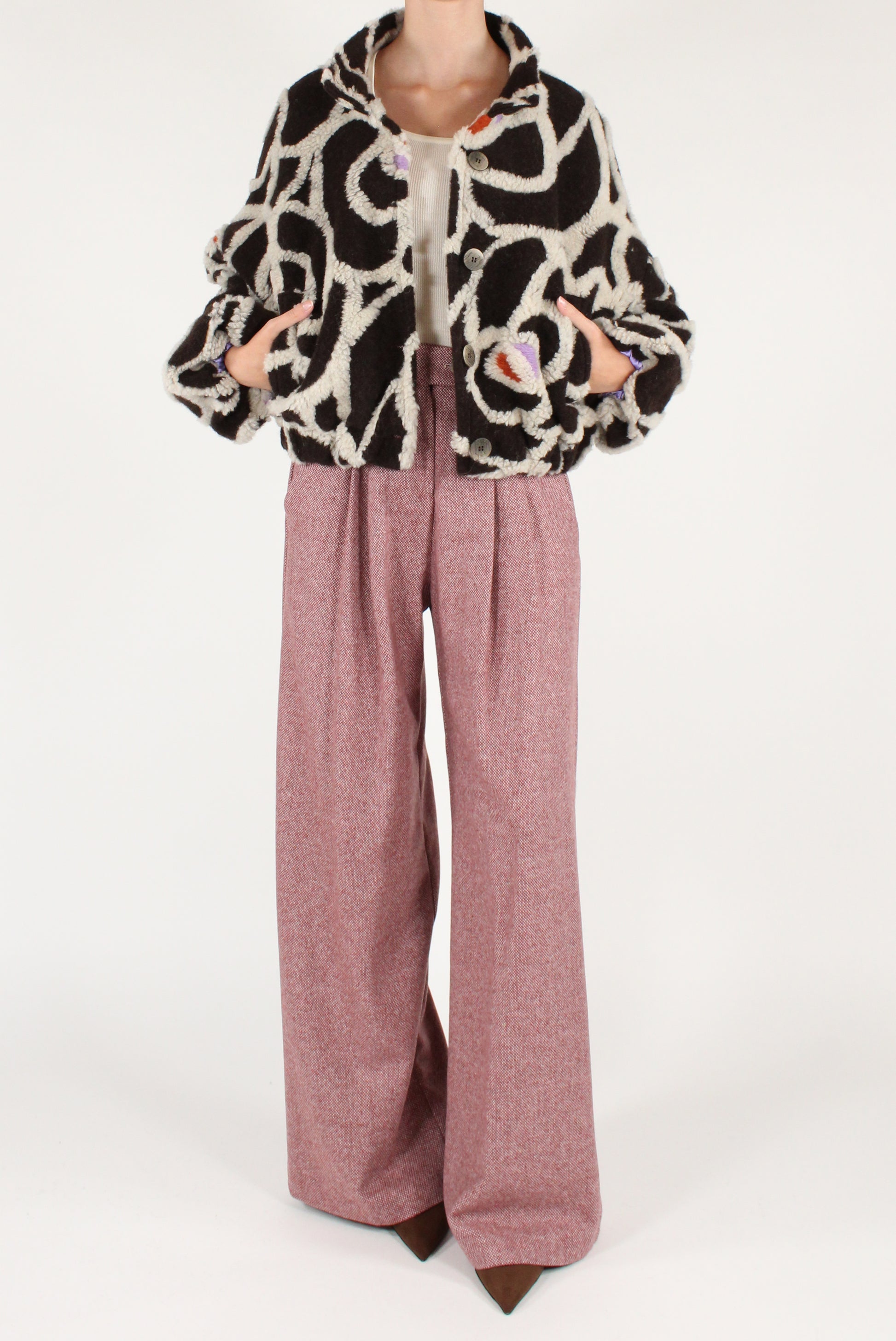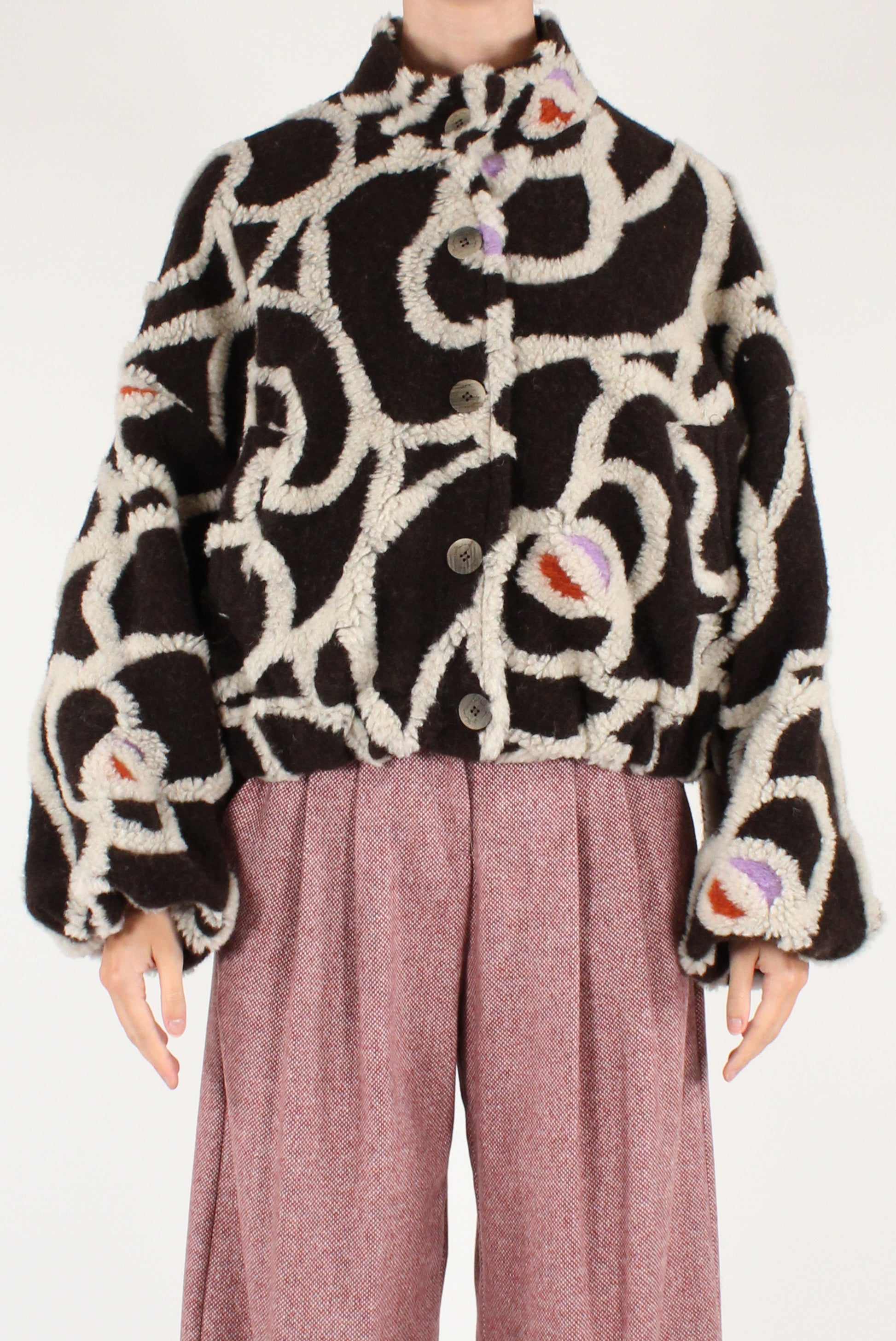 Bomber corto in misto lana a fantasia astratta. A maniche lunghe con allacciatura a bottoni, e dettaglio elastico ai polsi e in vita. Completamente foderato.