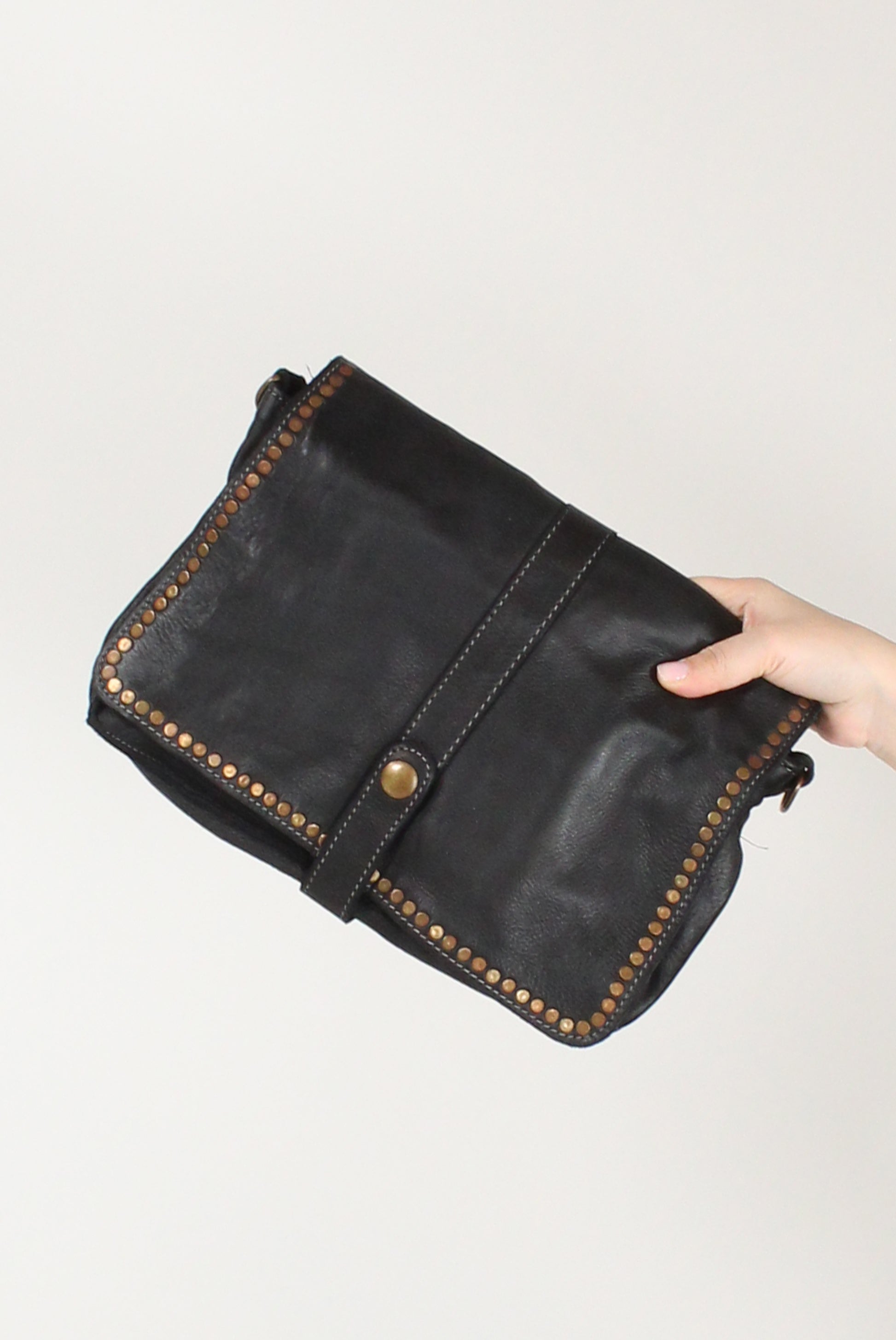 Bag with studded flap. Magnetic buckle closure, two internal compartments: one with an additional rounded flap. Two internal zip pockets. Also features a zip pocket on the back. Includes an adjustable shoulder strap and a removable handle. Dimensions: 24 x 31 x 7 cm.