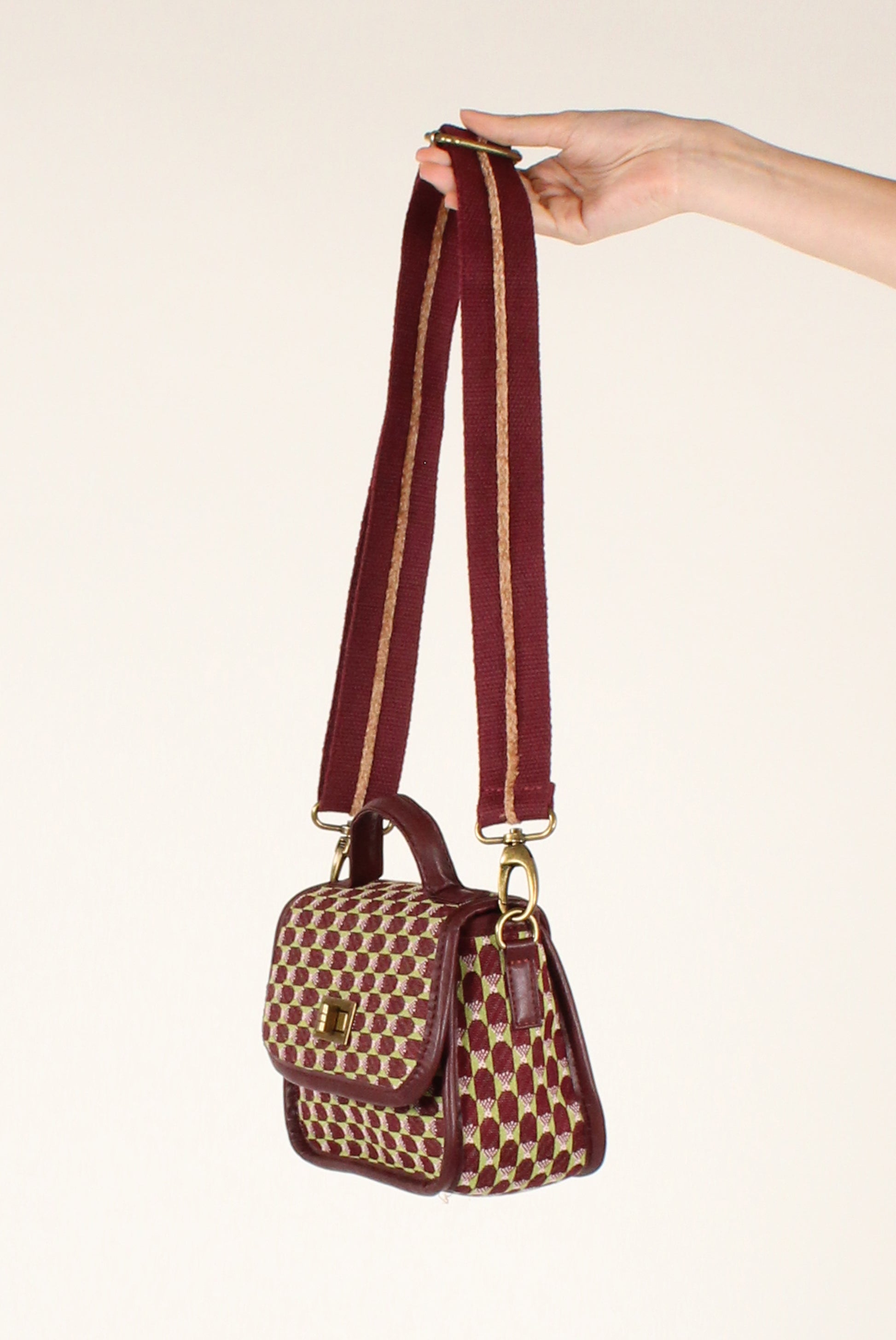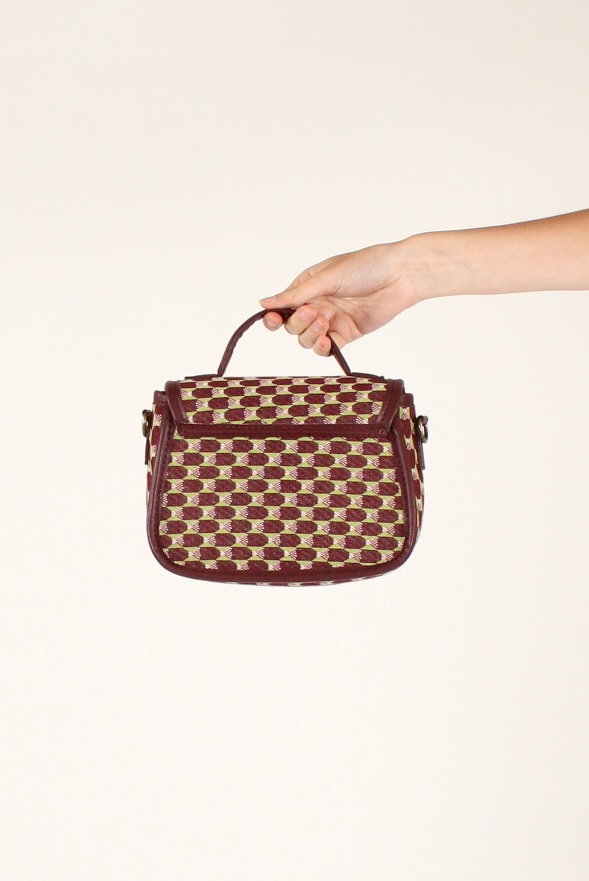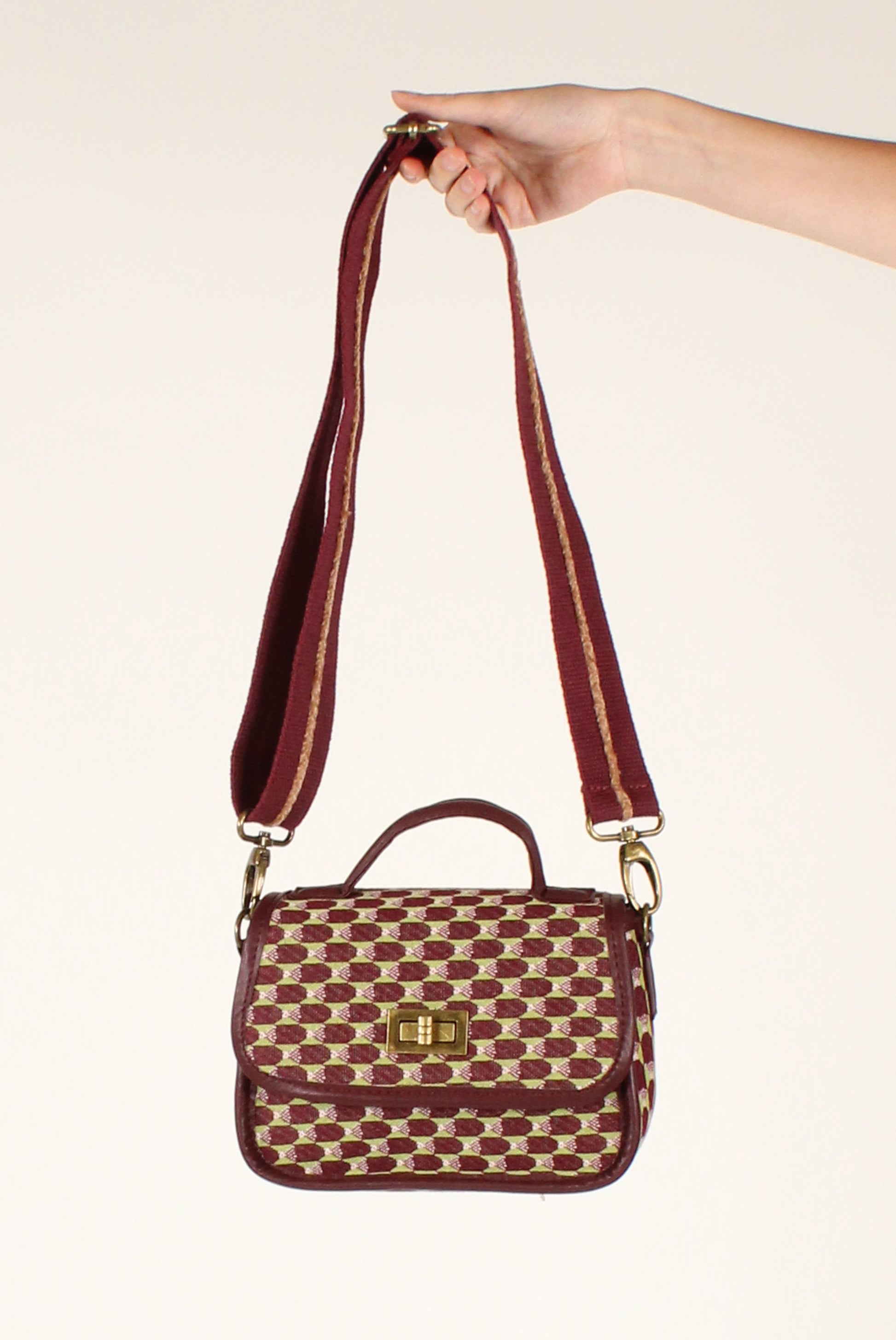 Borsetta a fantasia geometrica. Con manico e tracolla inclusa regolabile e removibile. Chiusura a girello con patta, taschina interna con zip. Dimensioni: 16x20x8 cm.