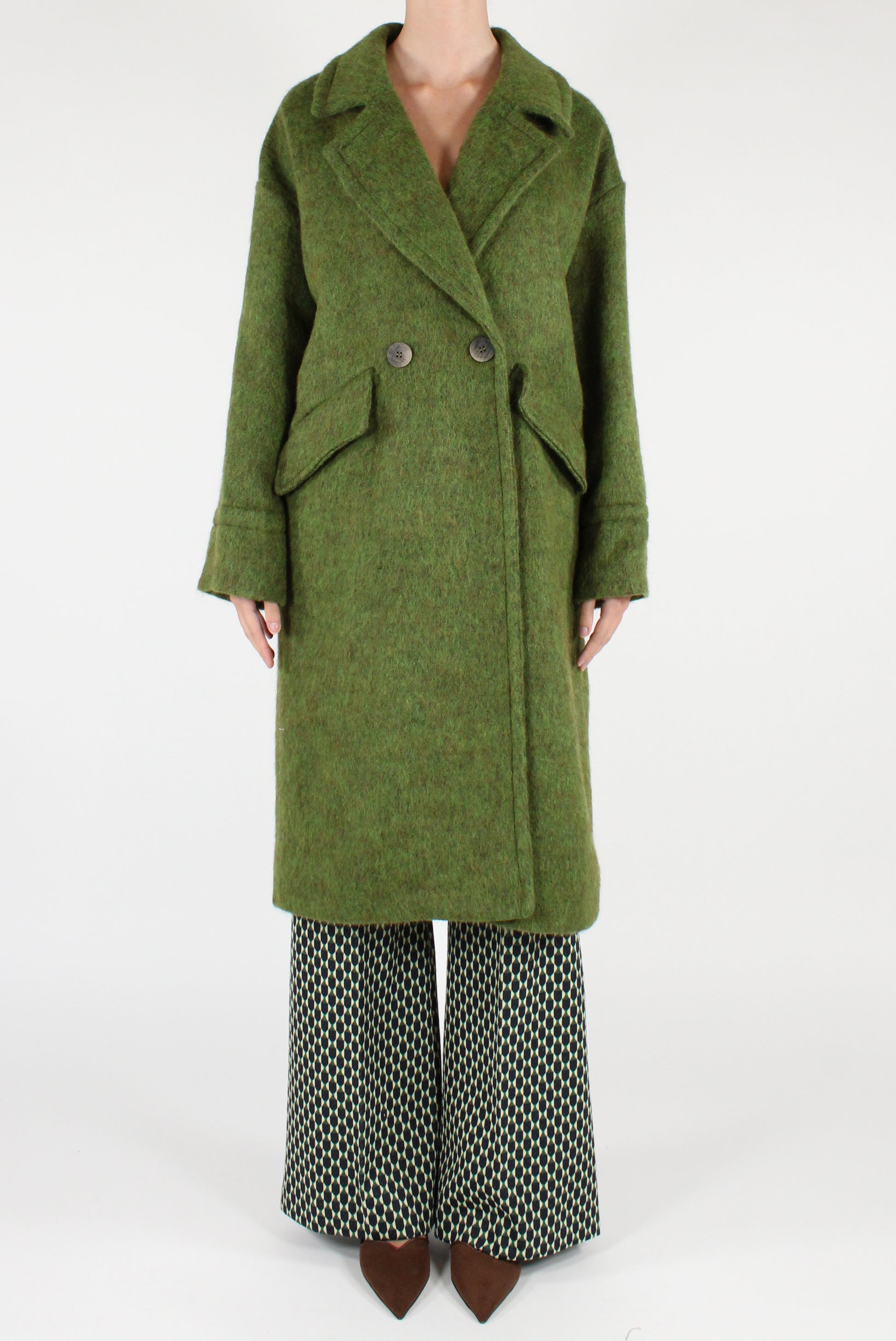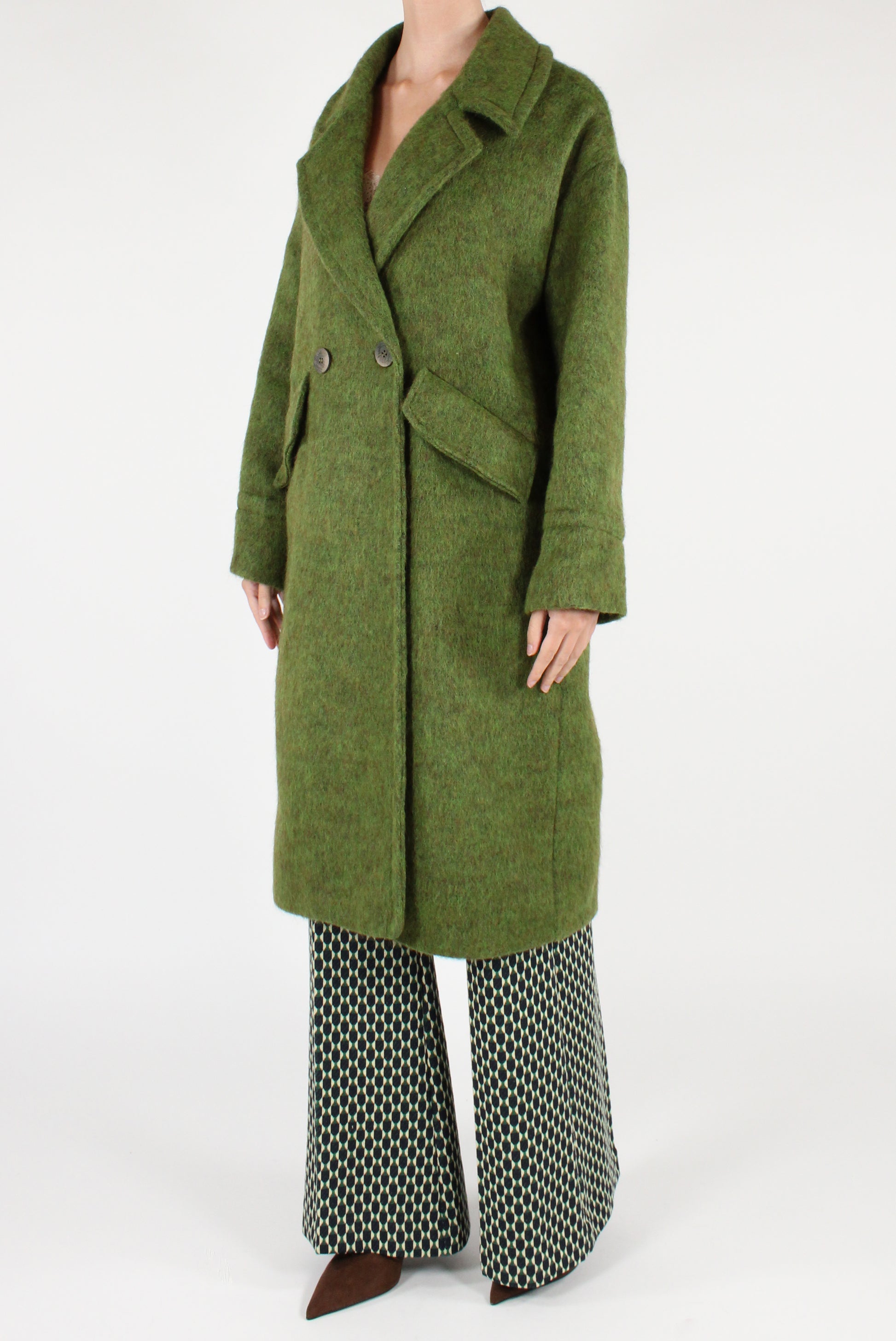 Double-breasted wool blend coat. Featuring wide lapels, dropped shoulders, button fastening, and flap pockets. Fully lined. Matching bag available.