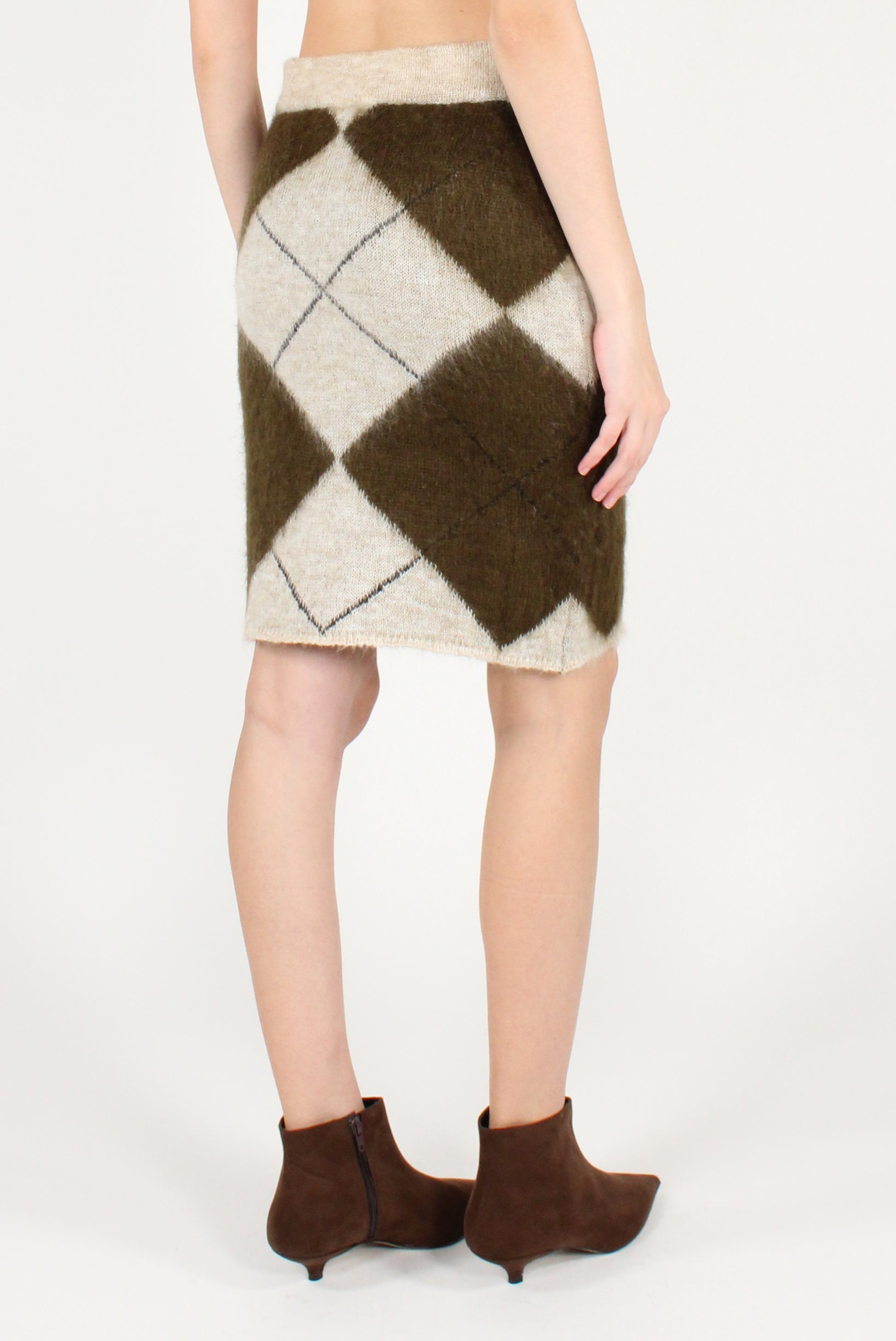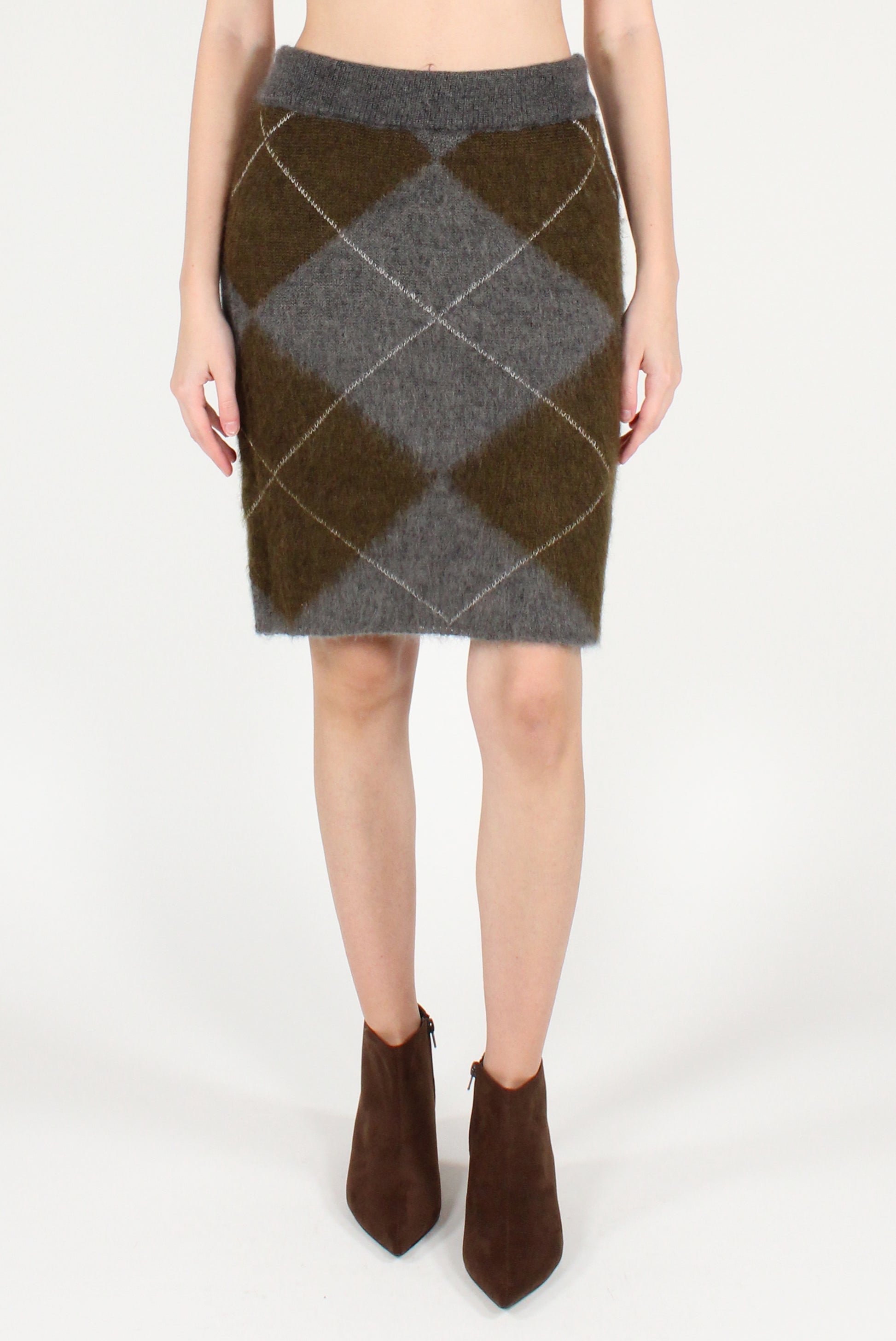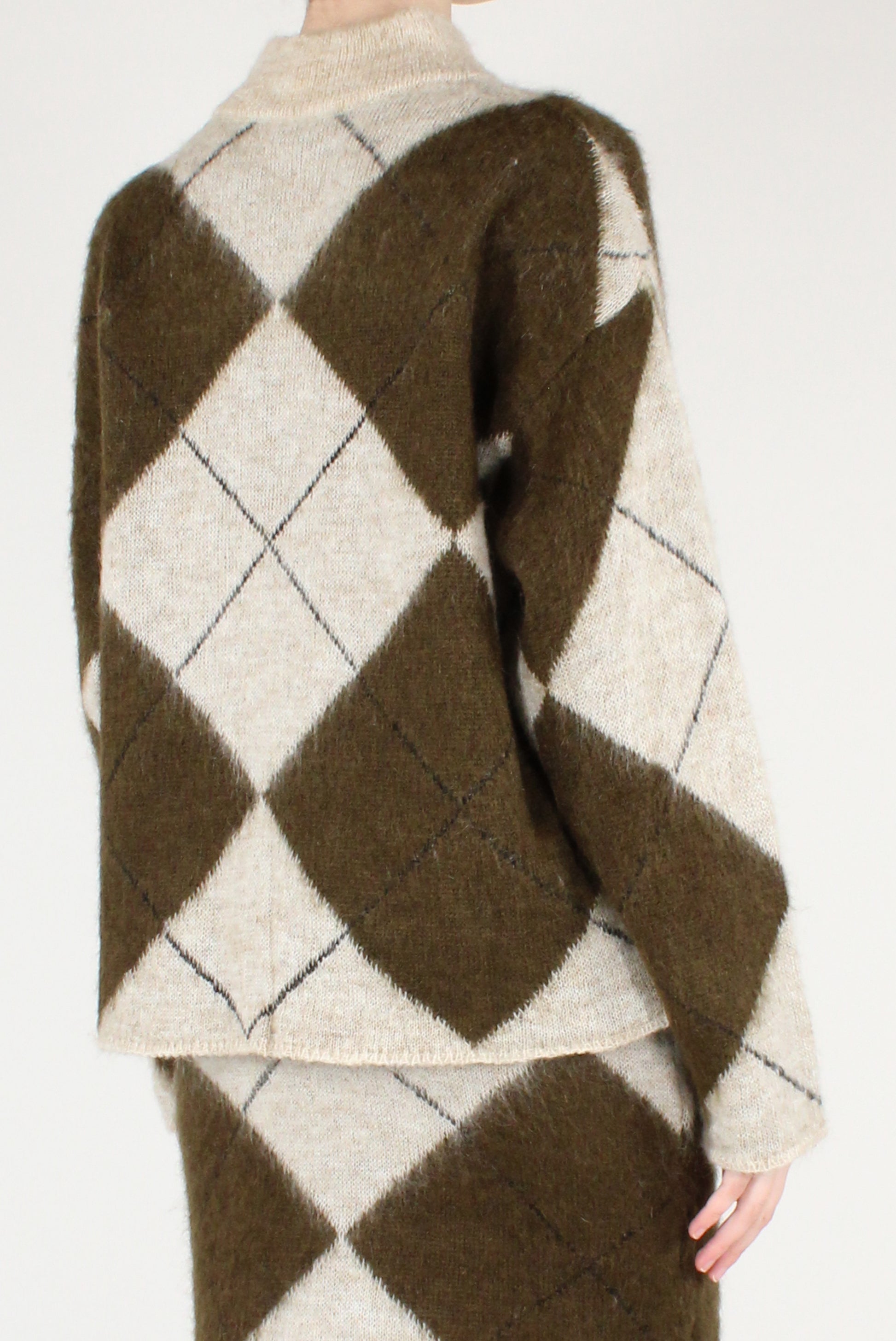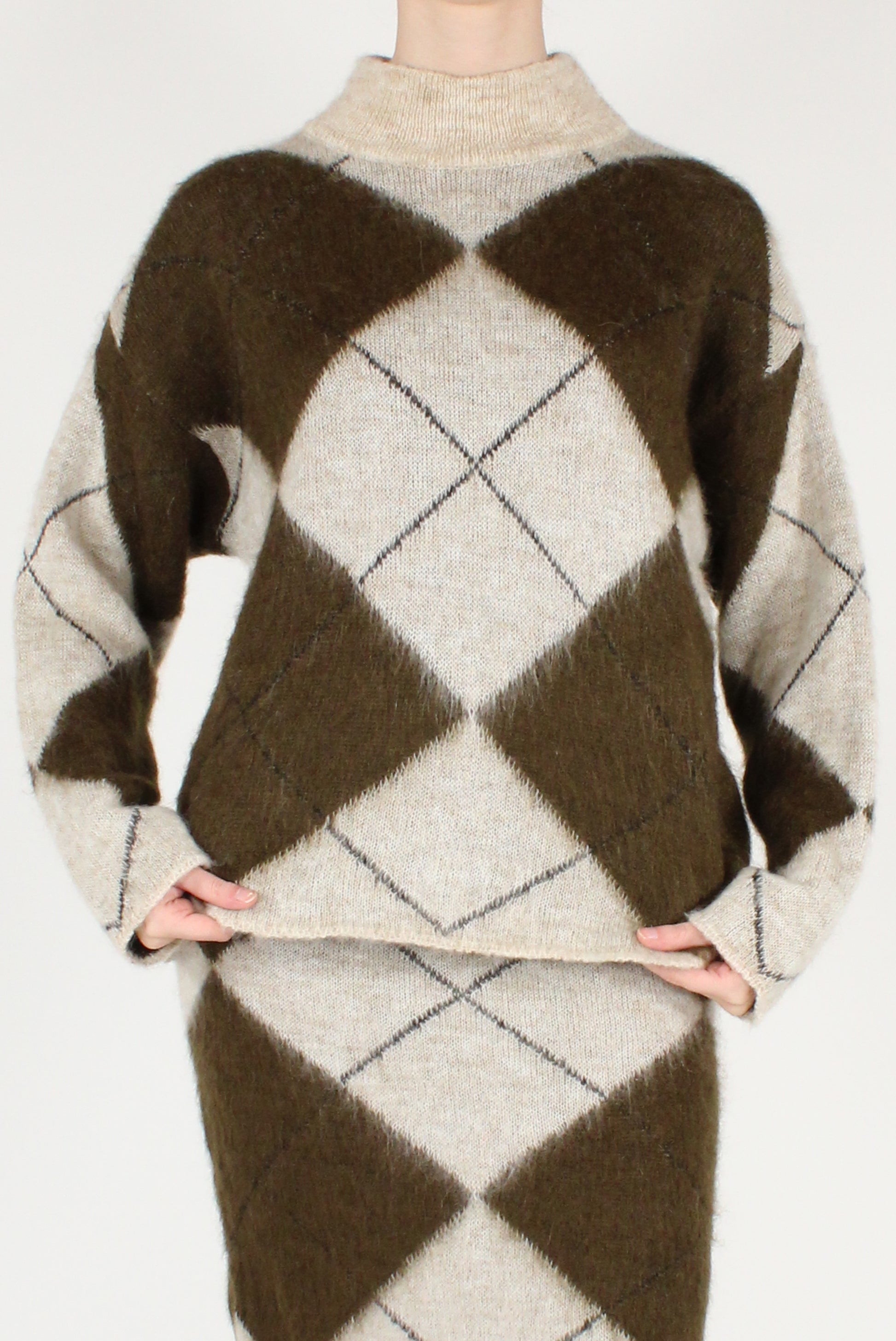 Completo in maglia misto mohair a rombi. Maglione a collo alto, a maniche lunghe e gonna lunga fino al ginocchio inclusa.