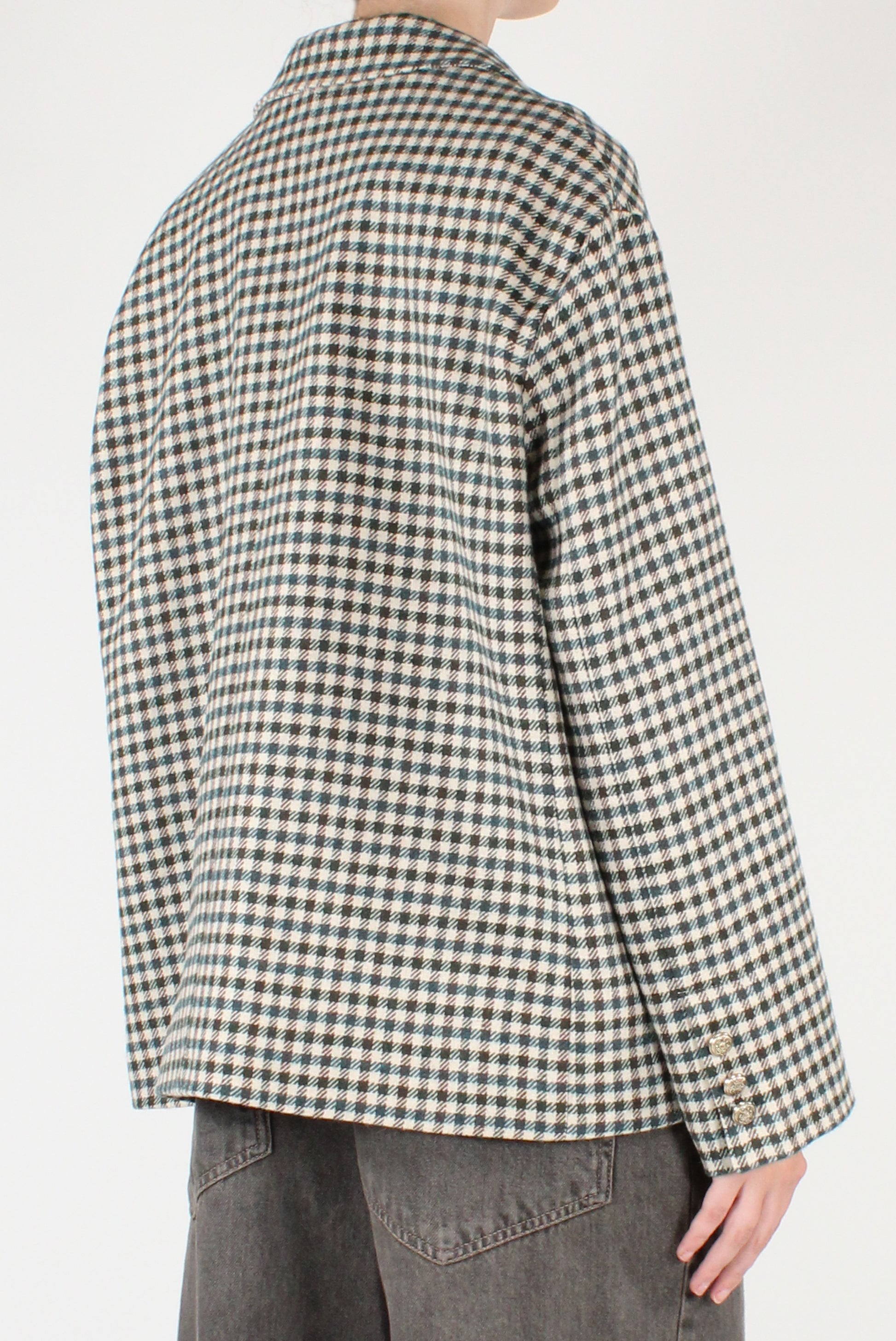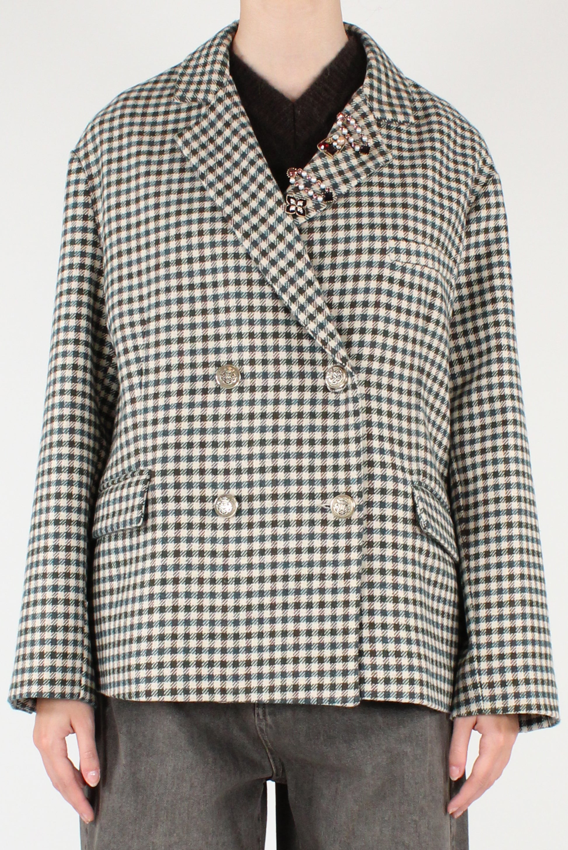 Giacca doppiopetto over a quadretti con spille incluse variabili e removibili. Revers classici, allacciatura a bottoni con stemma, con tasche a patta, dettaglio finta tasca a filetto davanti a sinistra e bottoni applicati ai polsi. In misto lana, completamente foderata.
