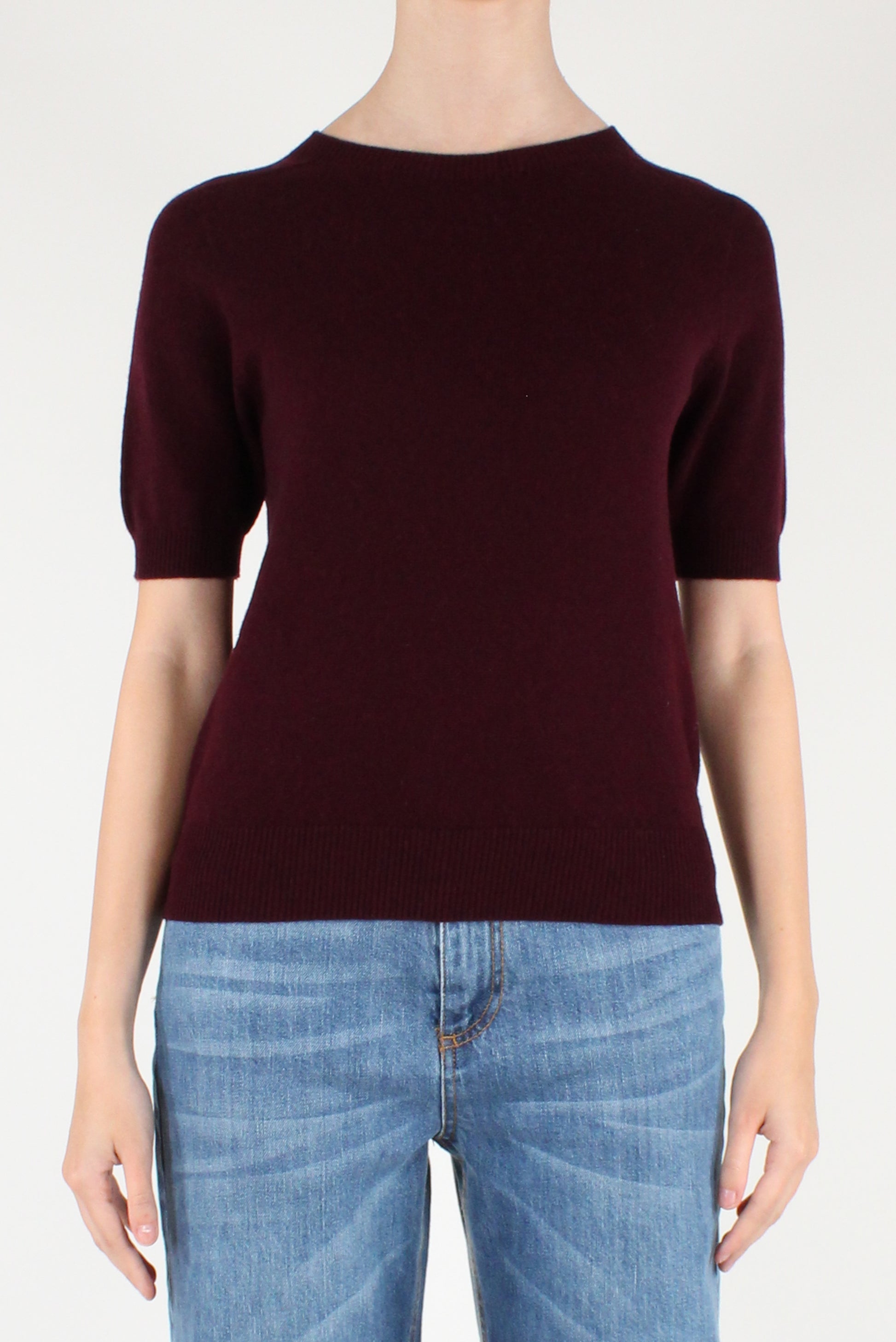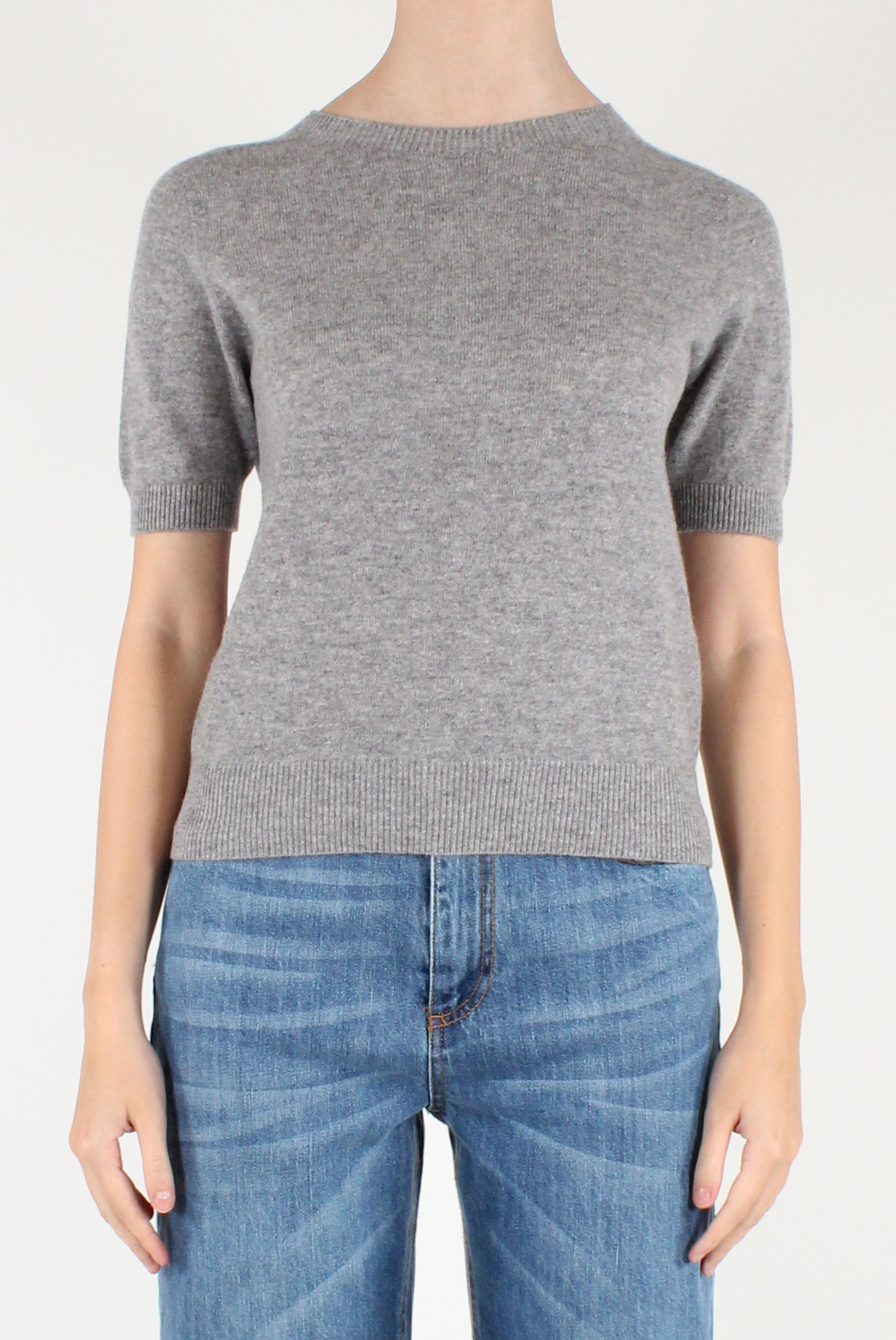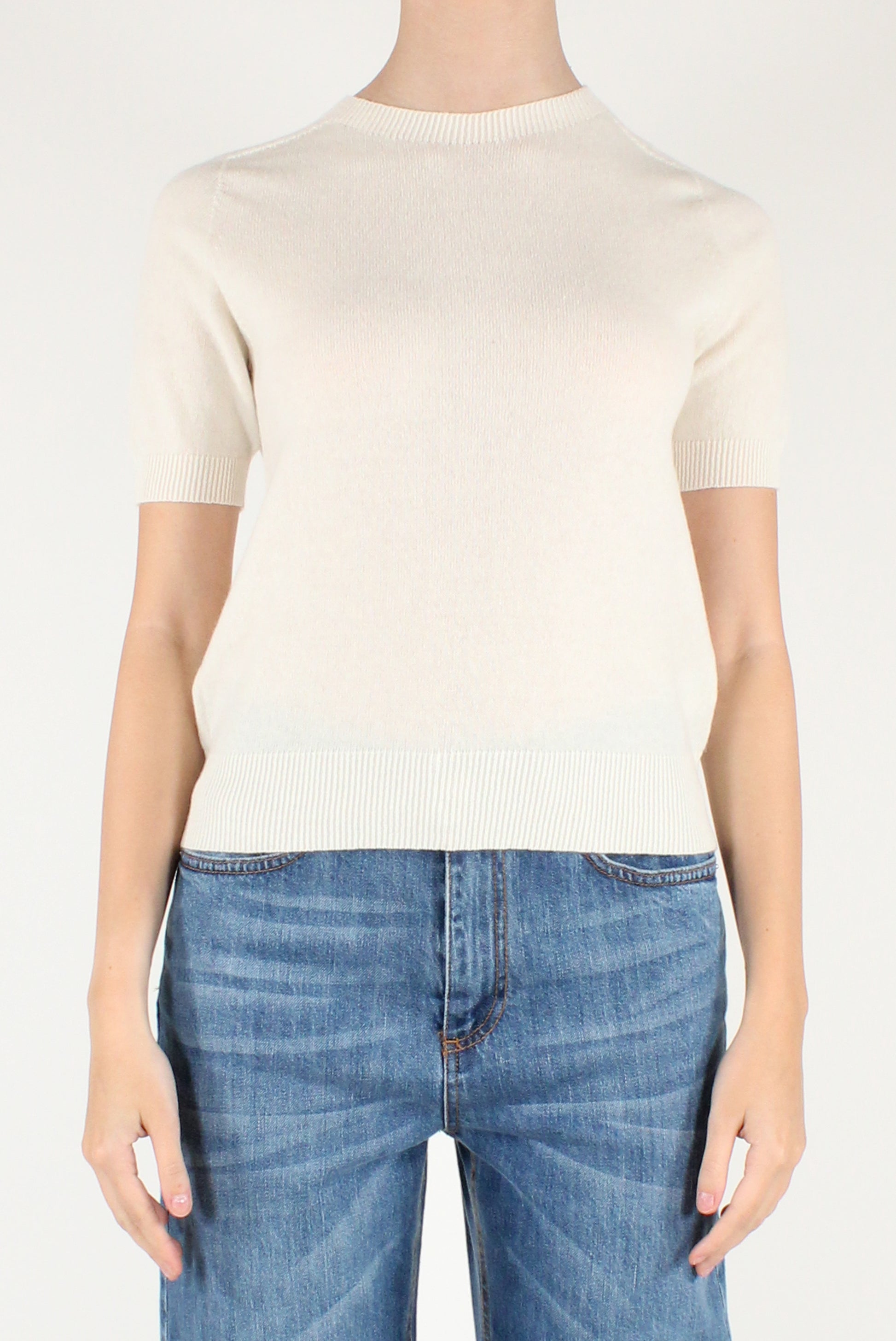 Maglia in pura lana a maniche corte. Girocollo, con dettaglio profili a costine. Cardigan coordinato disponibile.