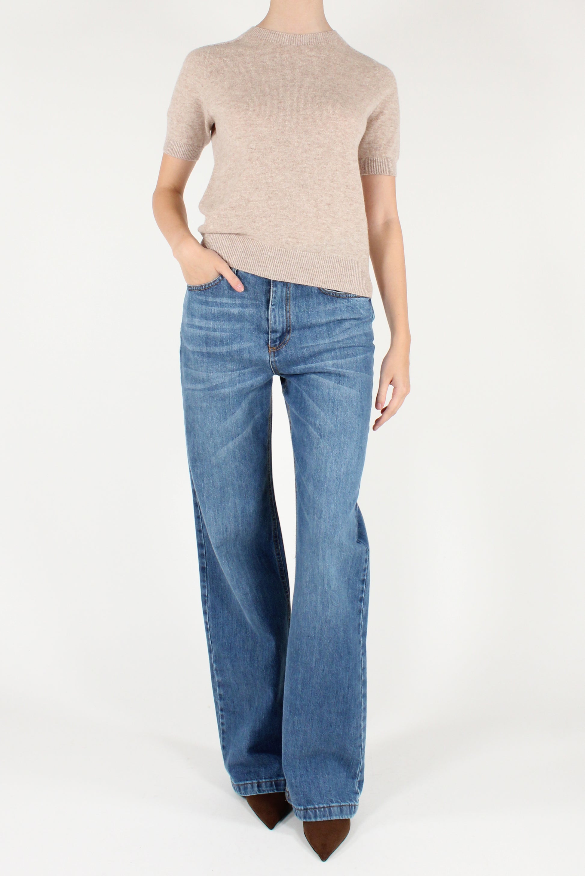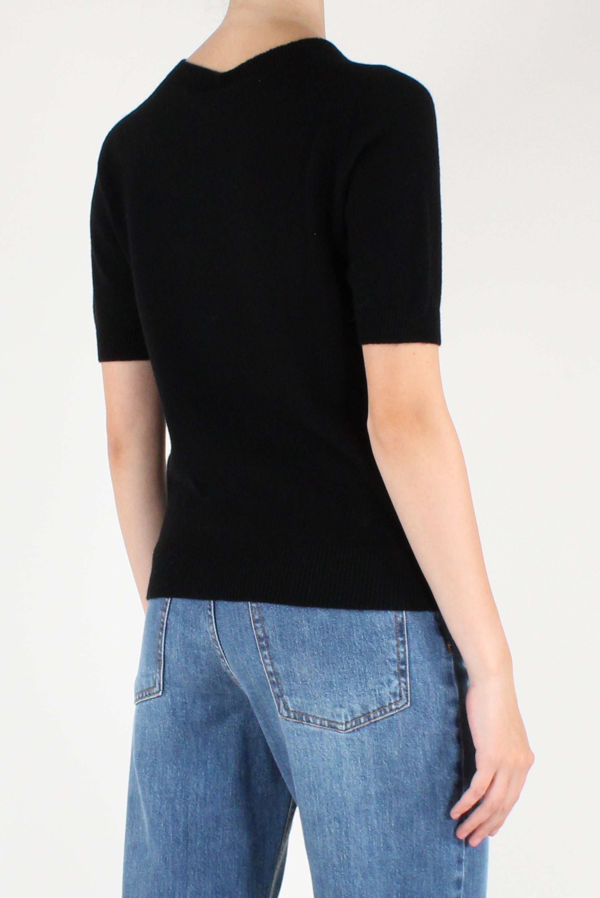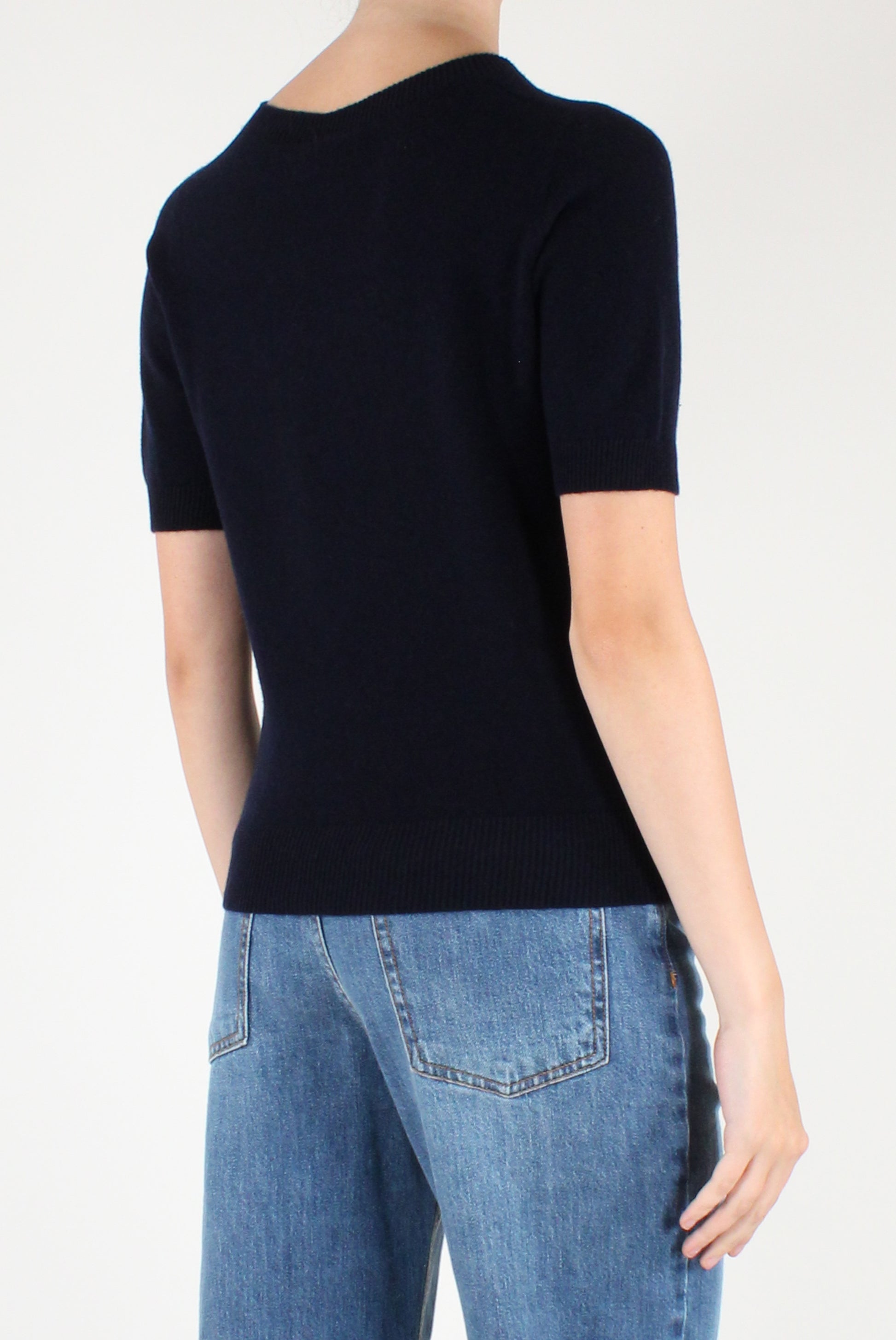 Maglia in pura lana a maniche corte. Girocollo, con dettaglio profili a costine. Cardigan coordinato disponibile.