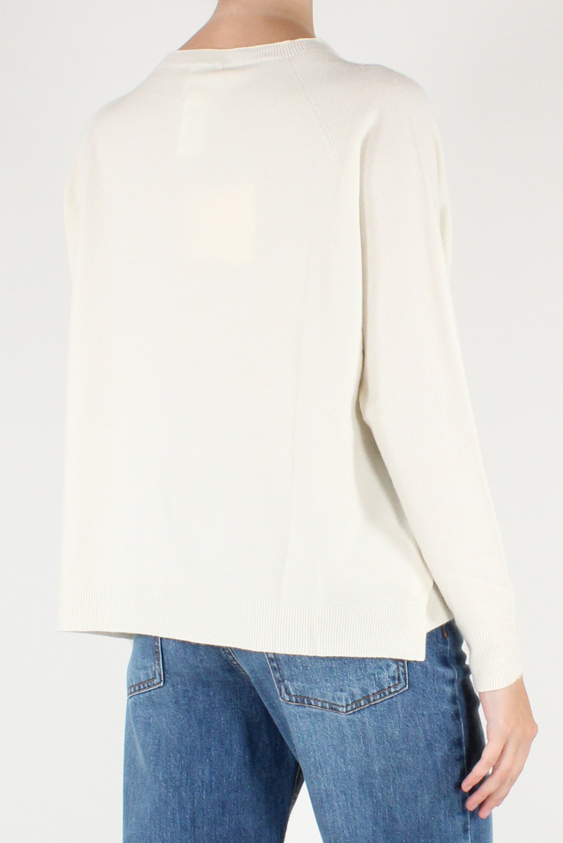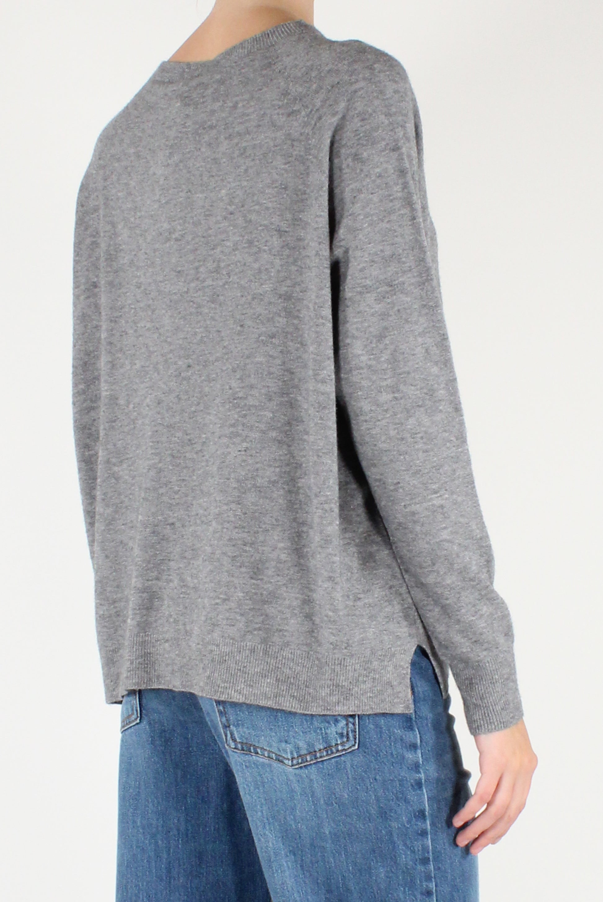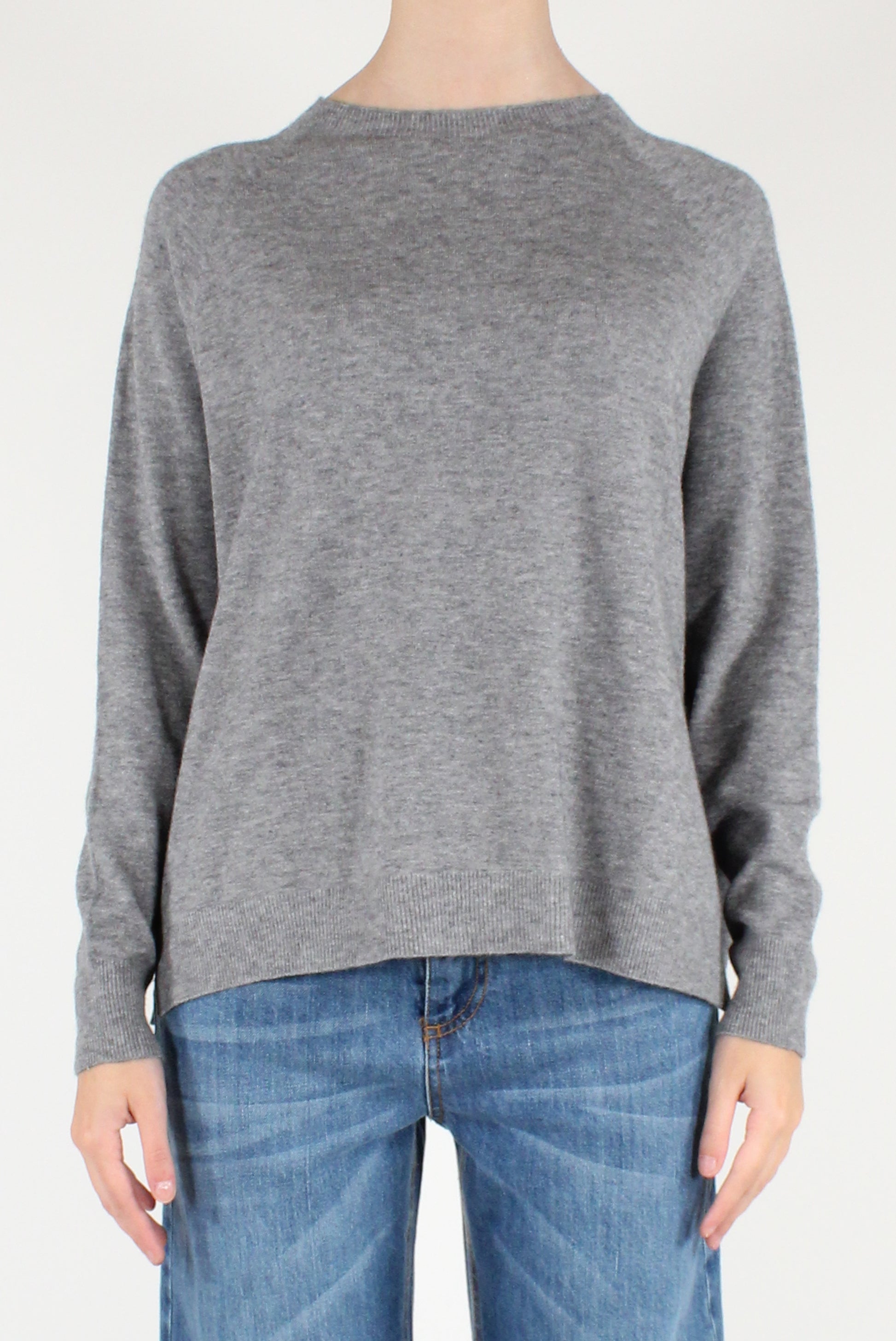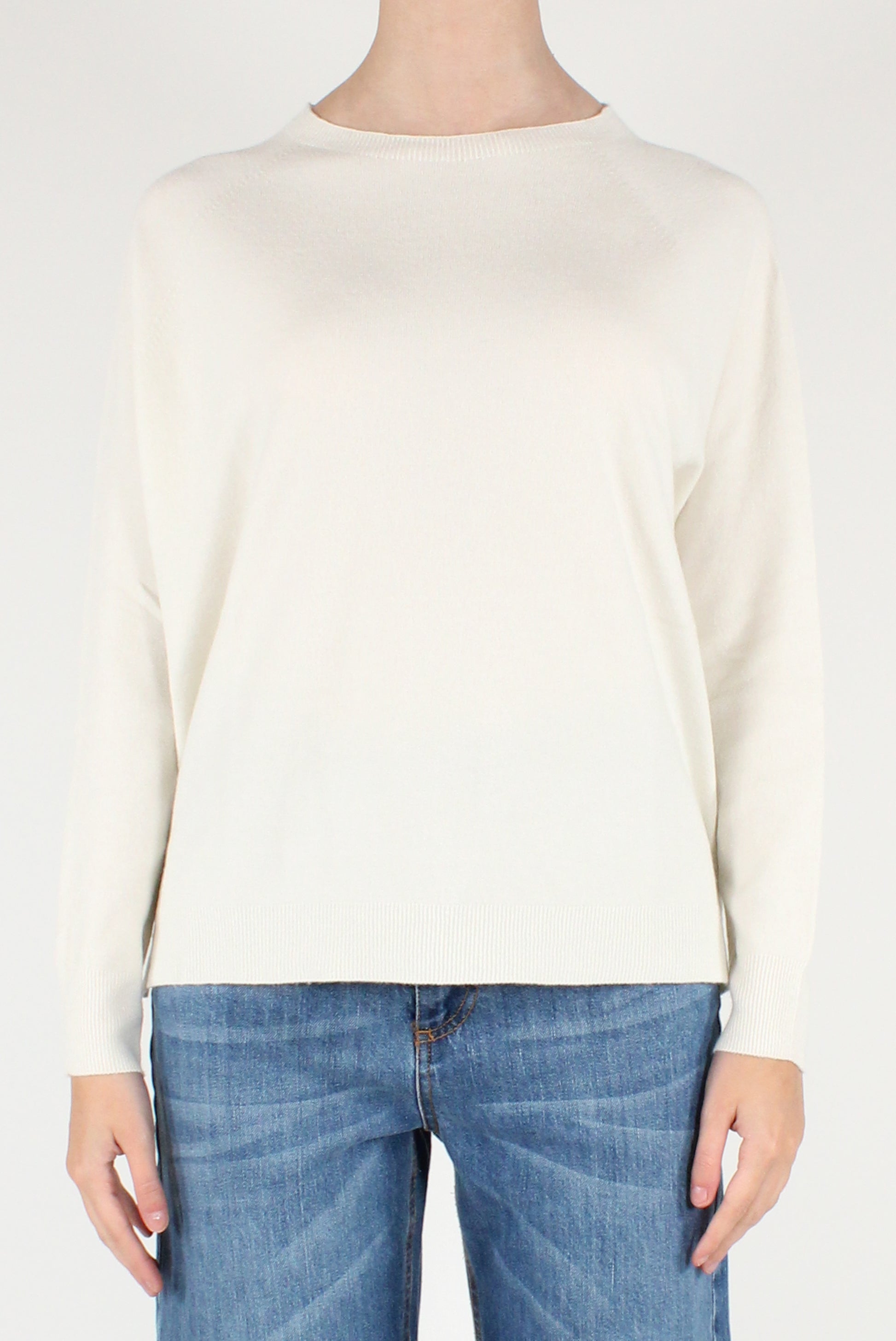 Maglioncino scollo tondo in misto viscosa. Modello a scatola, a maniche lunghe con dettaglio profili a costine e spacchetti laterali.