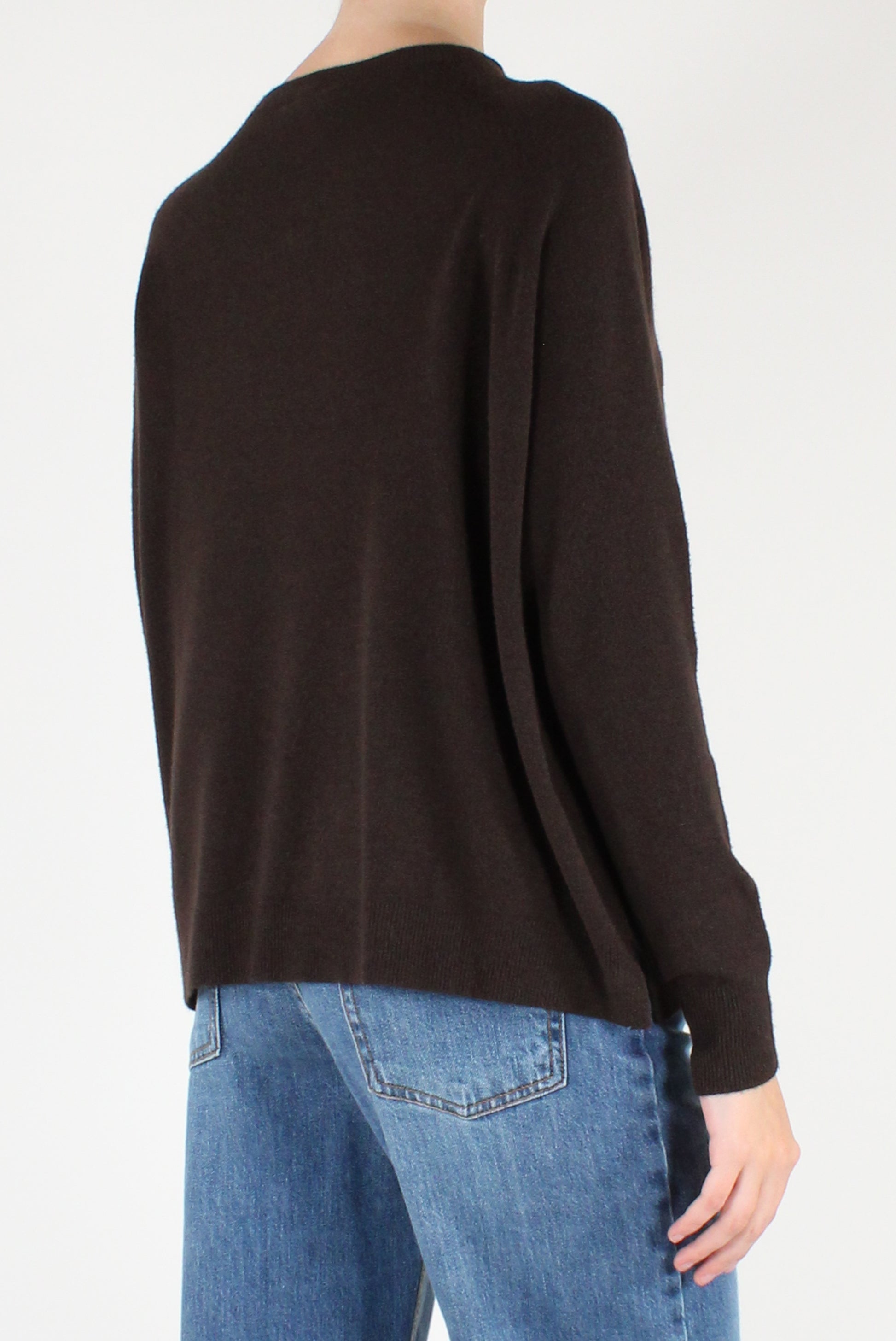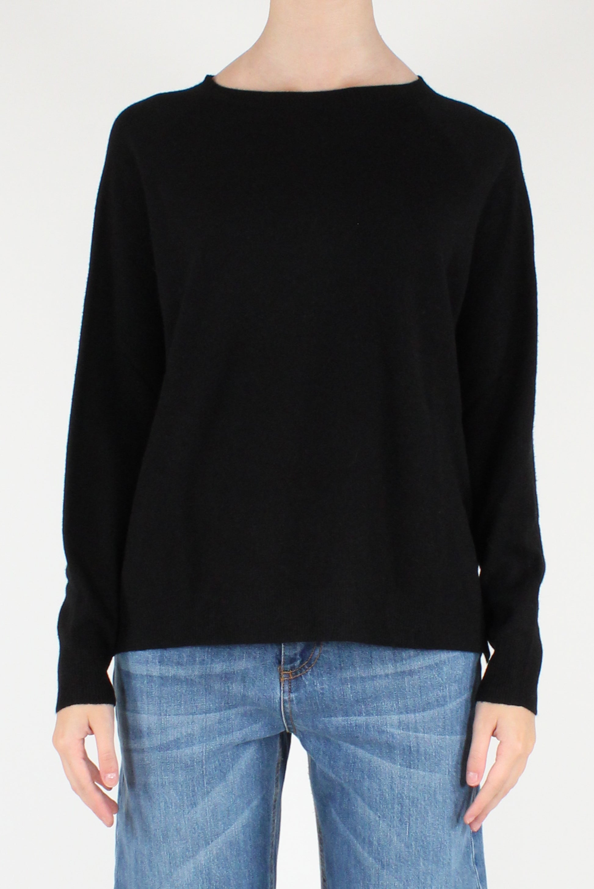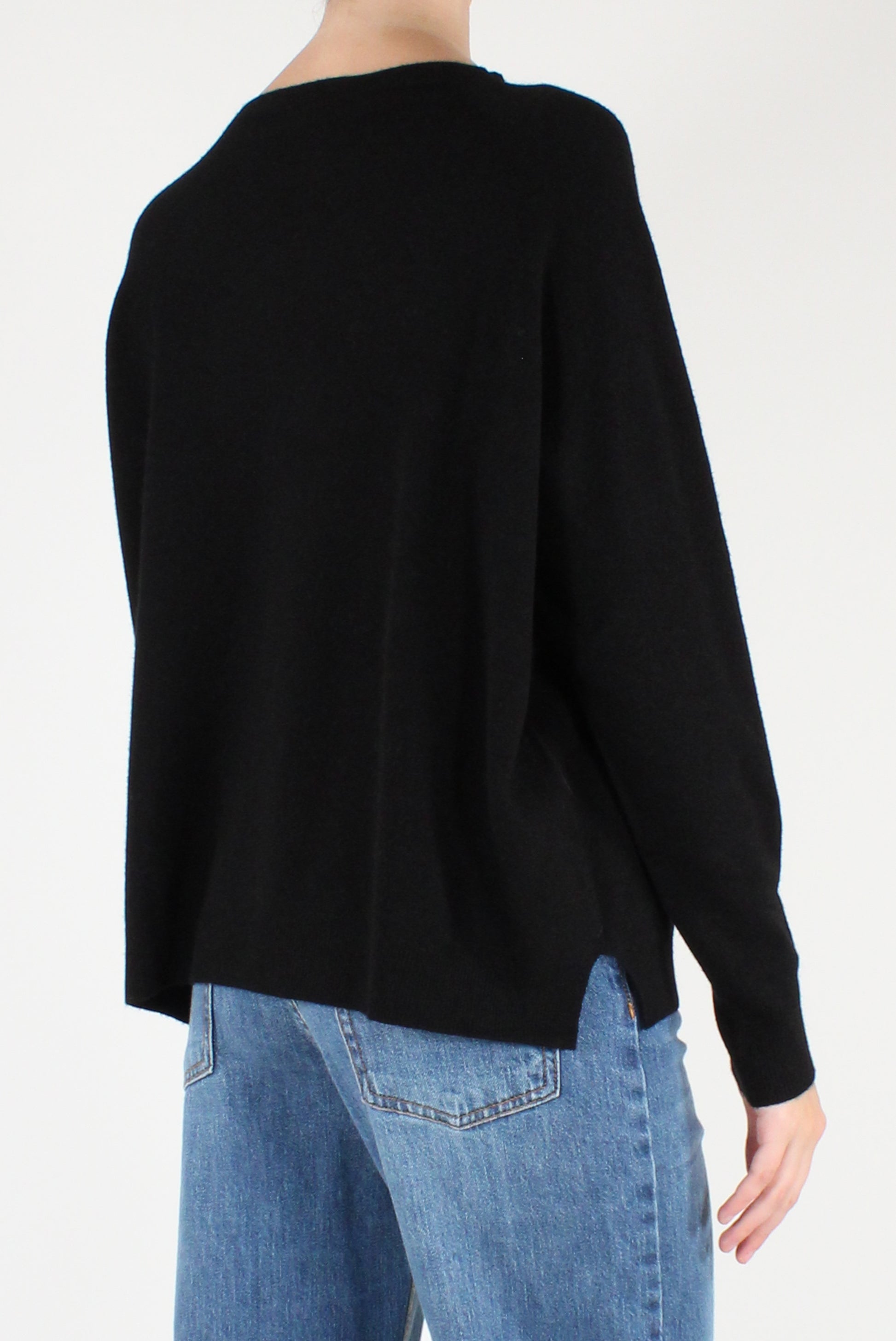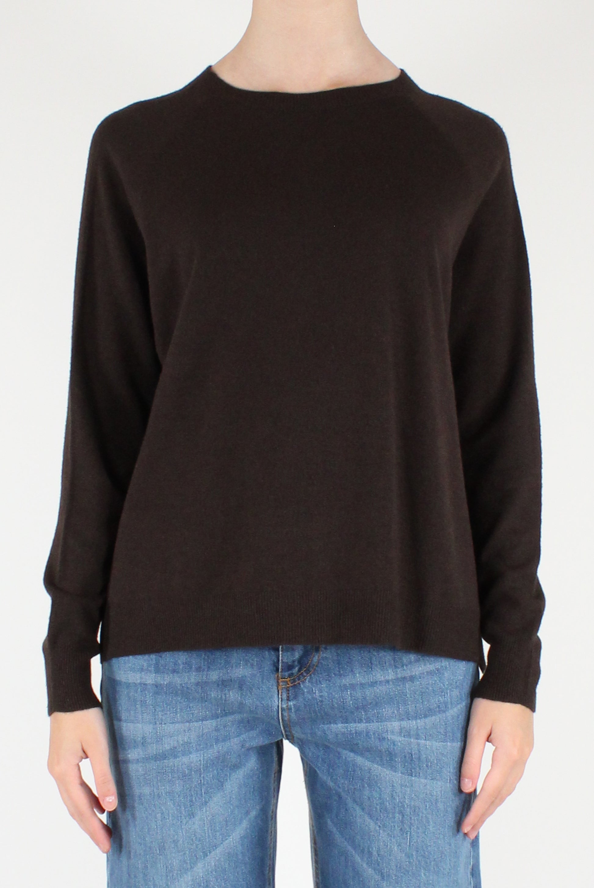Maglioncino scollo tondo in misto viscosa. Modello a scatola, a maniche lunghe con dettaglio profili a costine e spacchetti laterali.