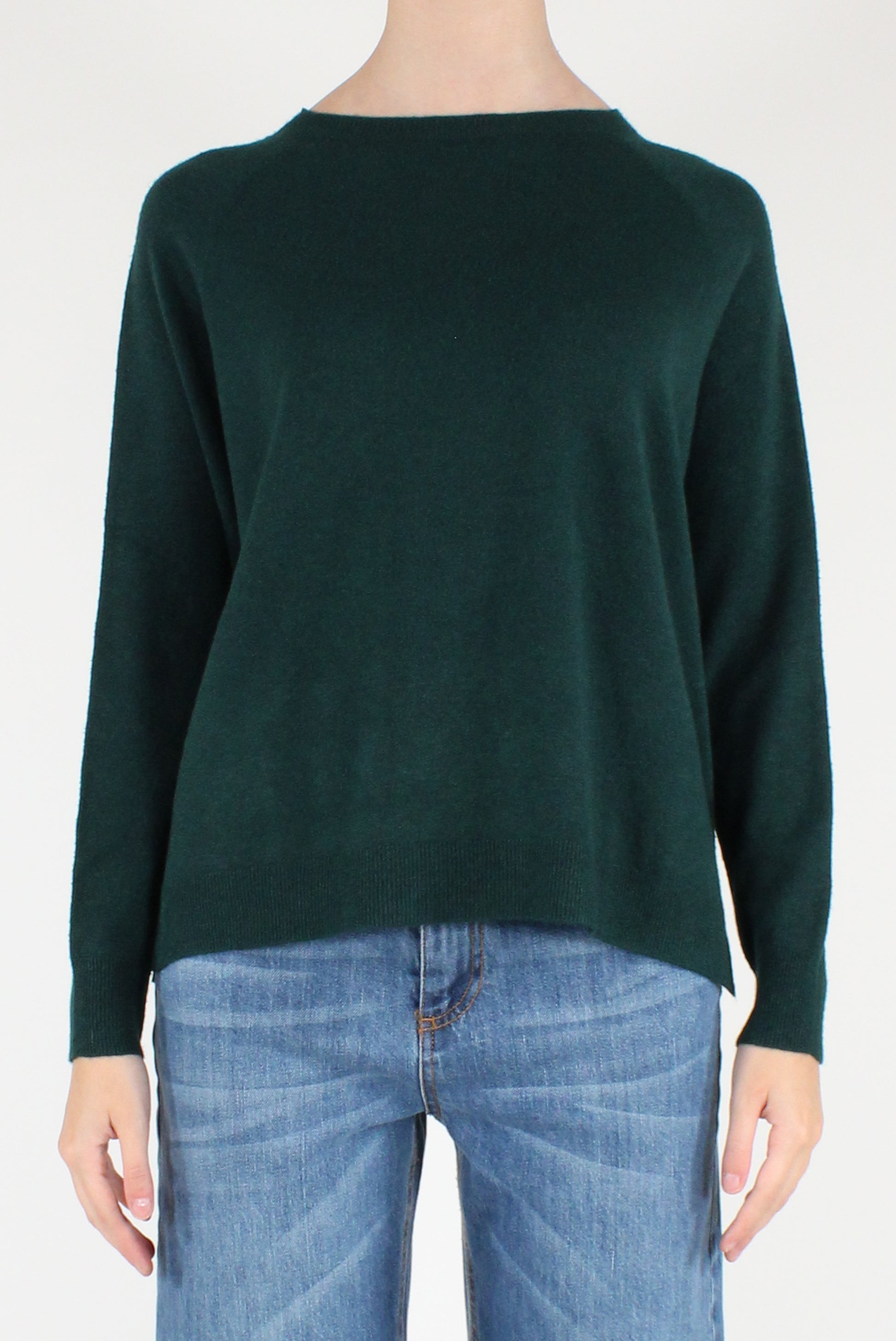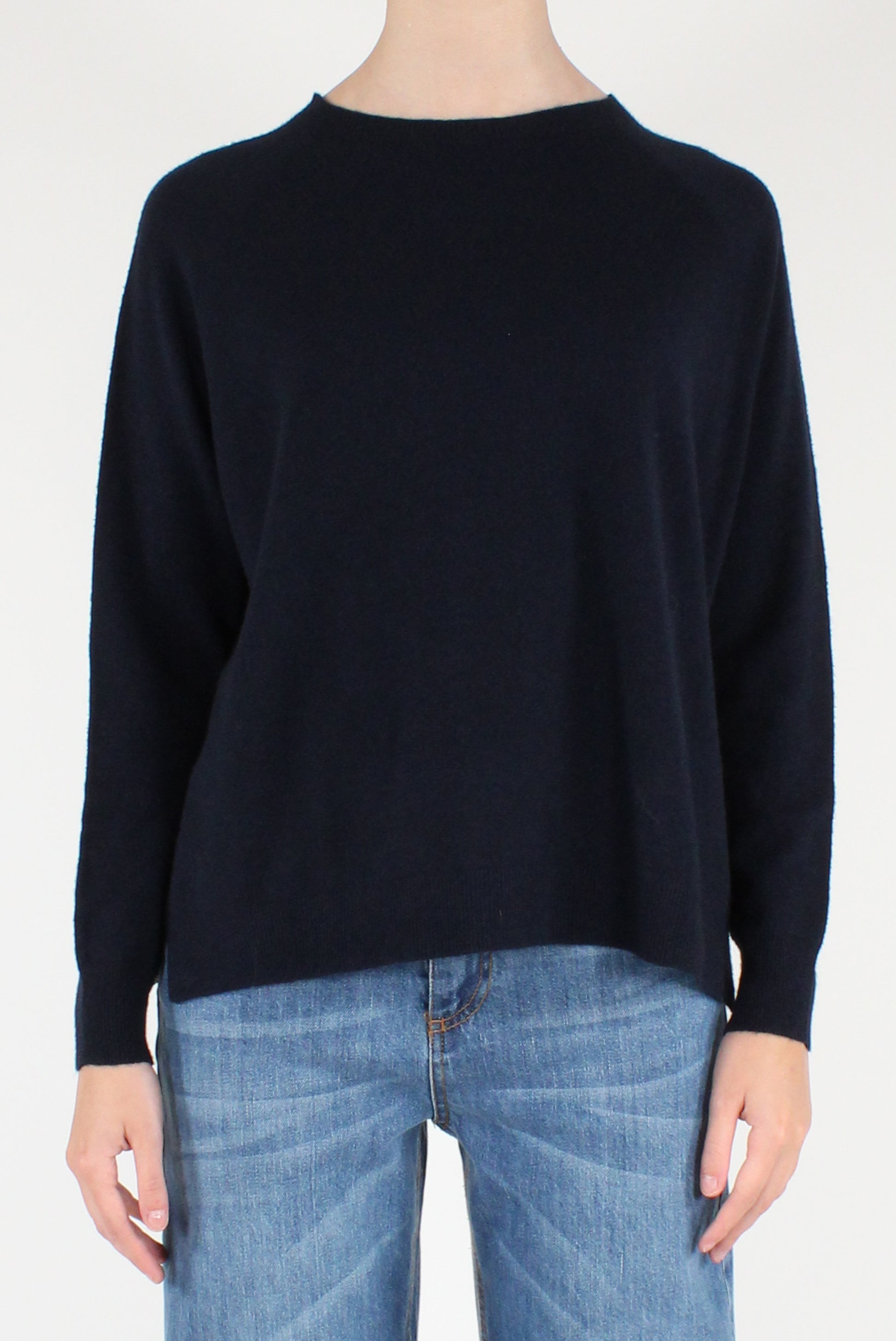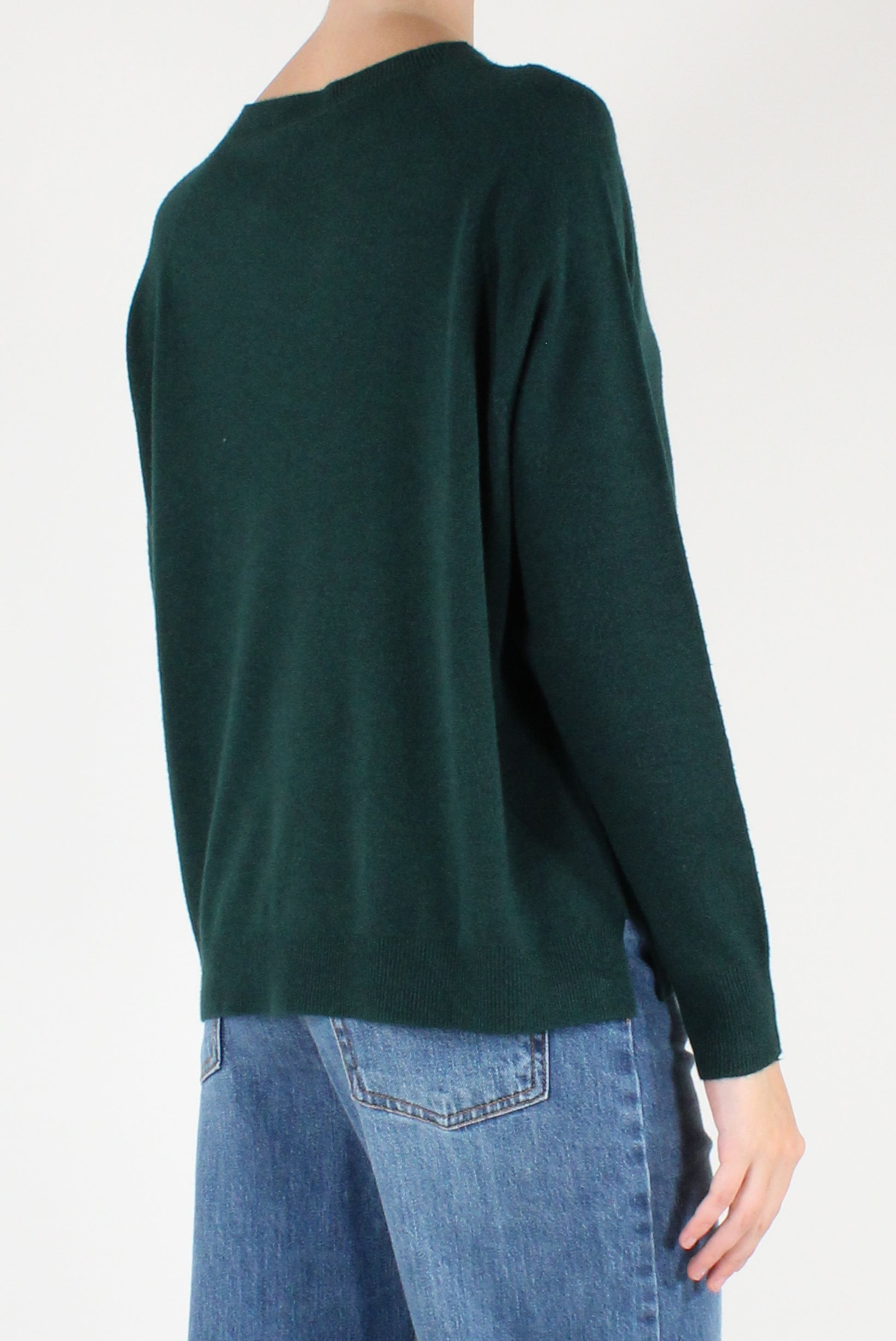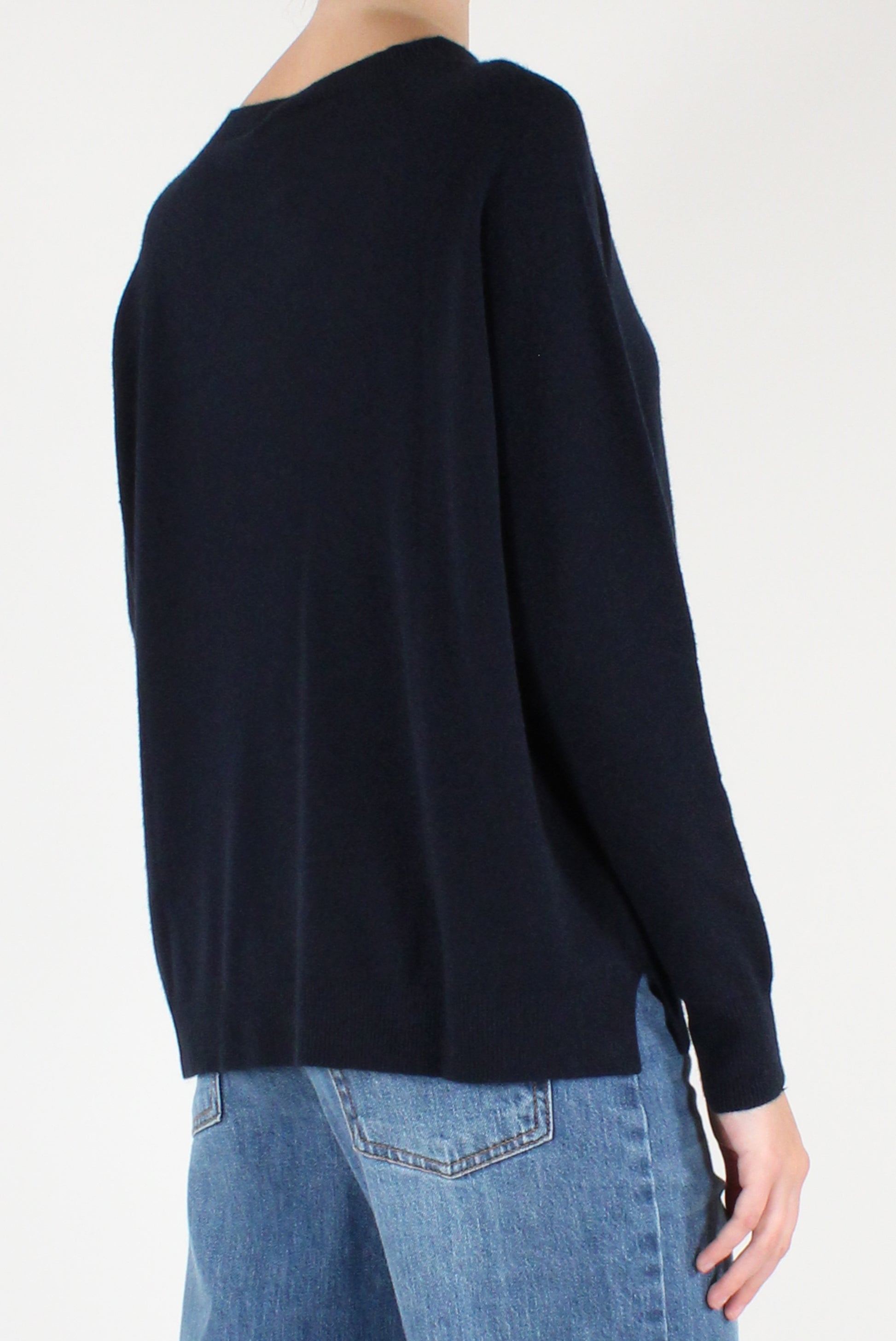 Maglioncino scollo tondo in misto viscosa. Modello a scatola, a maniche lunghe con dettaglio profili a costine e spacchetti laterali.