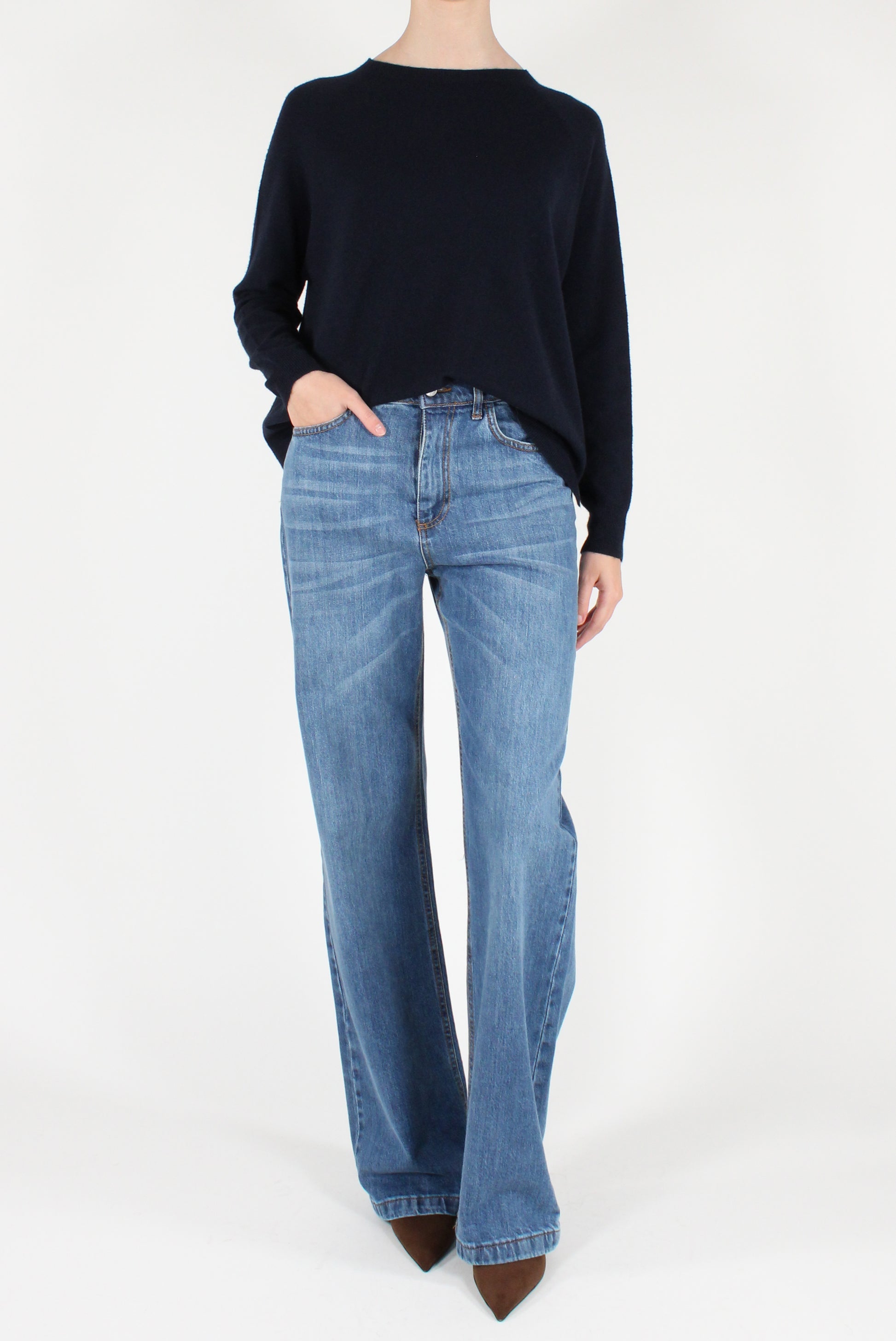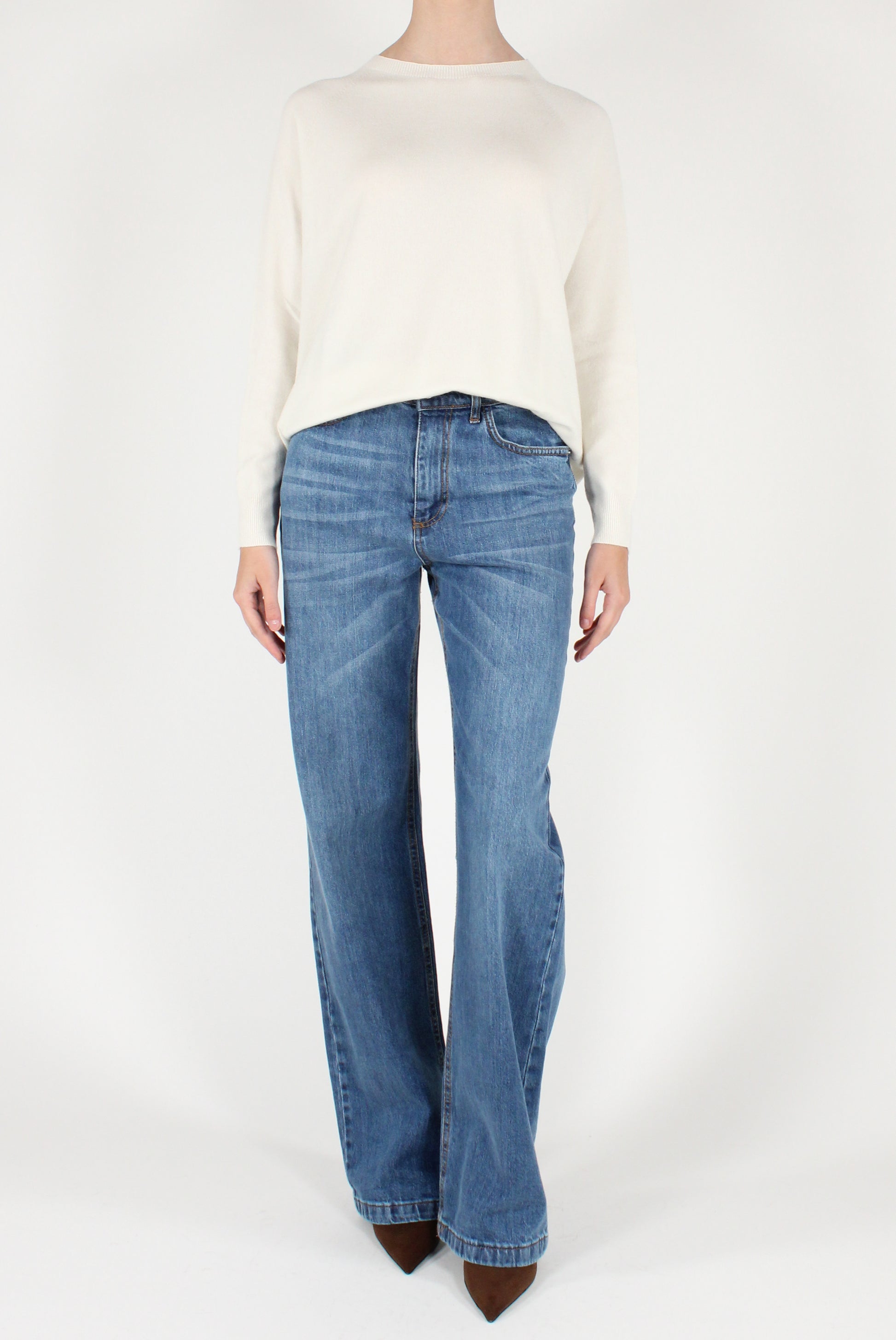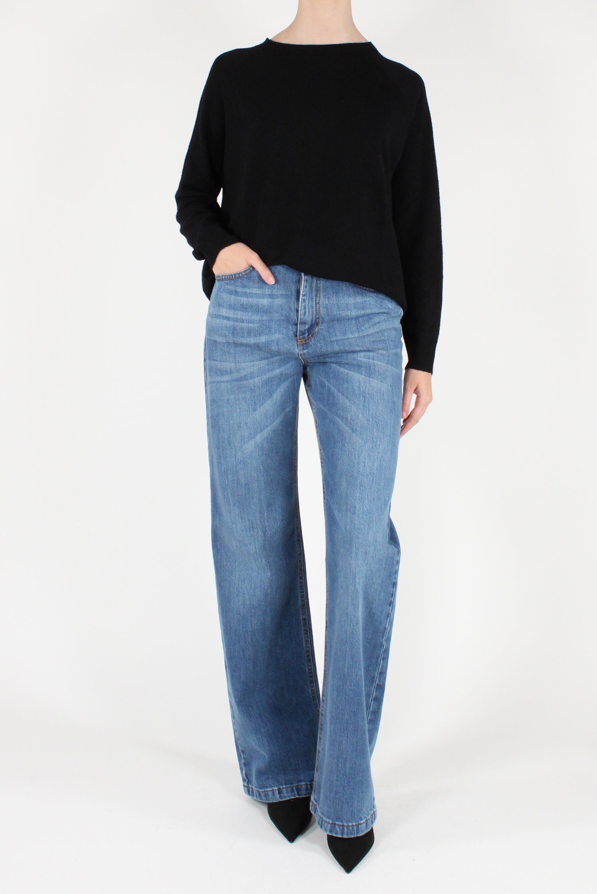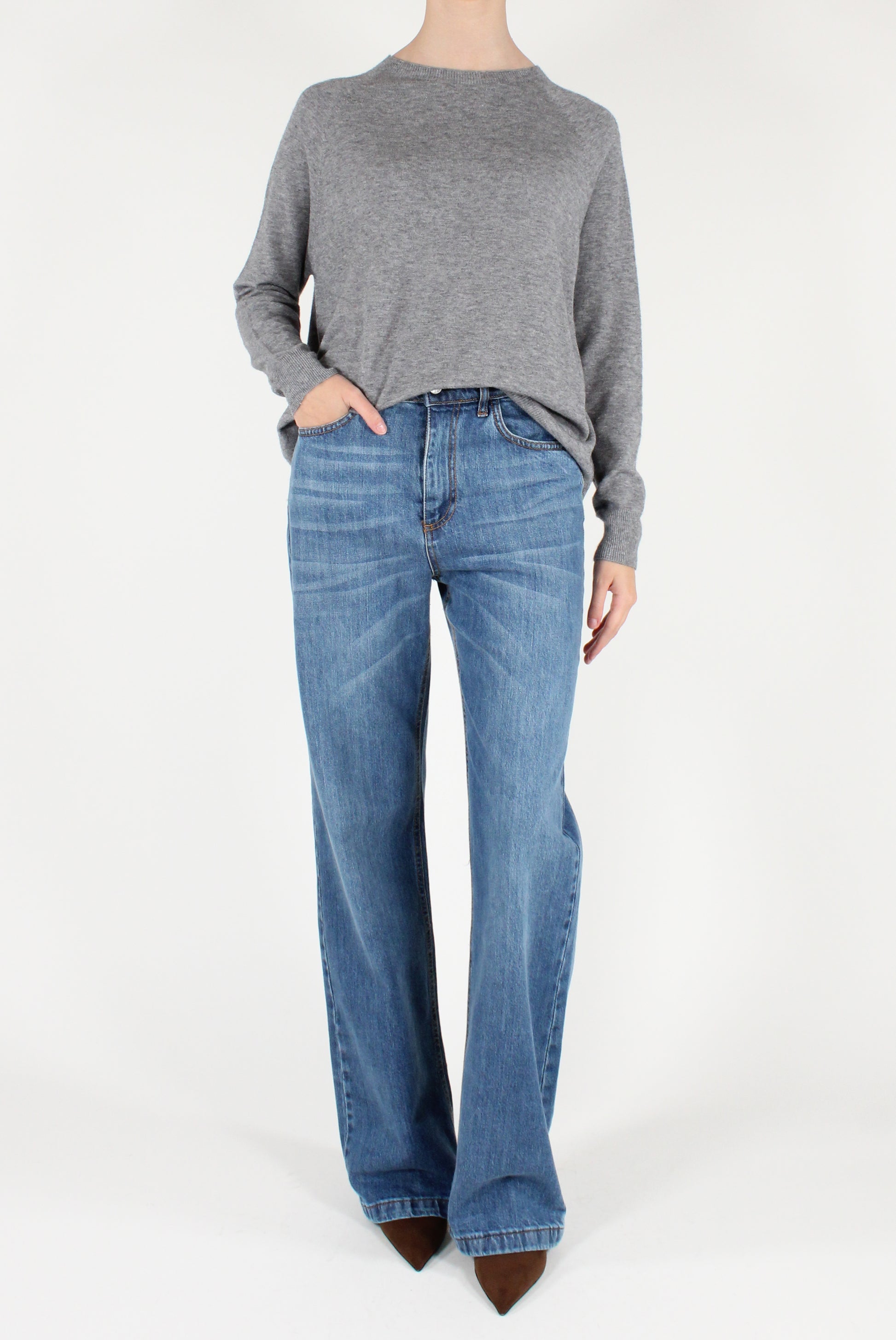 Maglioncino scollo tondo in misto viscosa. Modello a scatola, a maniche lunghe con dettaglio profili a costine e spacchetti laterali.