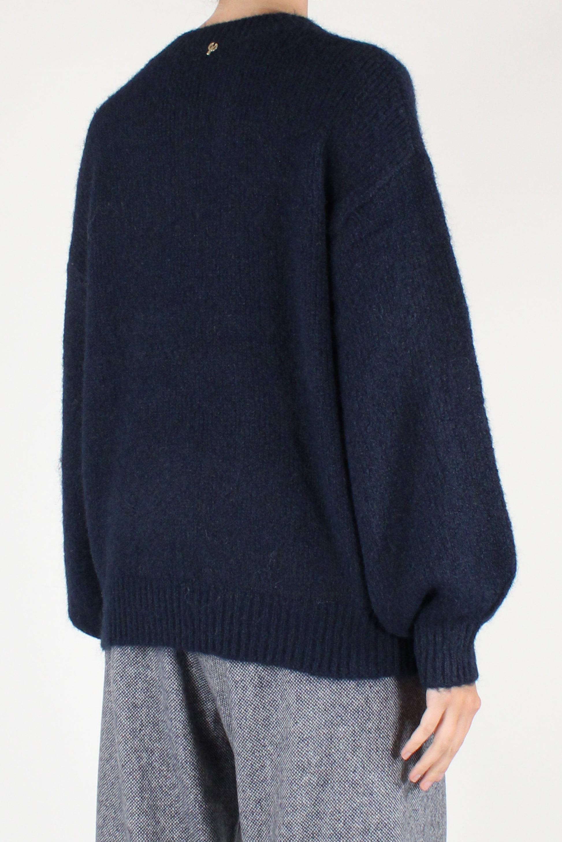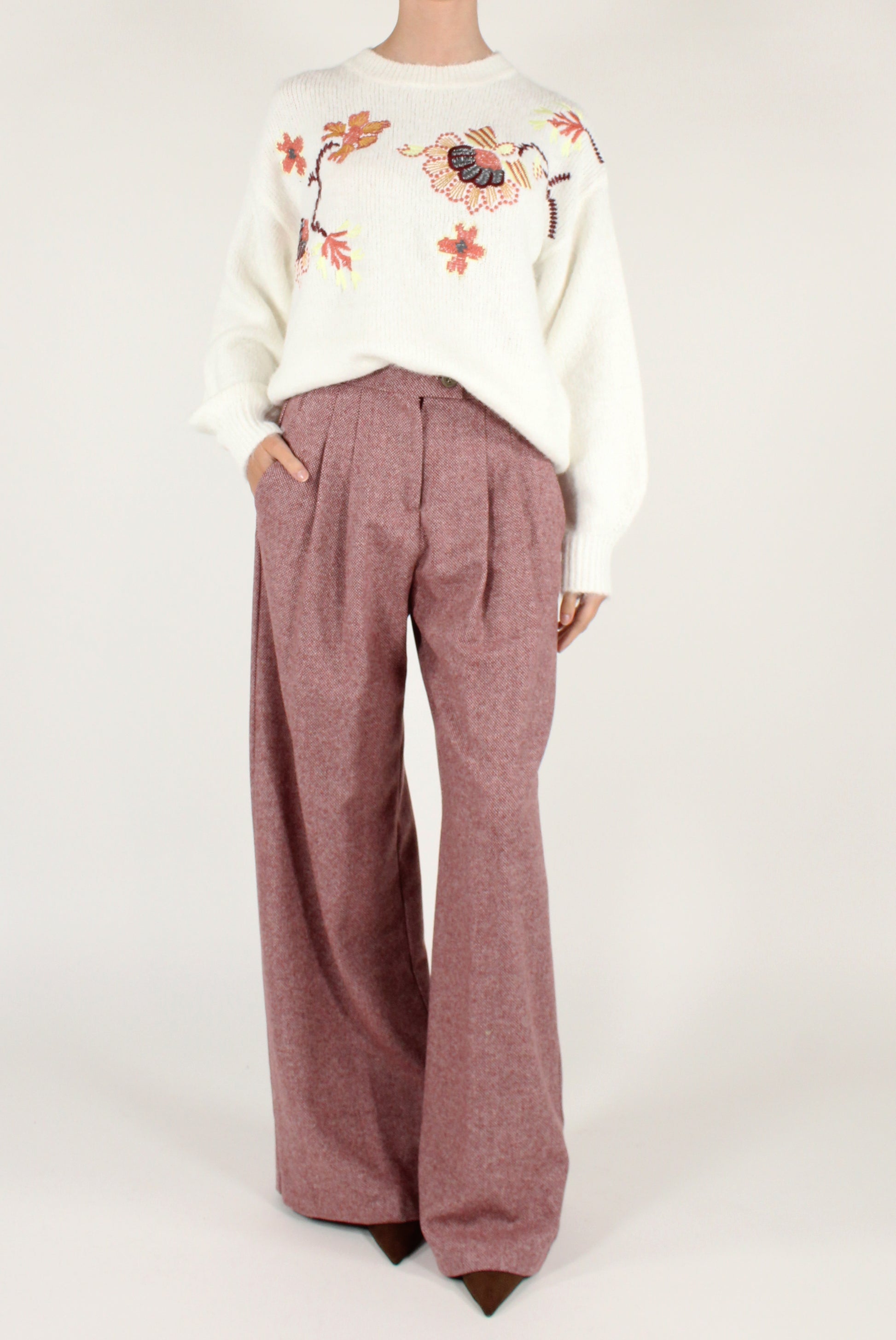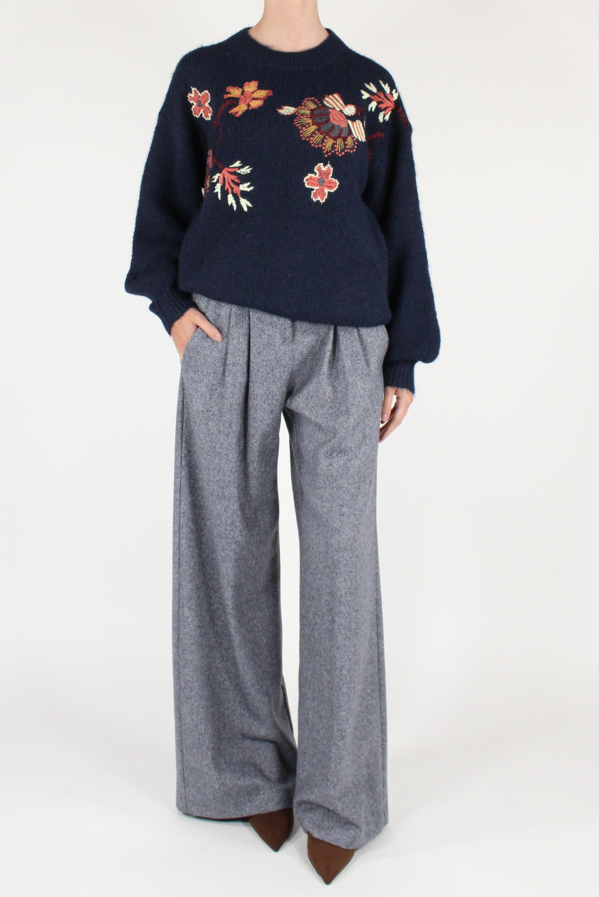 Maglione con fiori ricamati sul davanti. Girocollo, a maniche lunghe, elasticizzato.