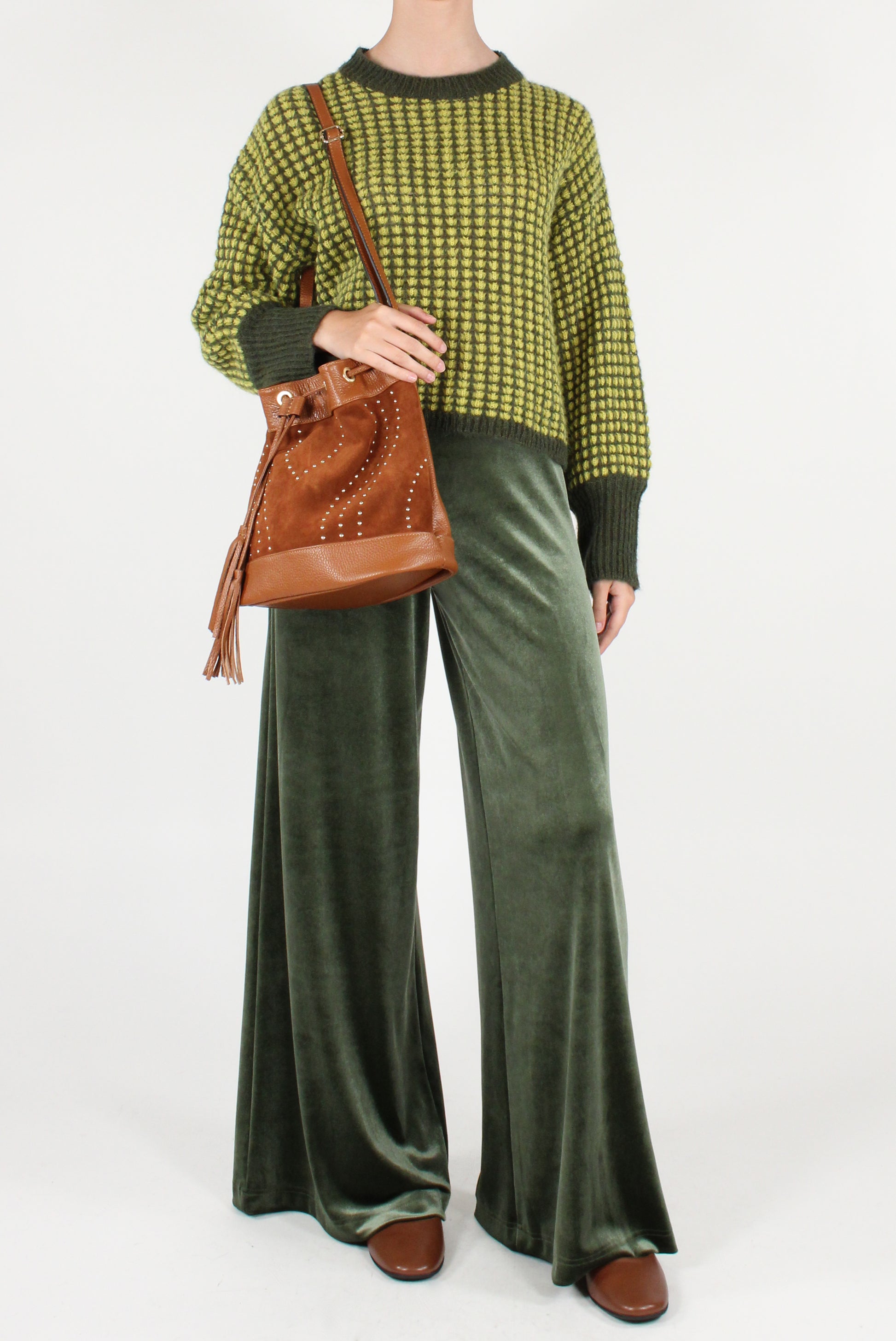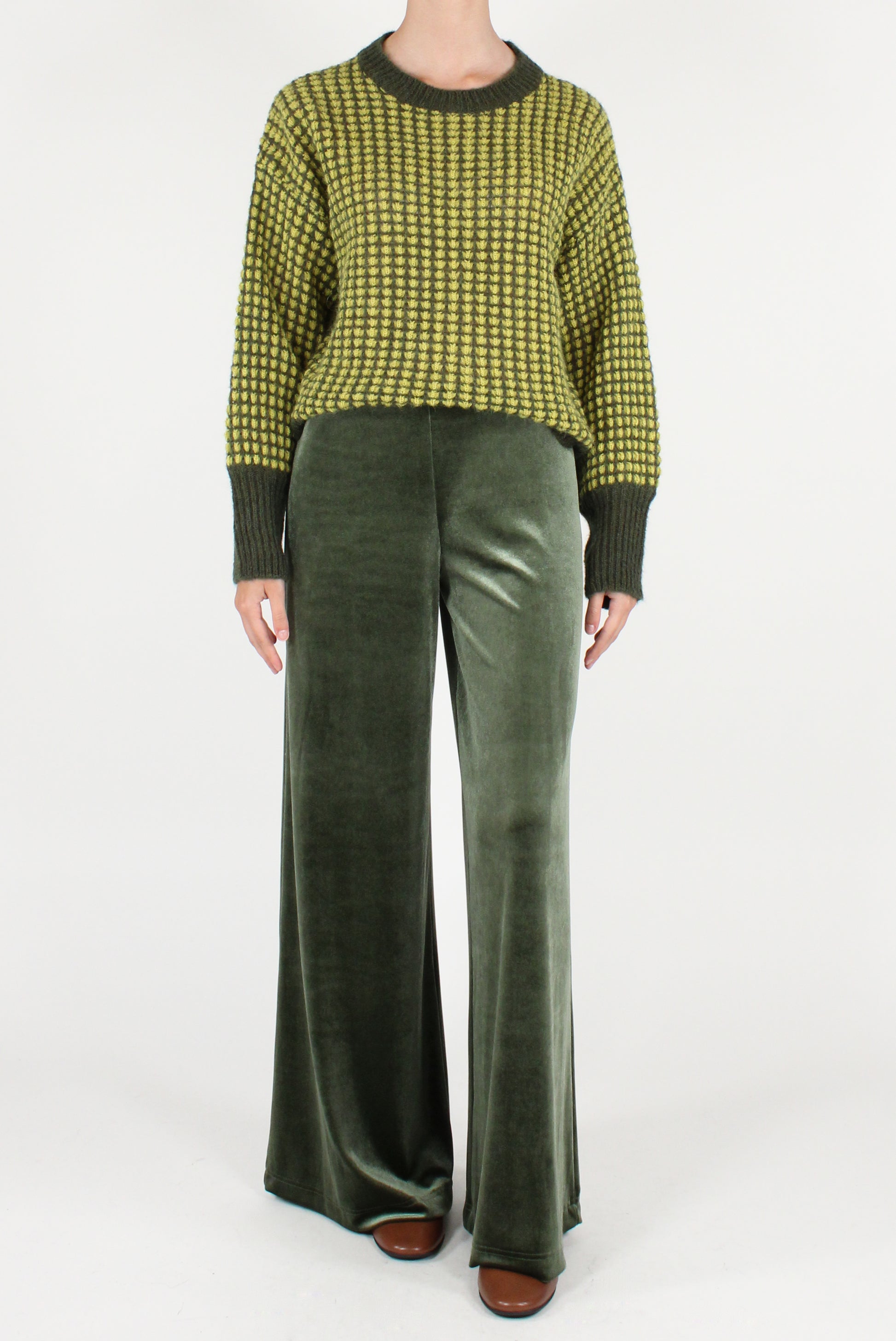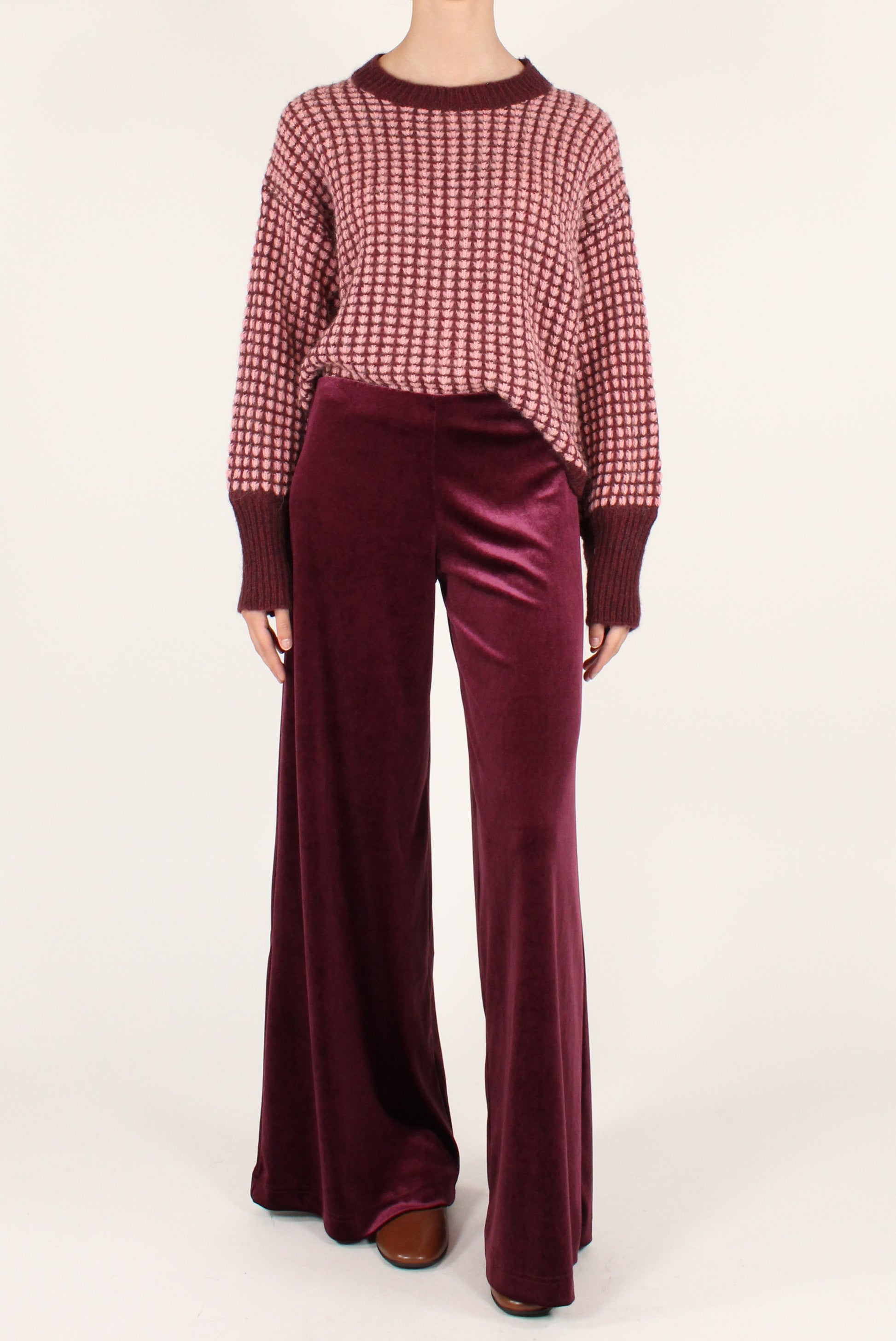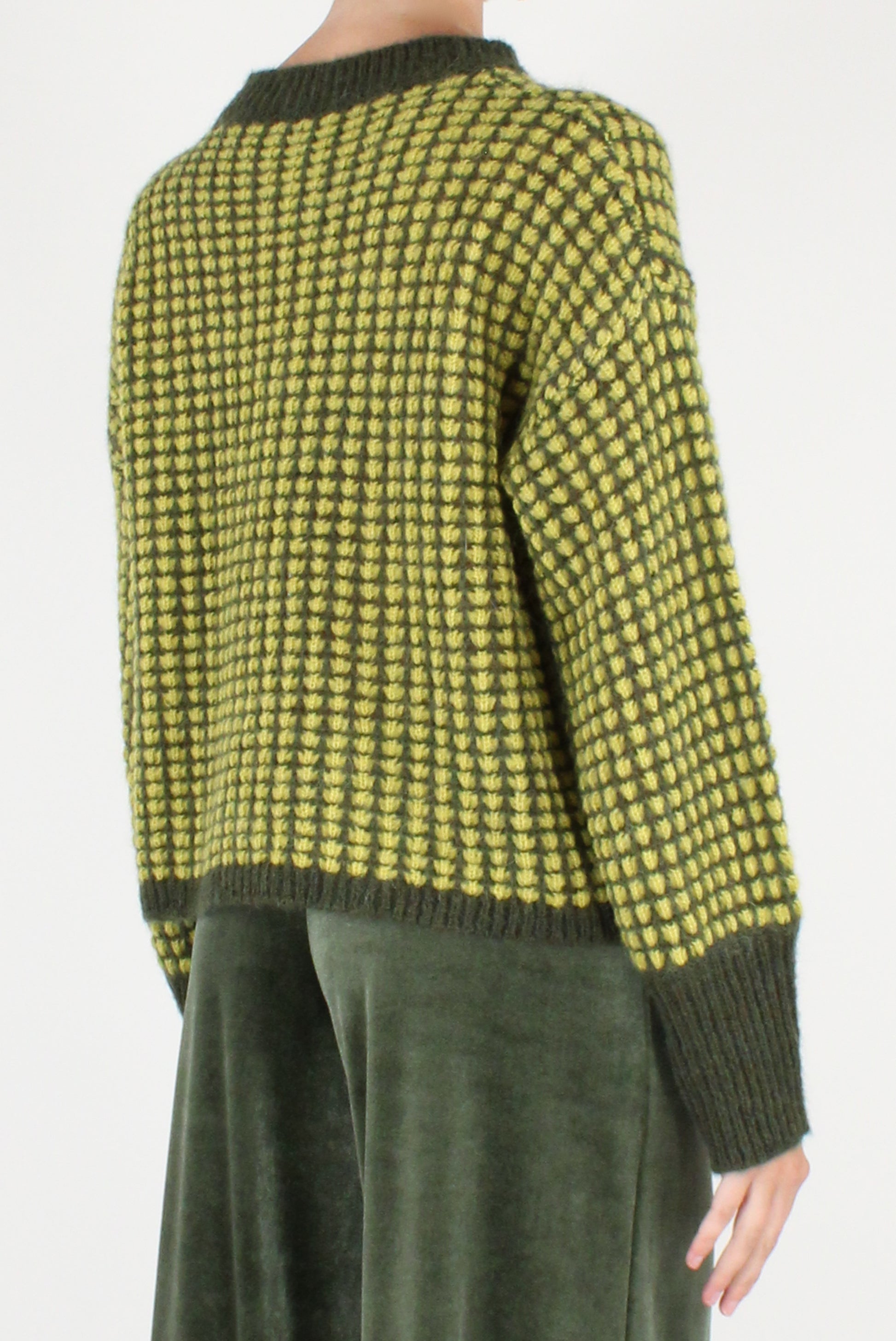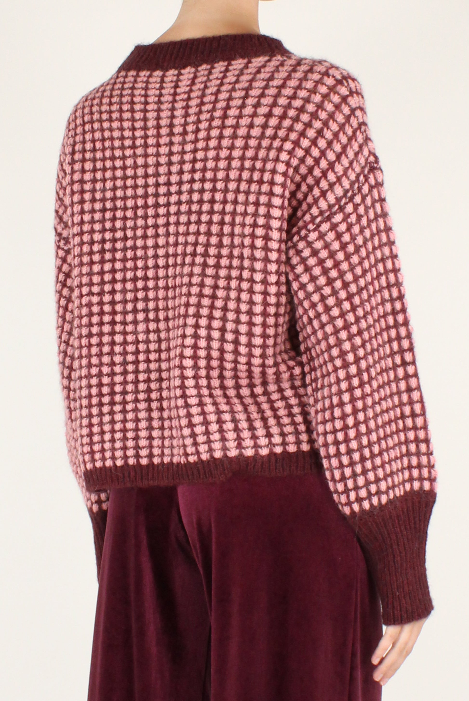 Crew neck sweater in two-tone decorated knit. Long sleeves with contrasting trim and a boxy fit.