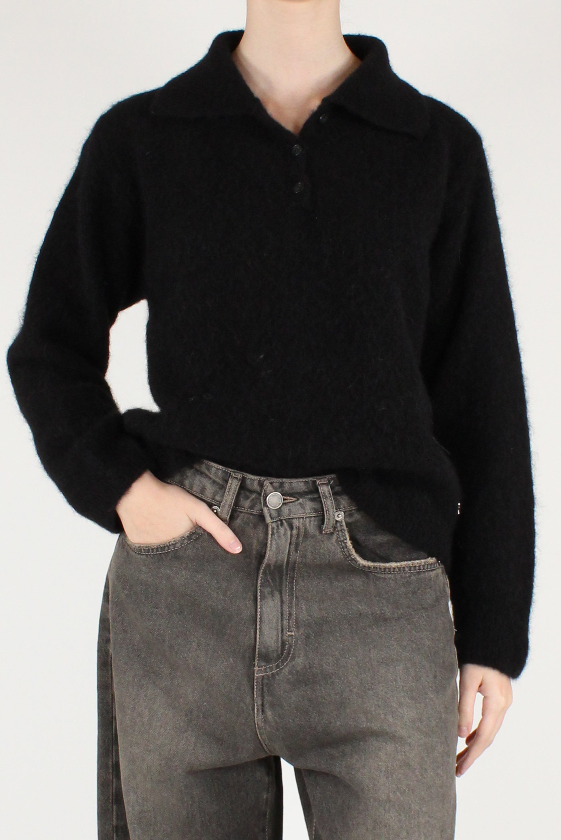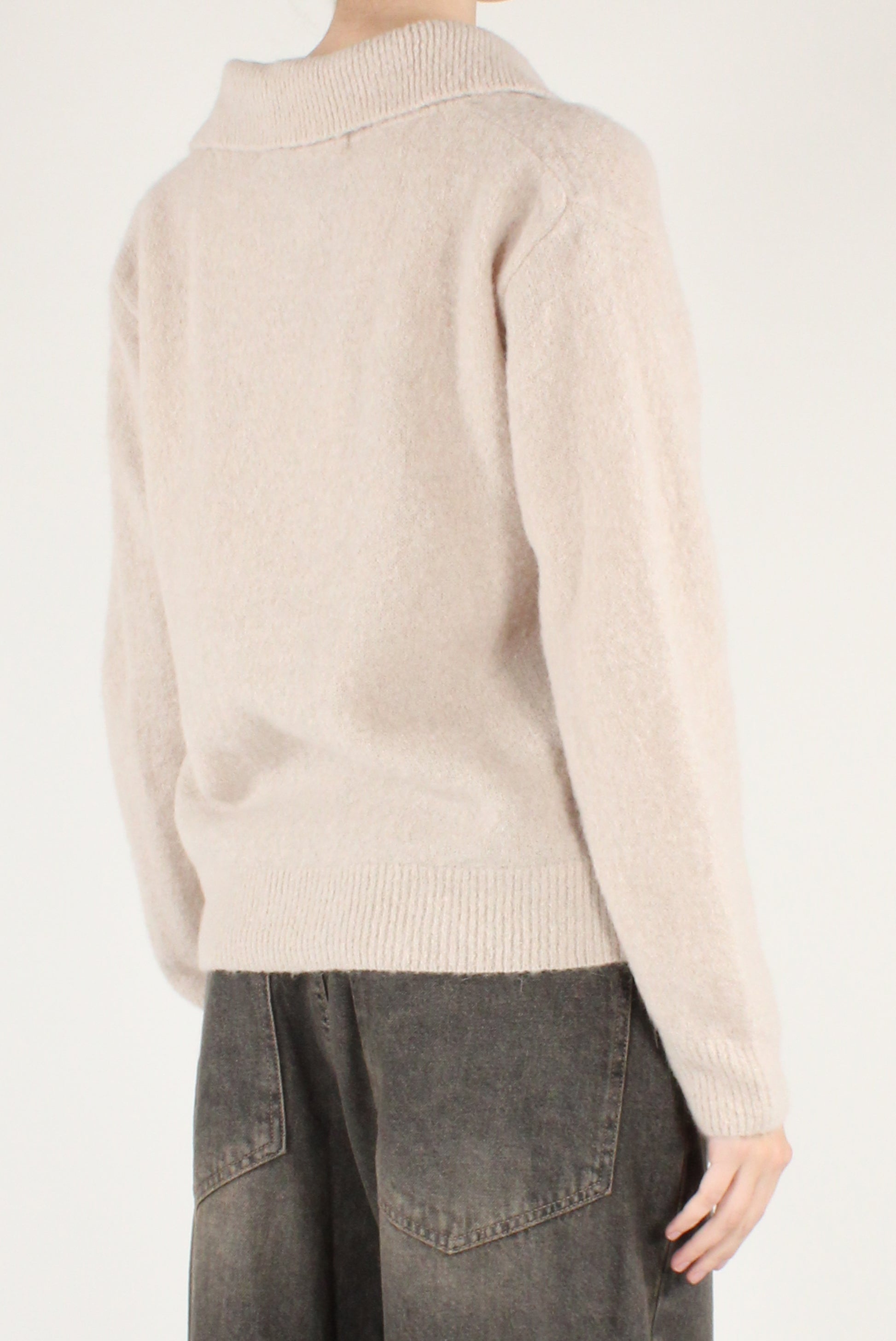Maglione scollo a polo in misto alpaca. Colletto ed allacciatura a bottoni, maniche lunghe, leggermente elasticizzato.