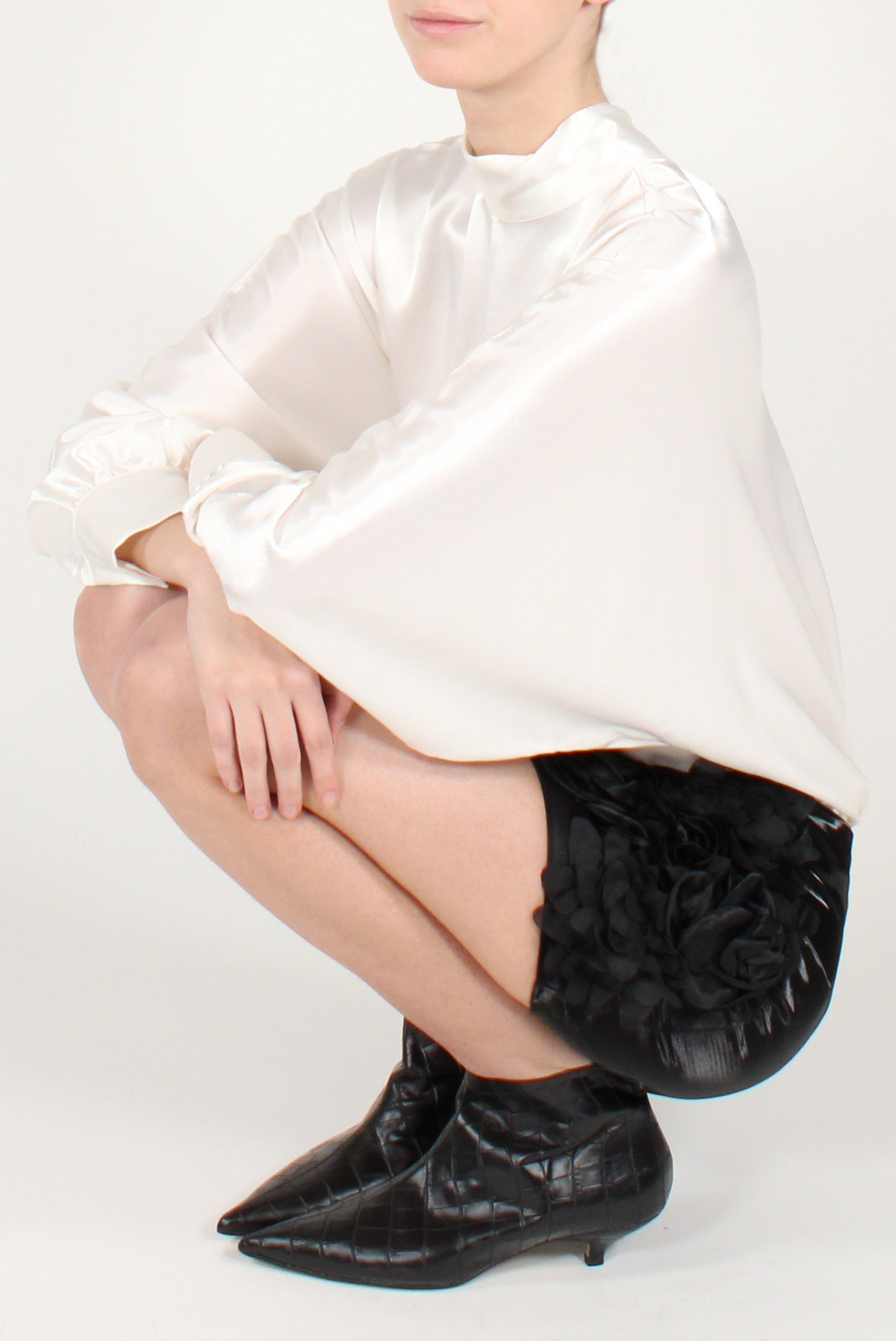 Minigonna con rose 3D applicate sul davanti. Chiusura a zip laterale, tessuto cangiante sul retro.