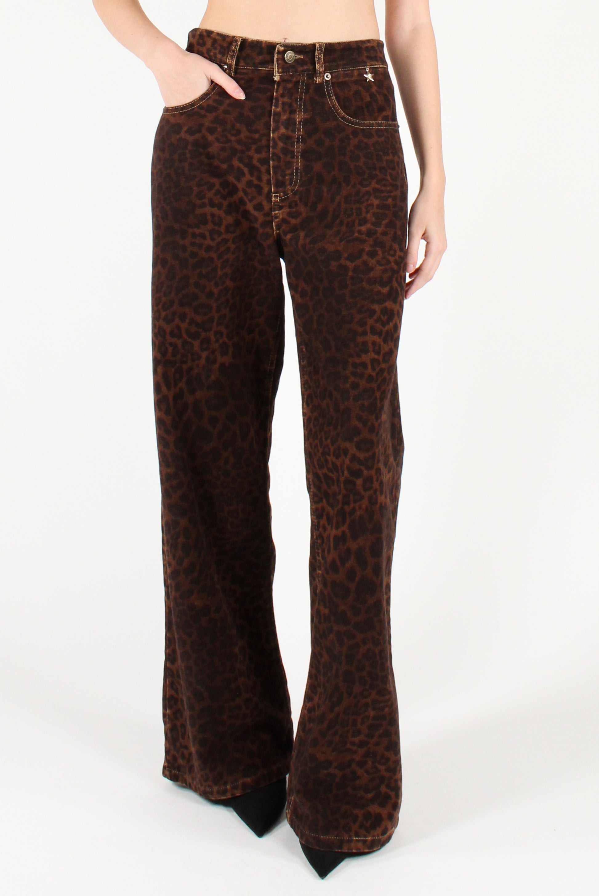 Pantaloni a palazzo in velluto a stampa animalier (modello Gabry). Cinque tasche con chiusura a zip e bottone, con passanti. Vestibilità abbondante.