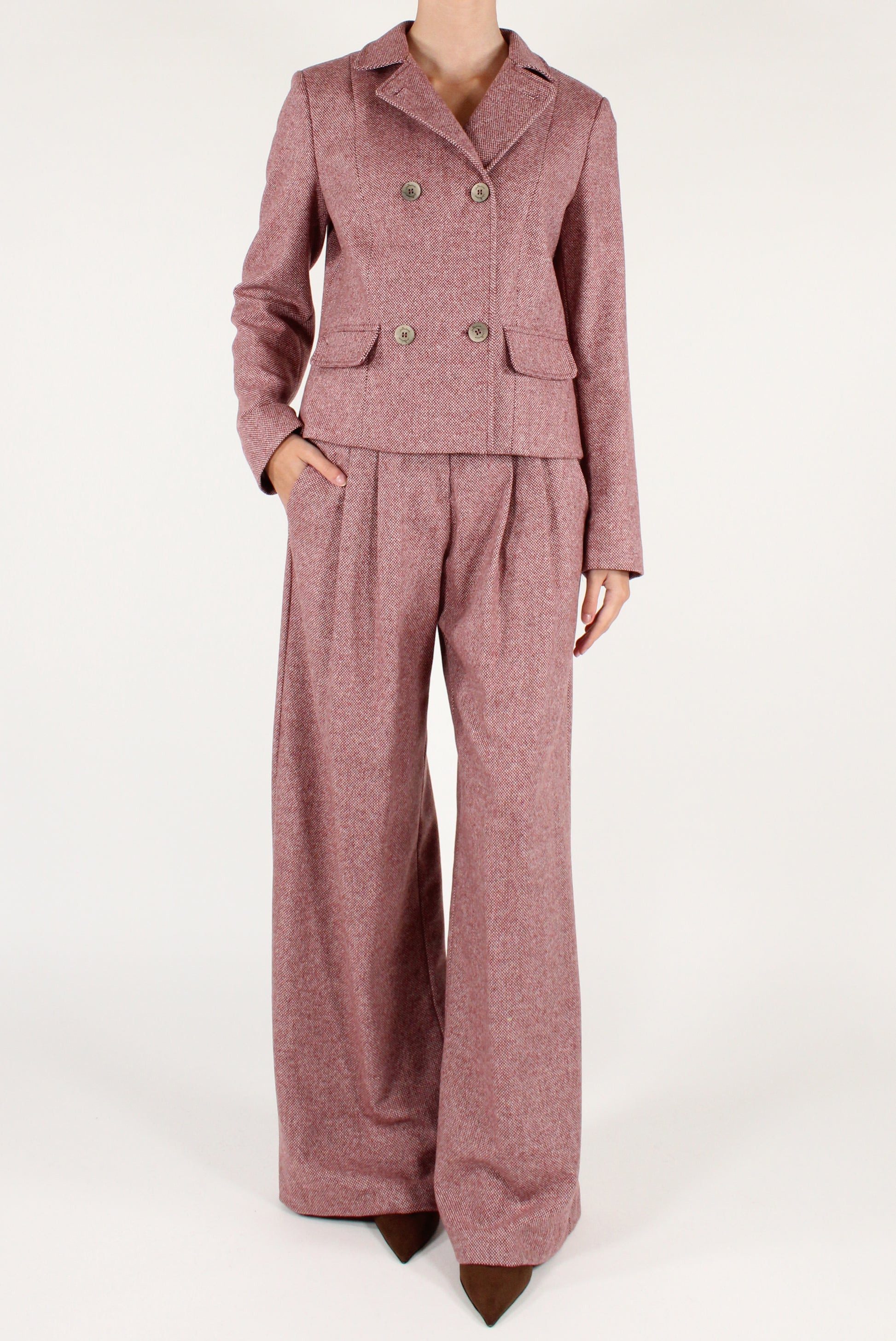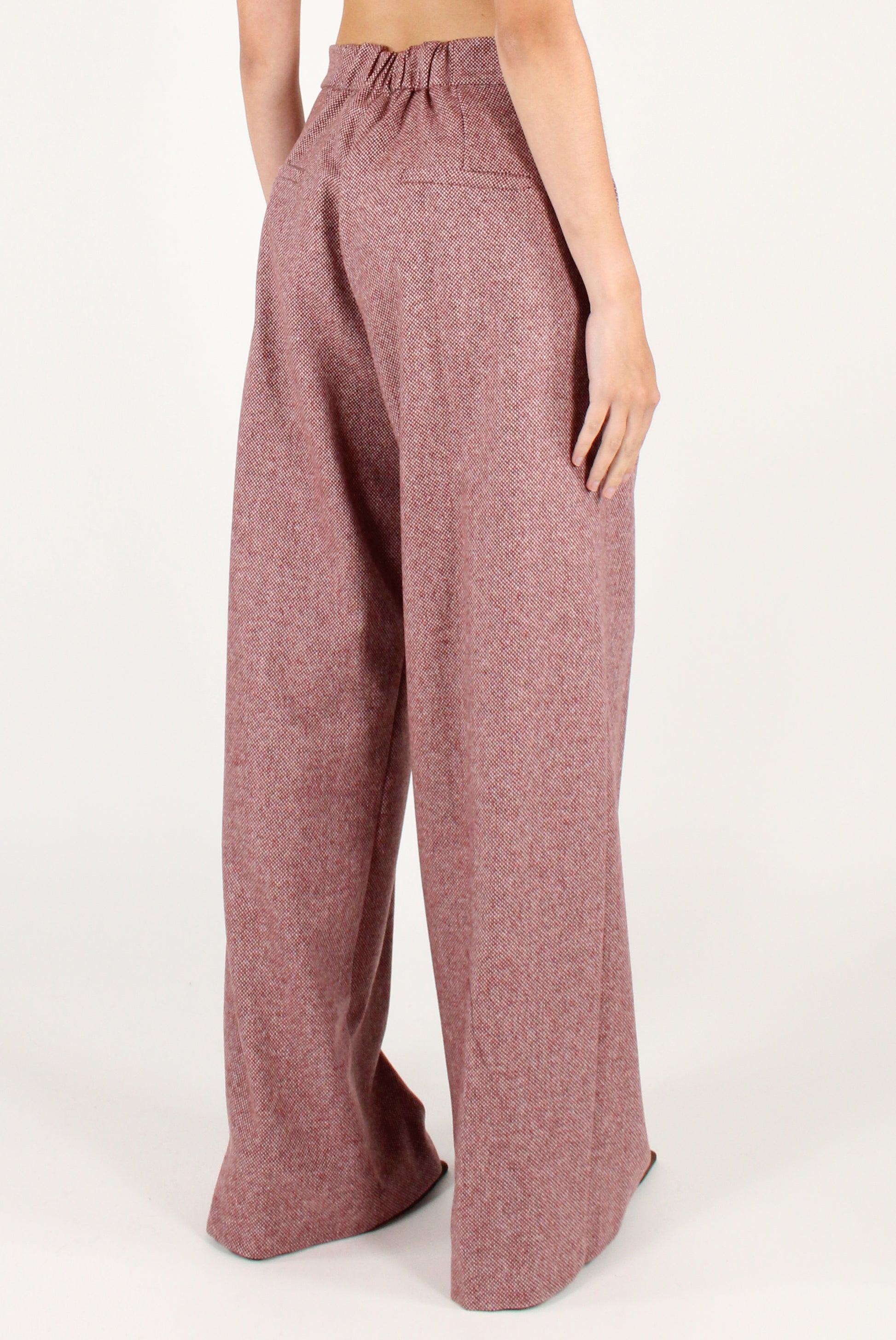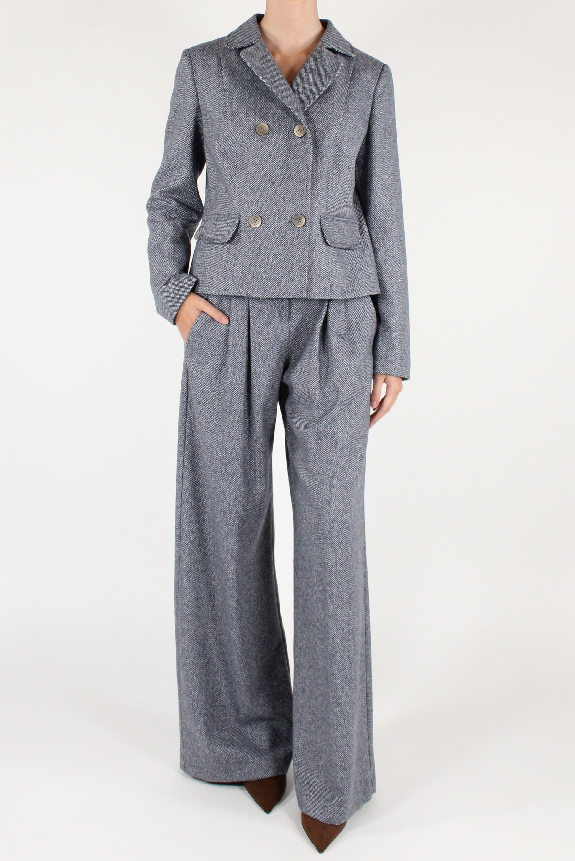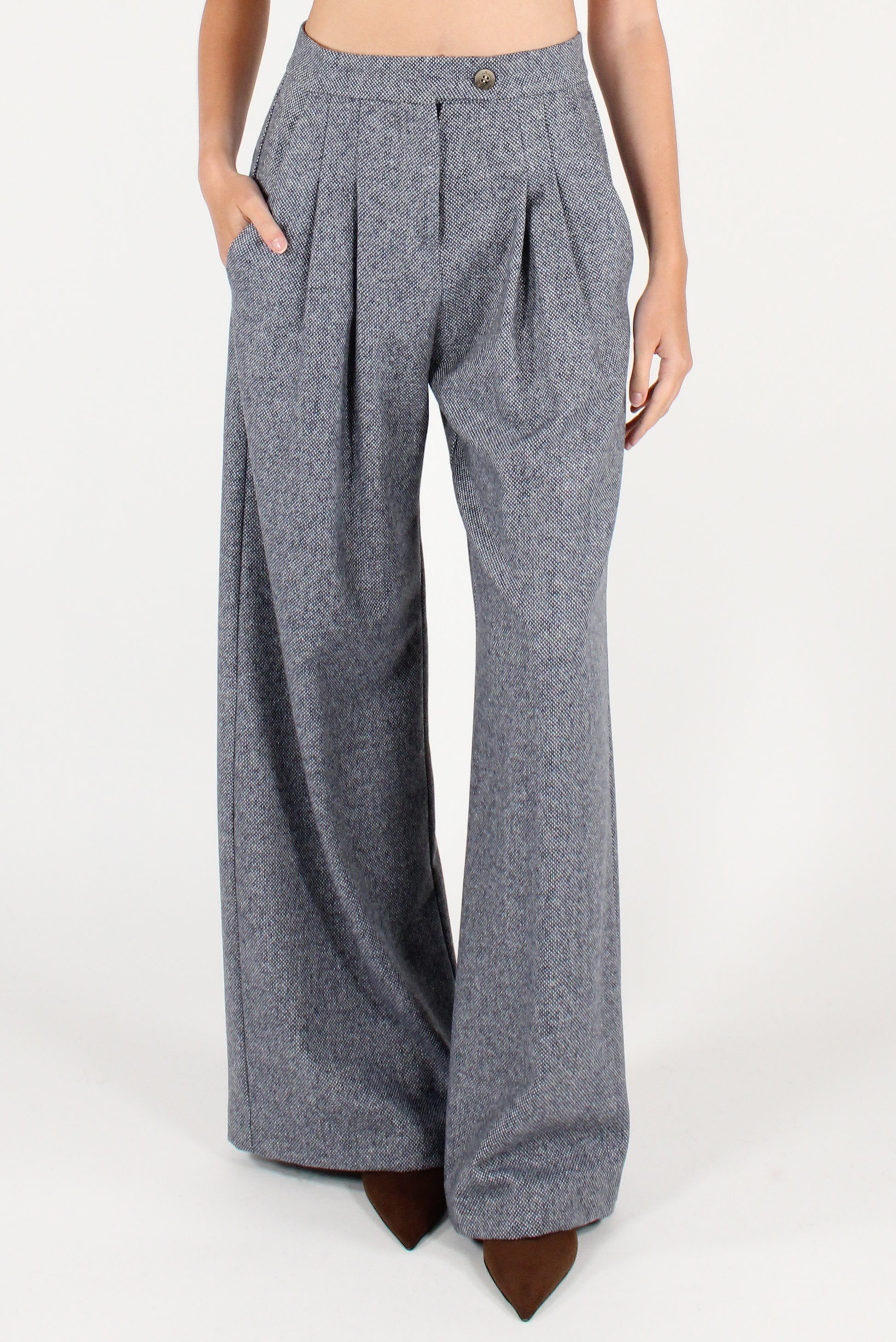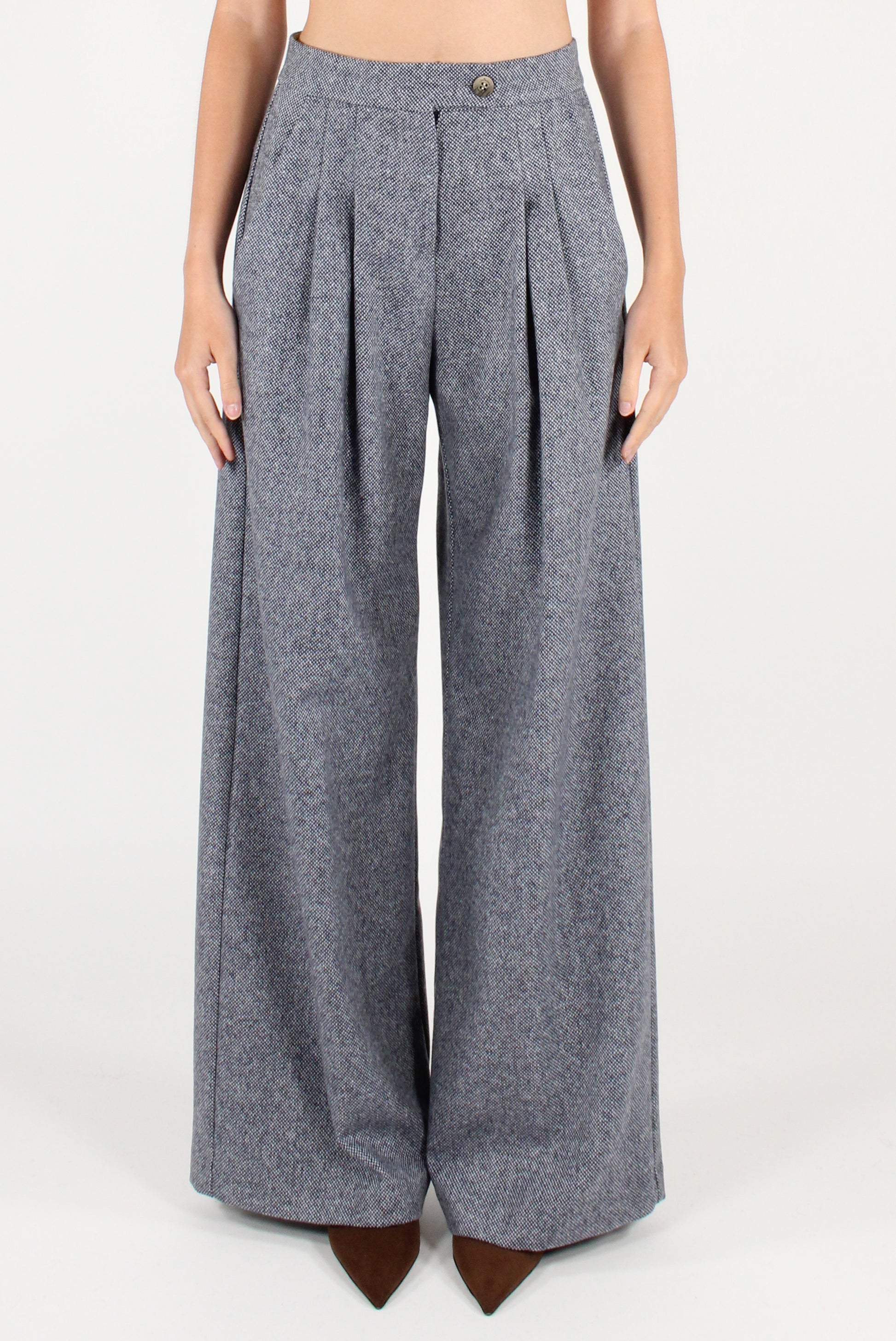 Pantaloni a palazzo mélange con pinces in misto lana. Con tasche laterali ed allacciatura a doppio bottone e chiusura a zip. Dettaglio elastico in vita solo sul retro, con passanti. Giacca coordinata disponibile.
