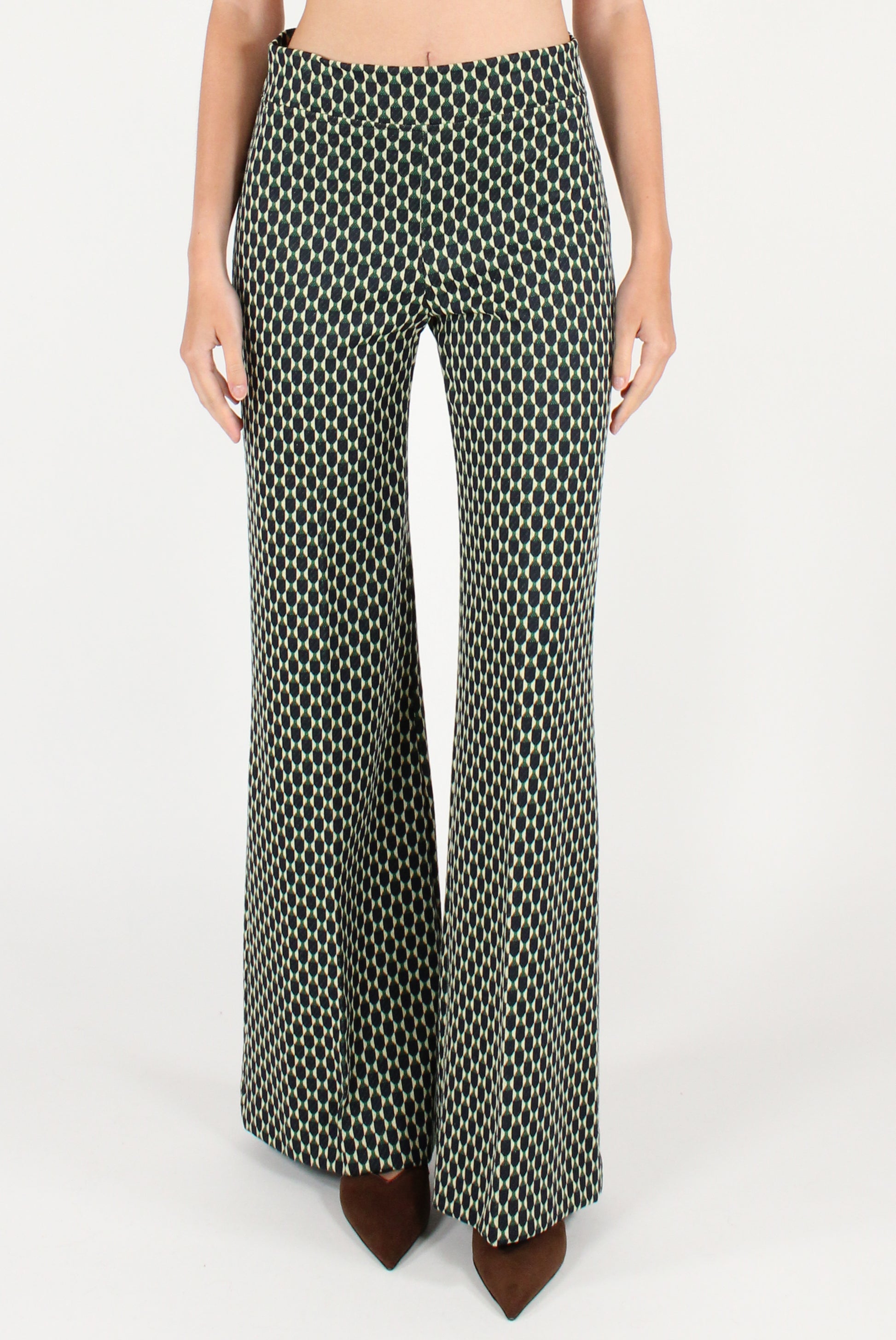 Stretch flared trousers with a geometric pattern. Slightly flared, with faux welt pockets on the back. Matching single-breasted blazer available.