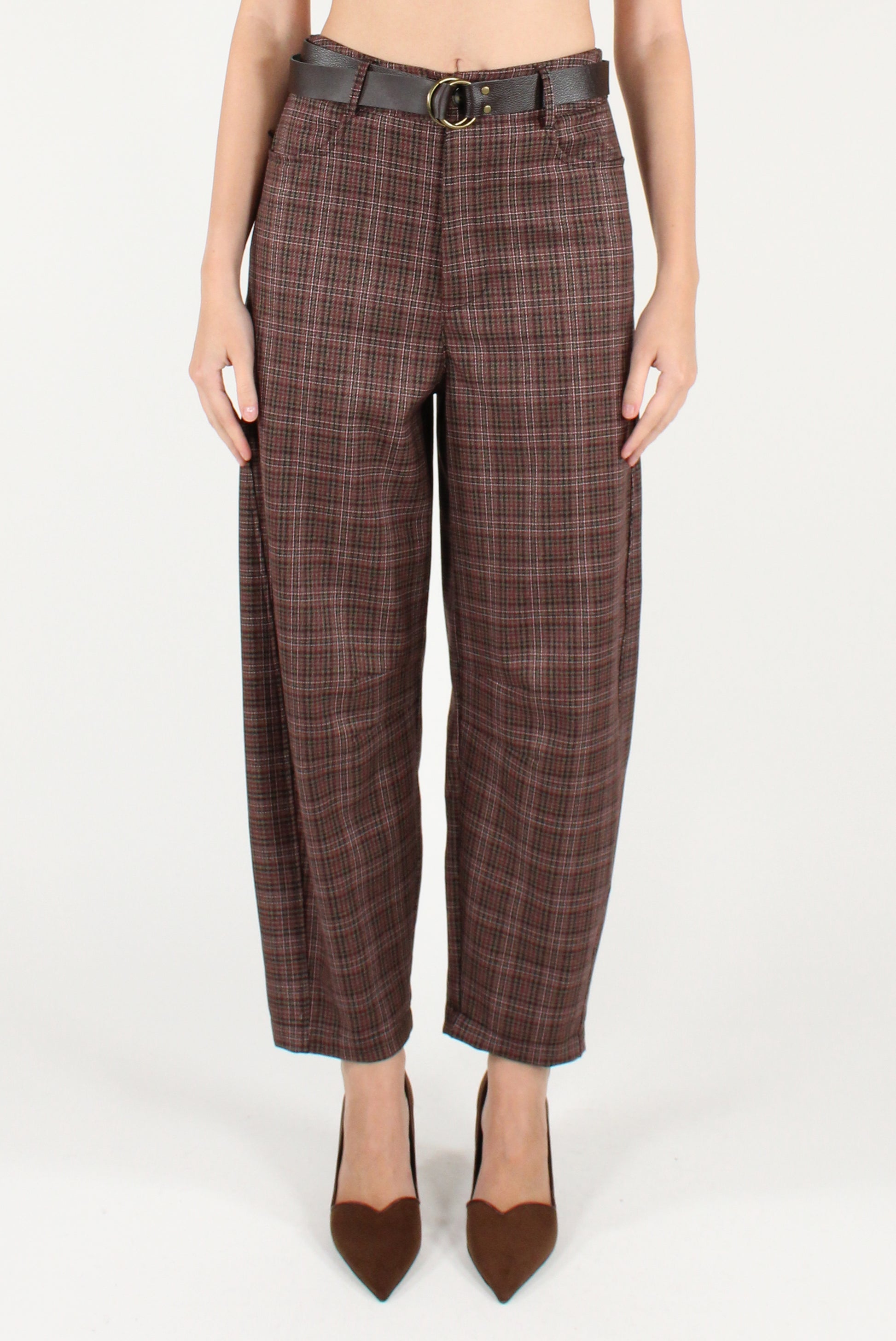 Pantaloni modello ovetto in tartan. Con tasche laterali, chiusura a zip e bottone e passanti. Cintura inclusa removibile.