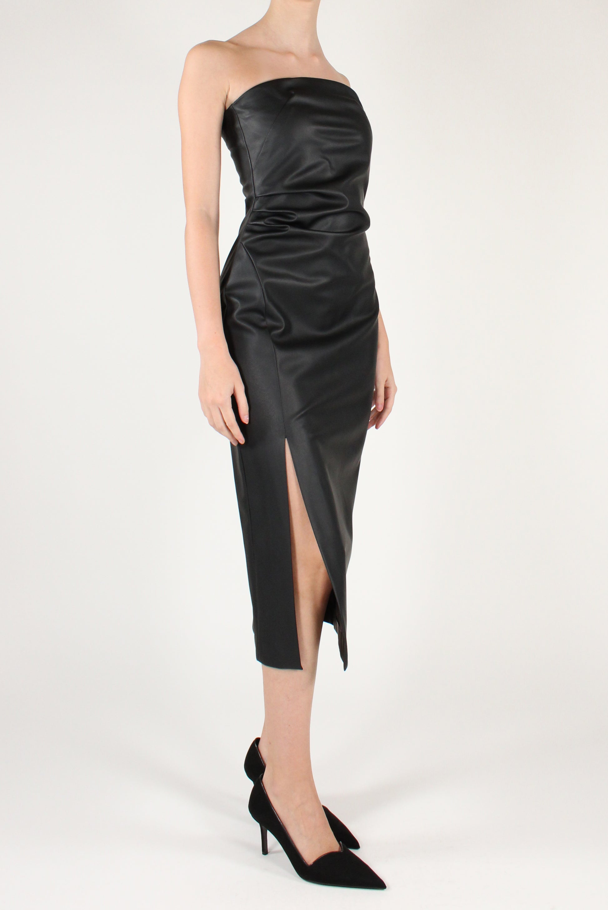Abito a tubino bustier in ecopelle. Smanicato, con dettaglio tessuto drappeggiato sul davanti e spacco laterale. Chiusura a zip e pinces sul retro.