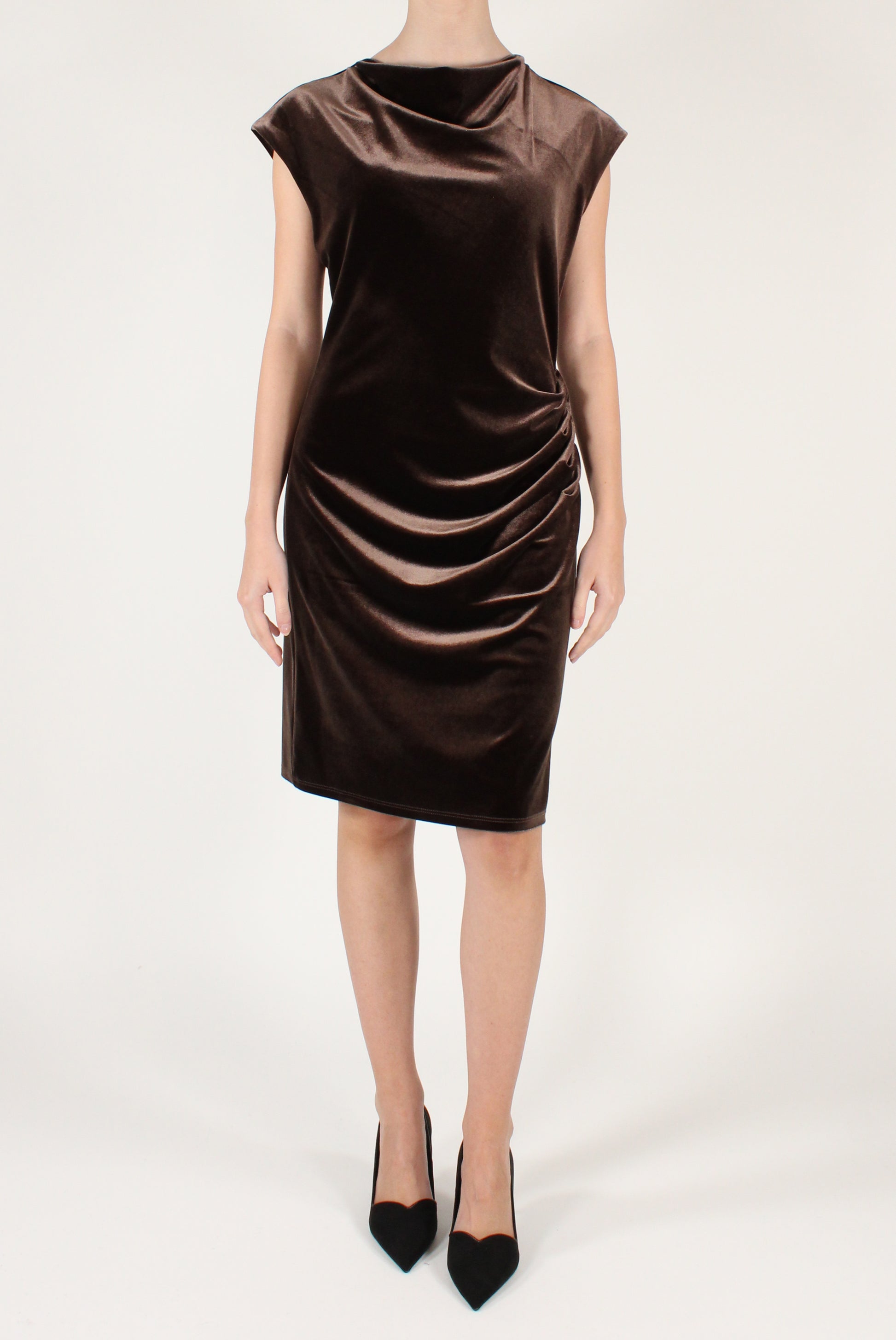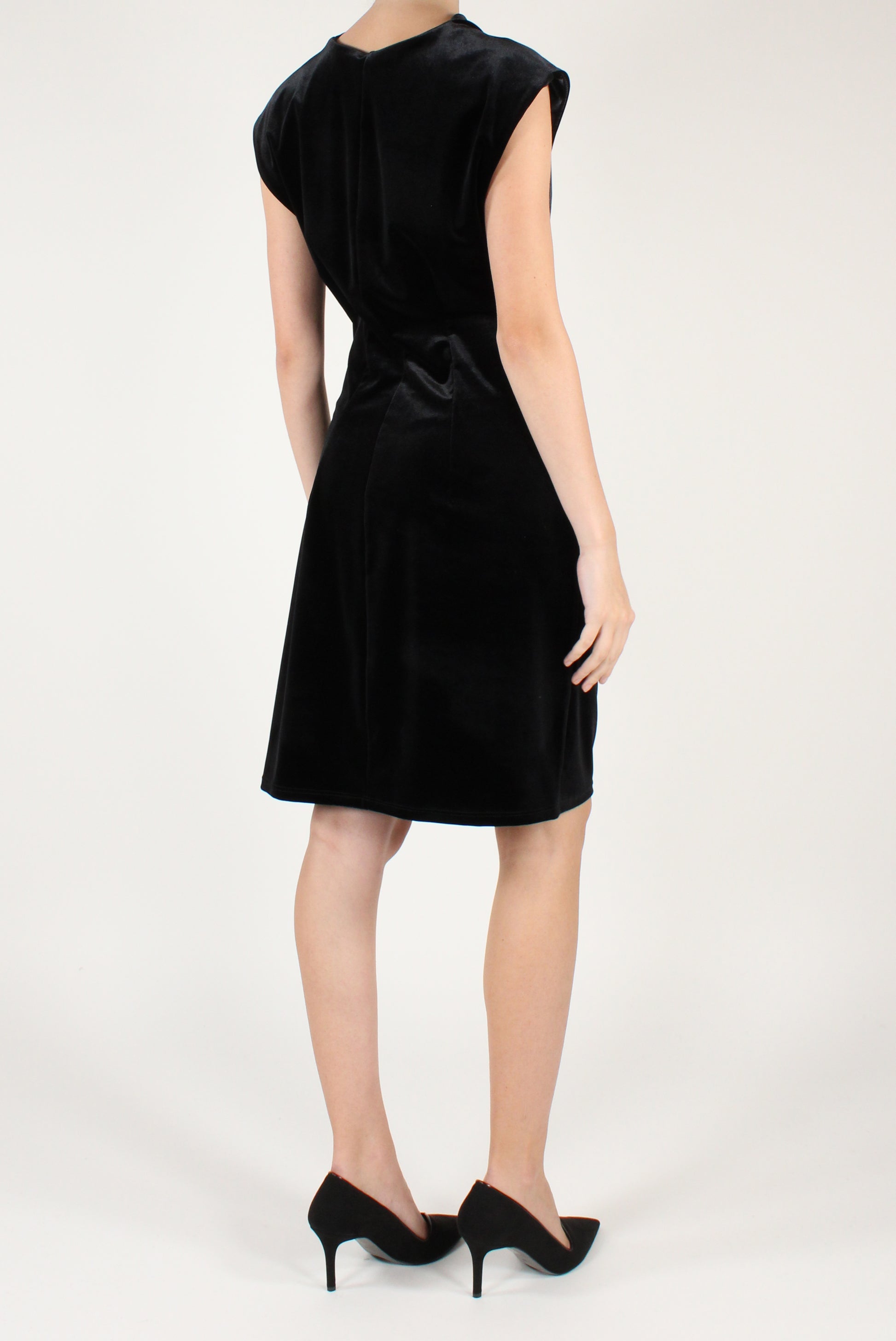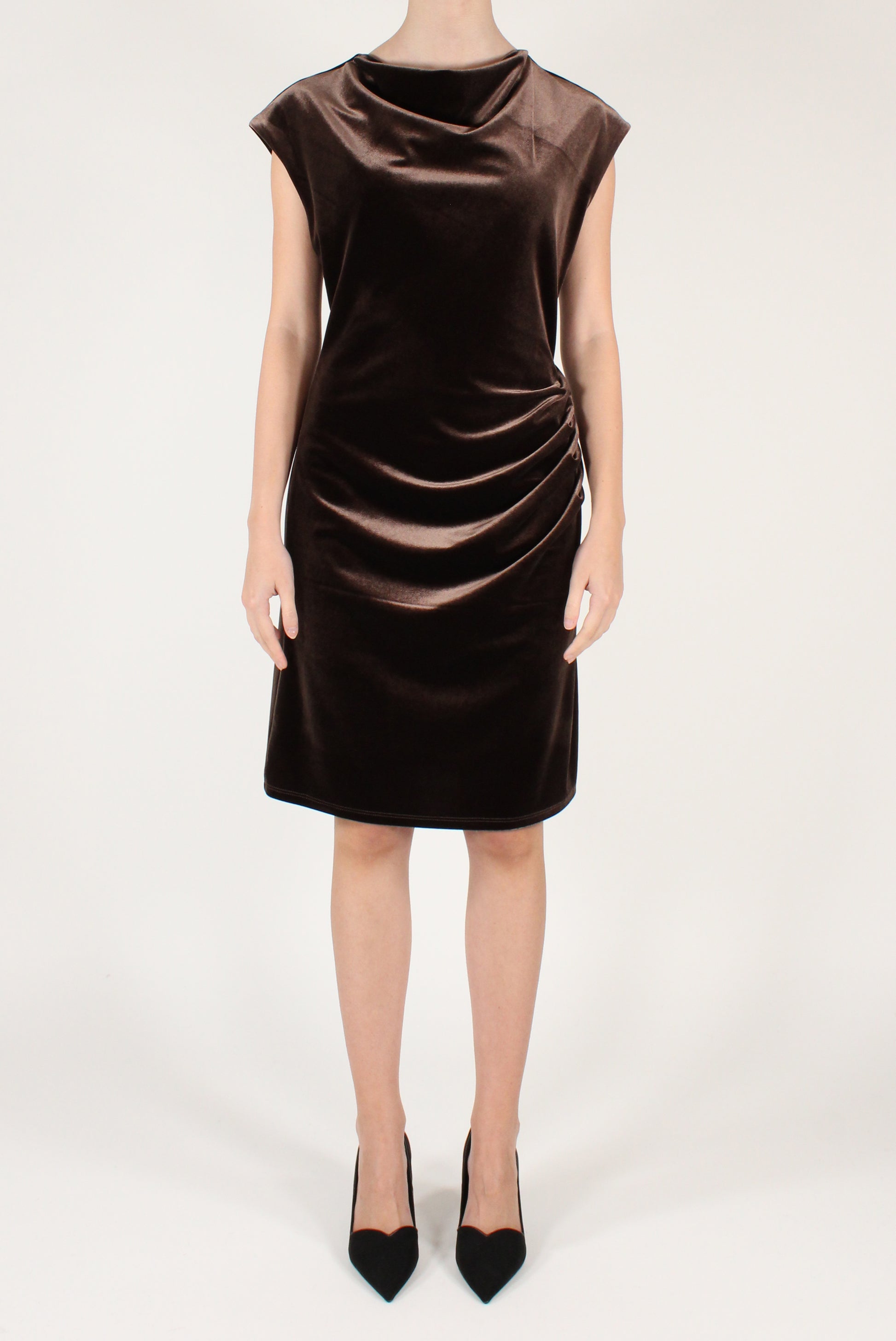 Abito corto in velluto drappeggiato sul davanti. Smanicato, elasticizzato.