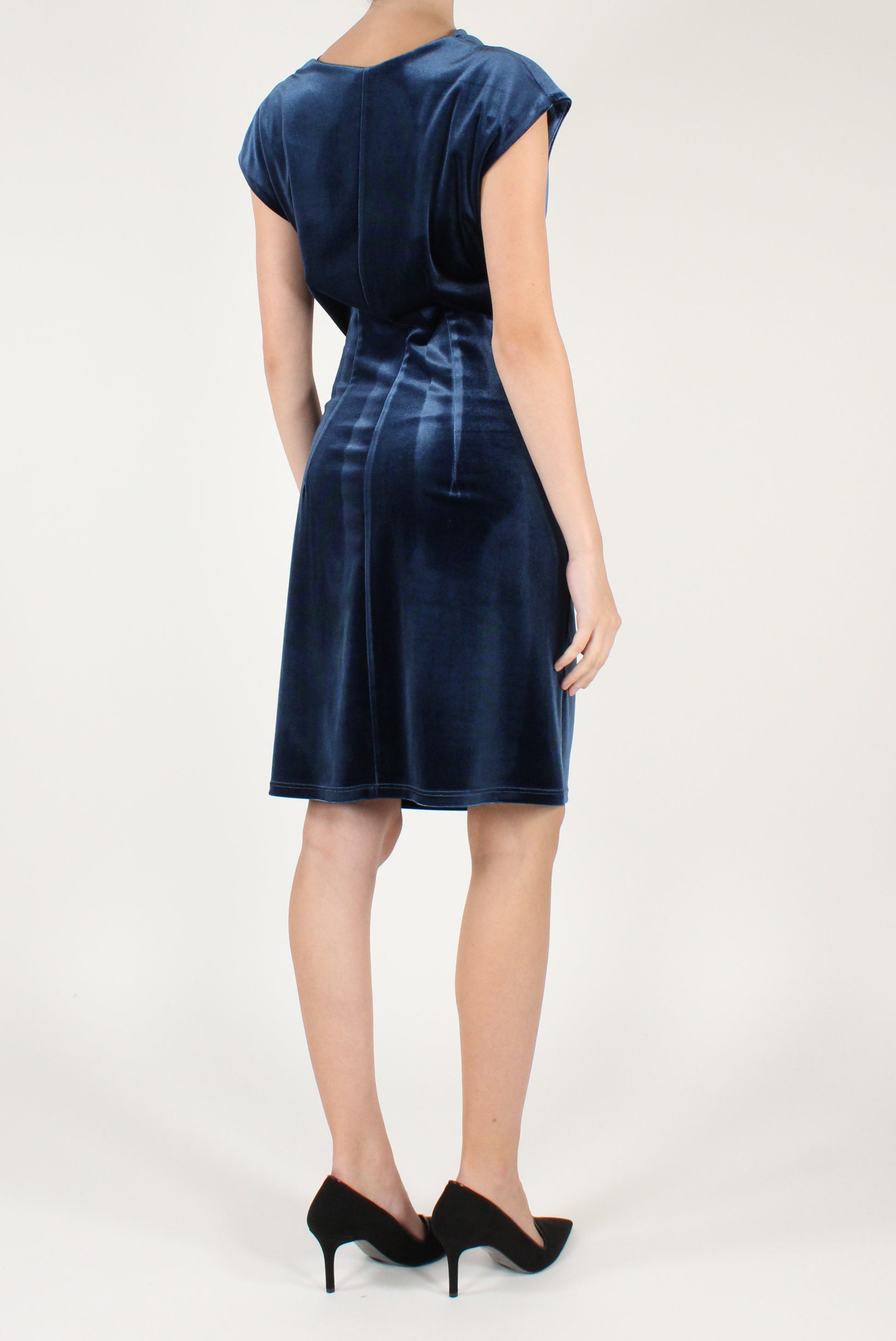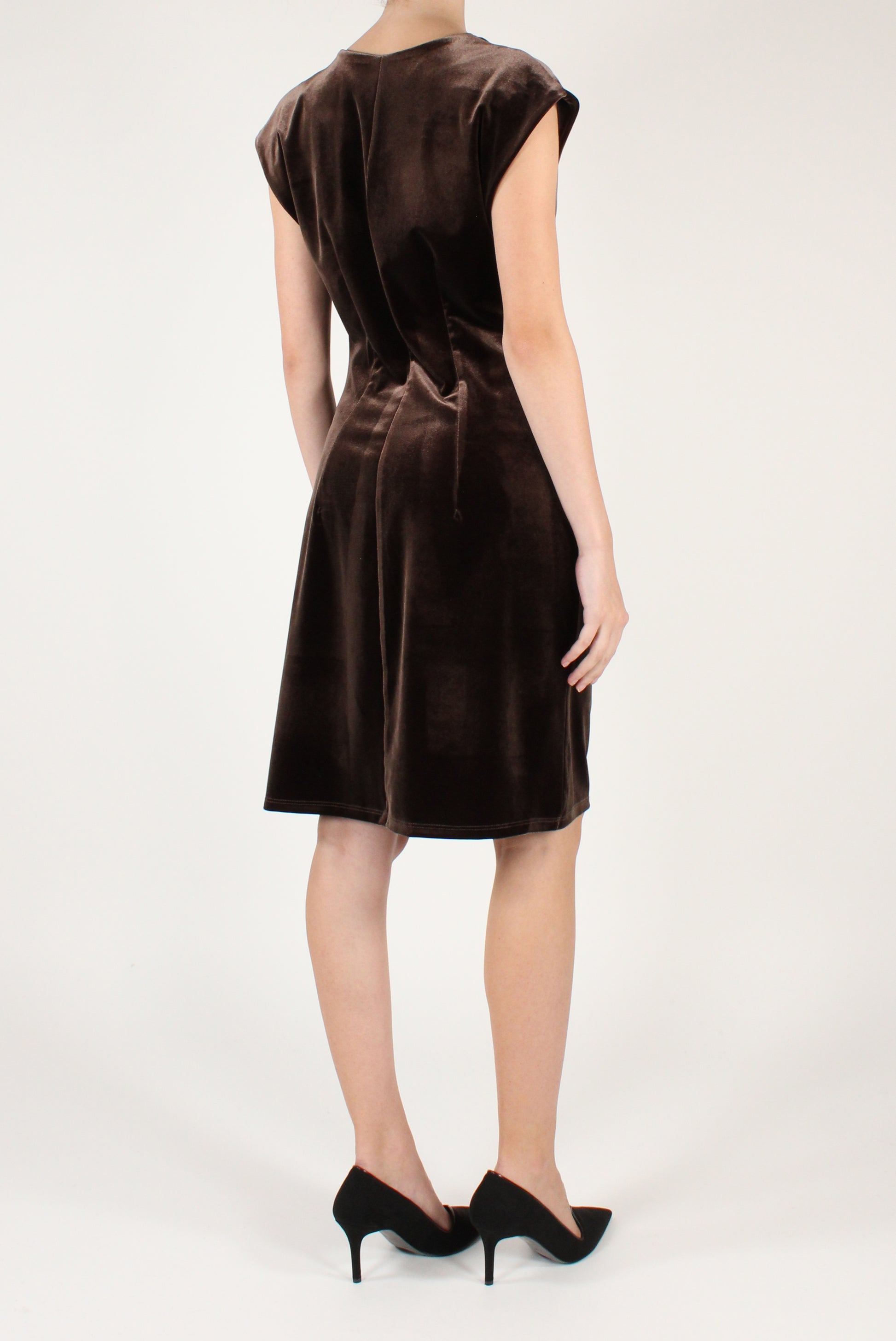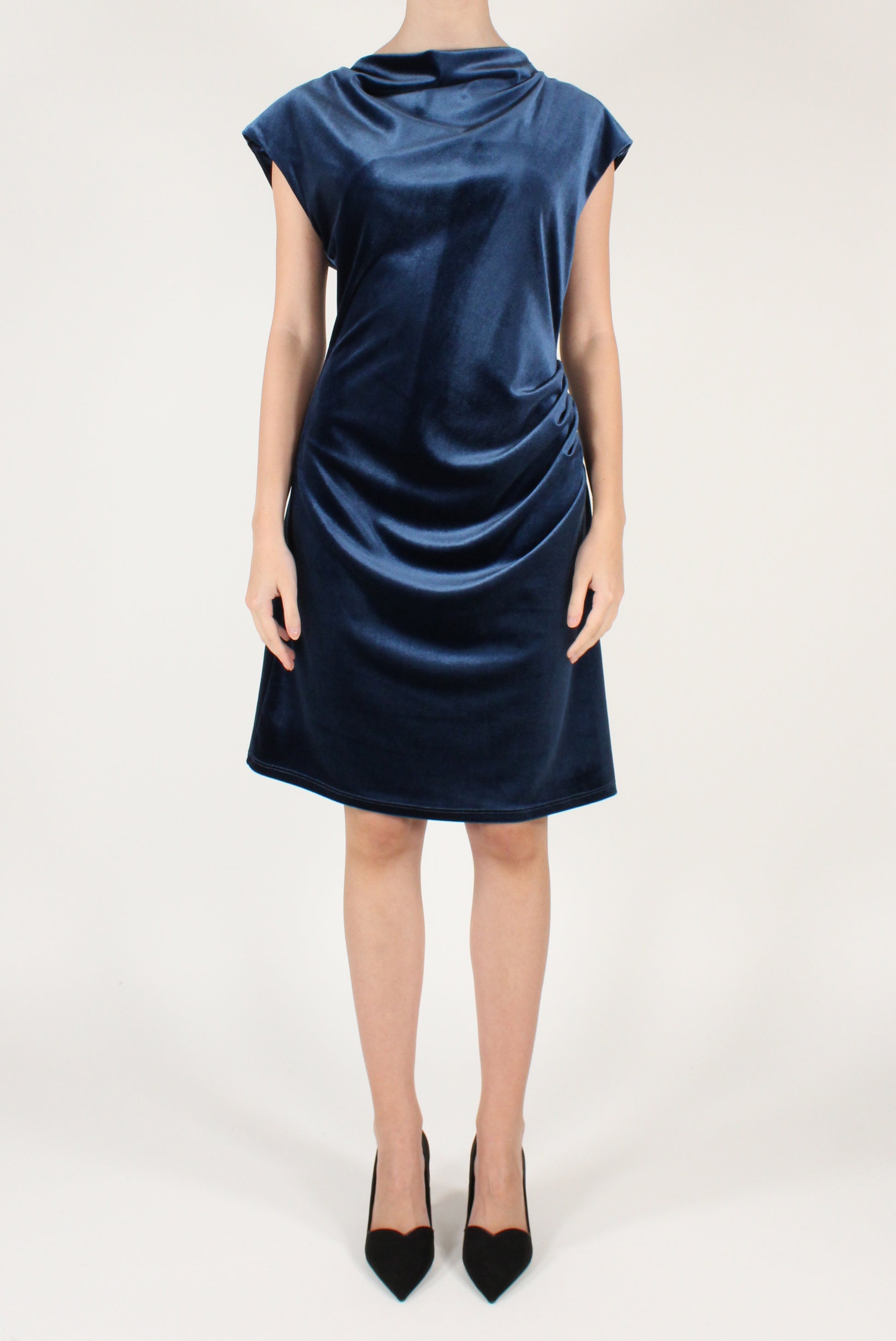 Abito corto in velluto drappeggiato sul davanti. Smanicato, elasticizzato.