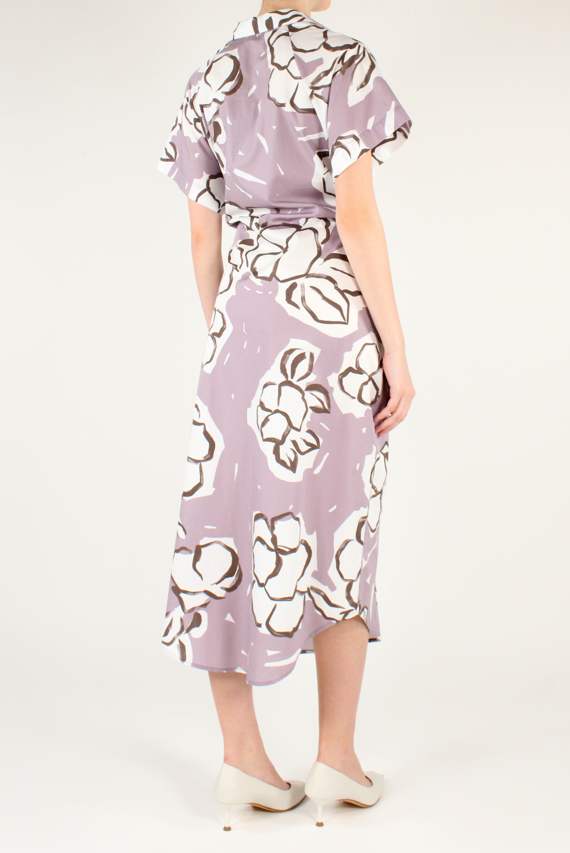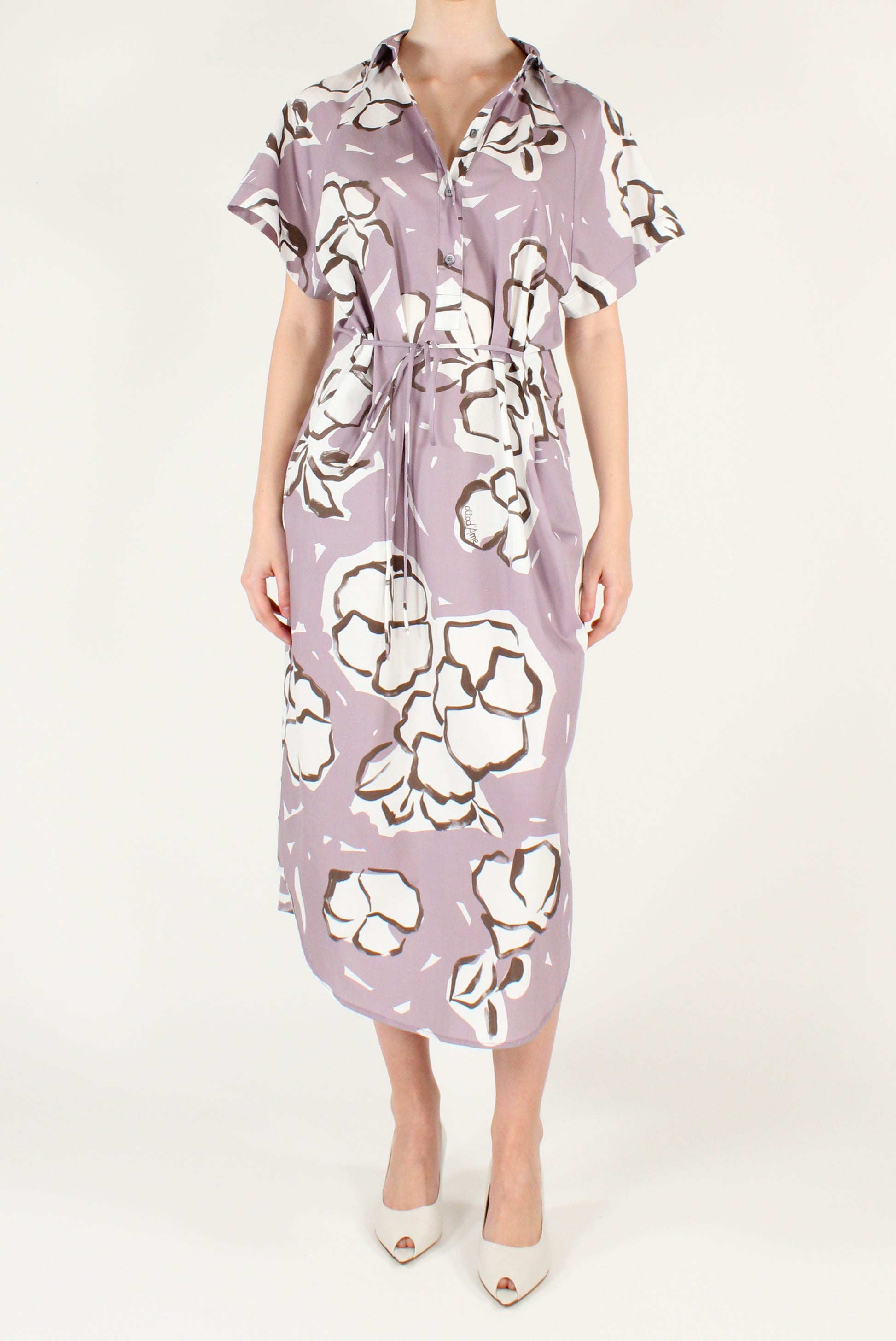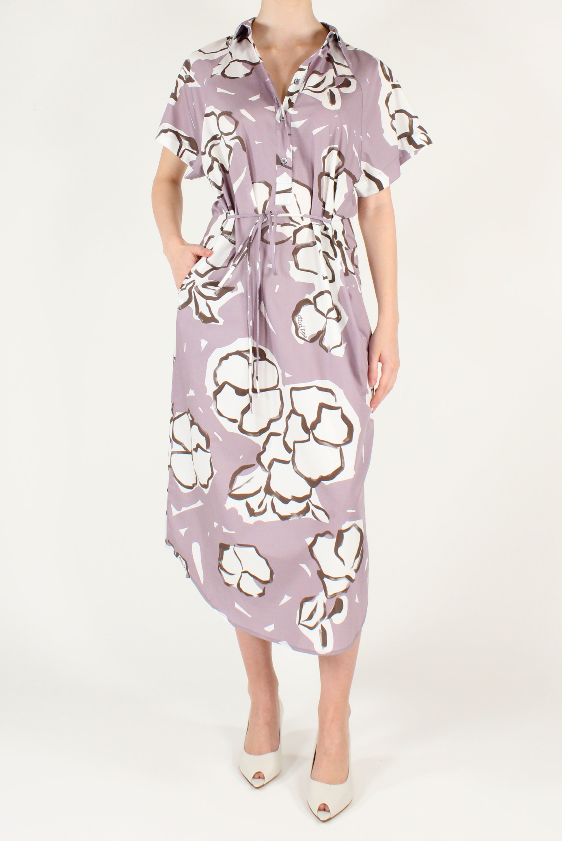 Abito midi da donna in cotone con fantasia floreale. Modello con scollo a polo e bottoni, maniche corte e cintura regolabile in vita che valorizza la silhouette. Leggero e femminile, perfetto per look estivi eleganti e casual chic.
