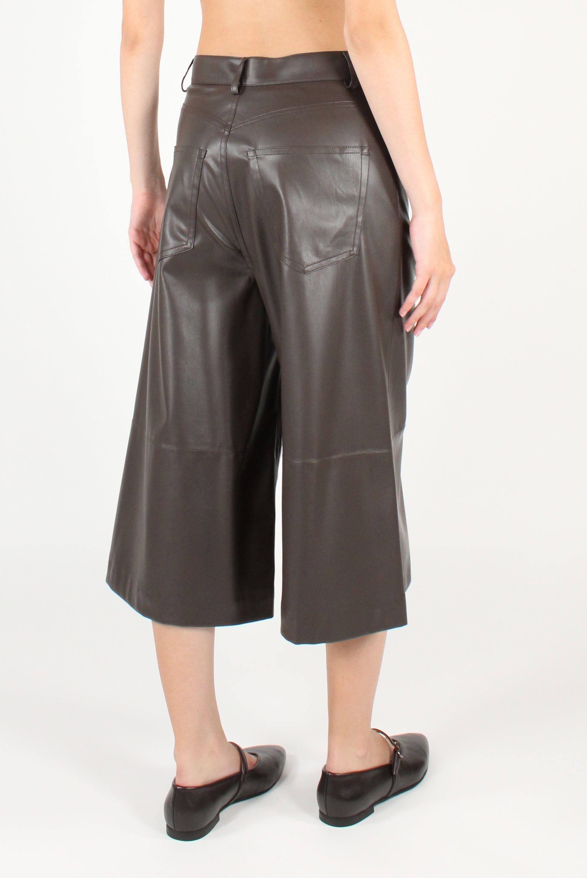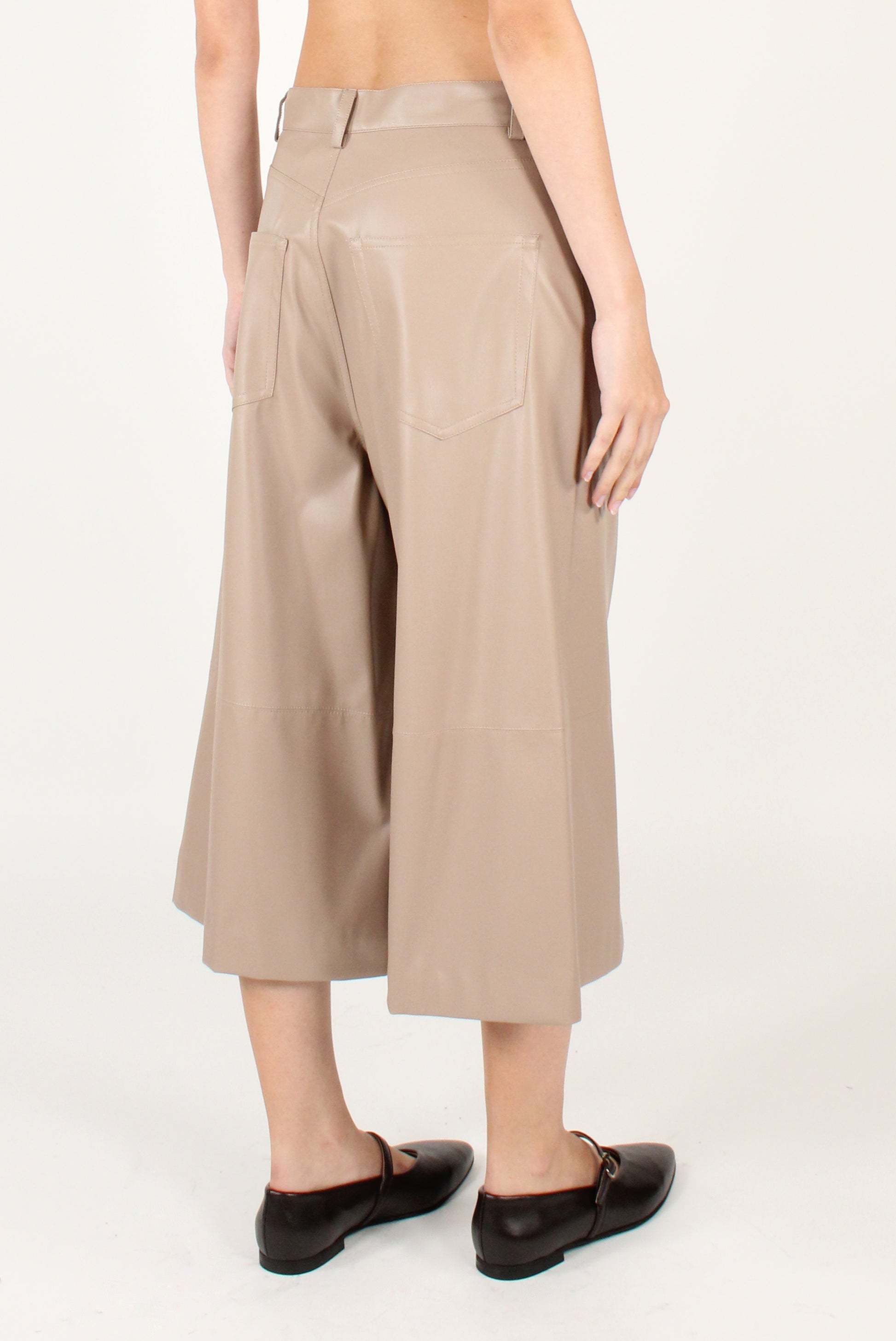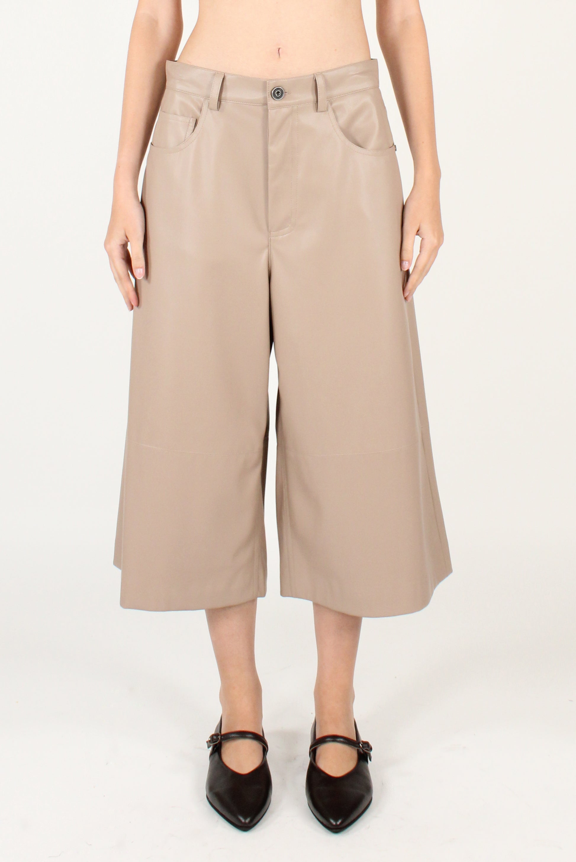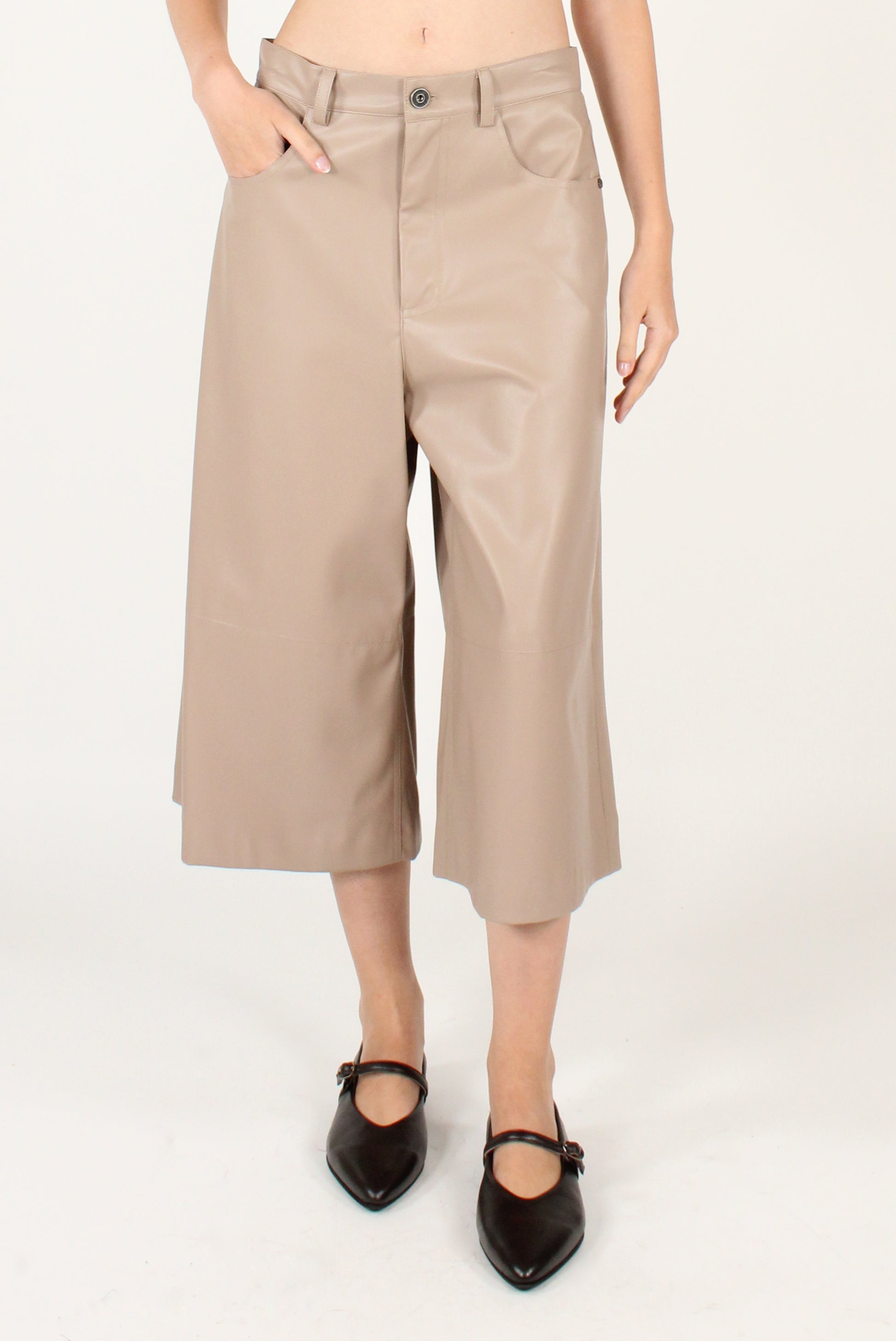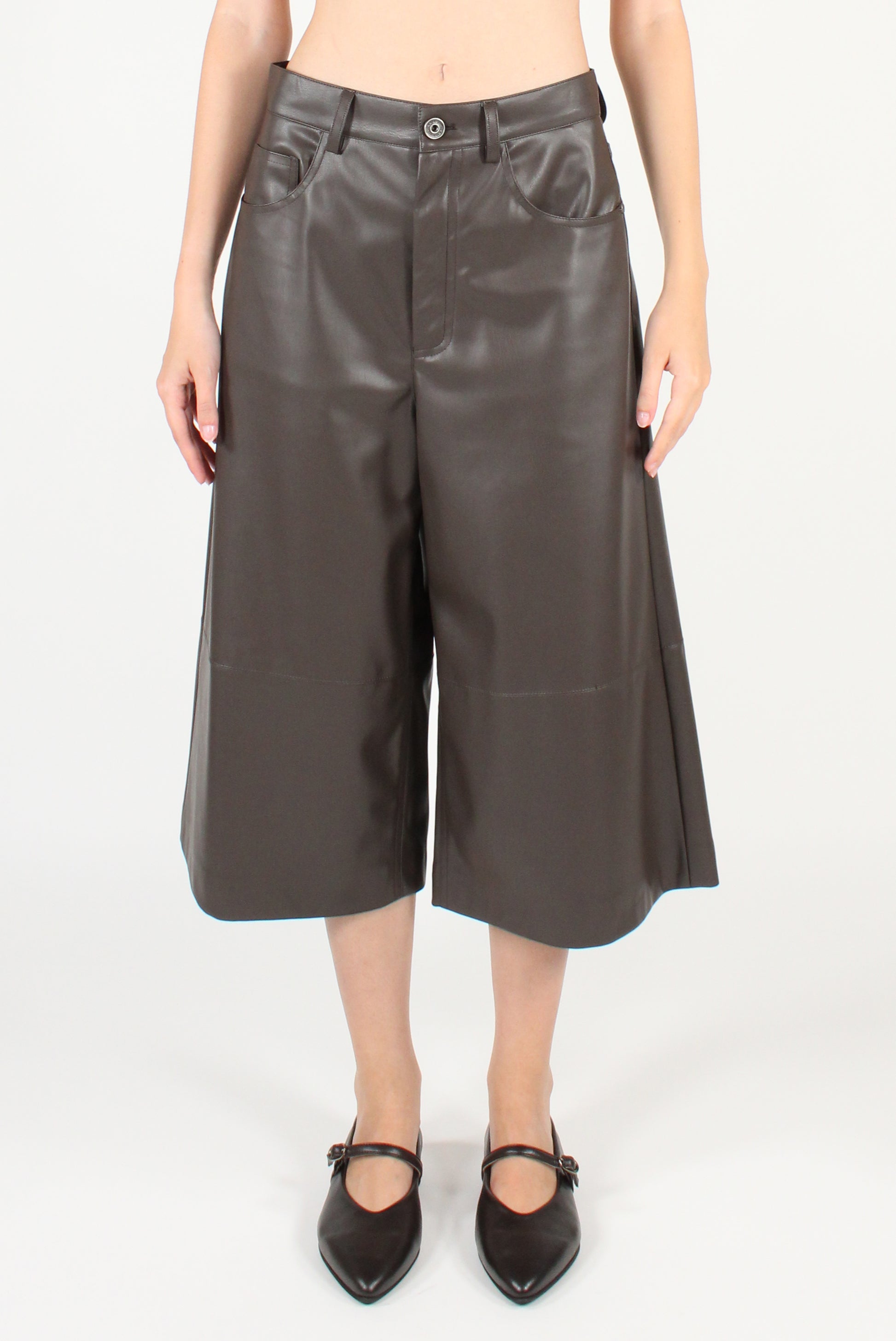 Bermuda in ecopelle. Cinque tasche con allacciatura a zip e bottone, con passanti e dettaglio cucitura.