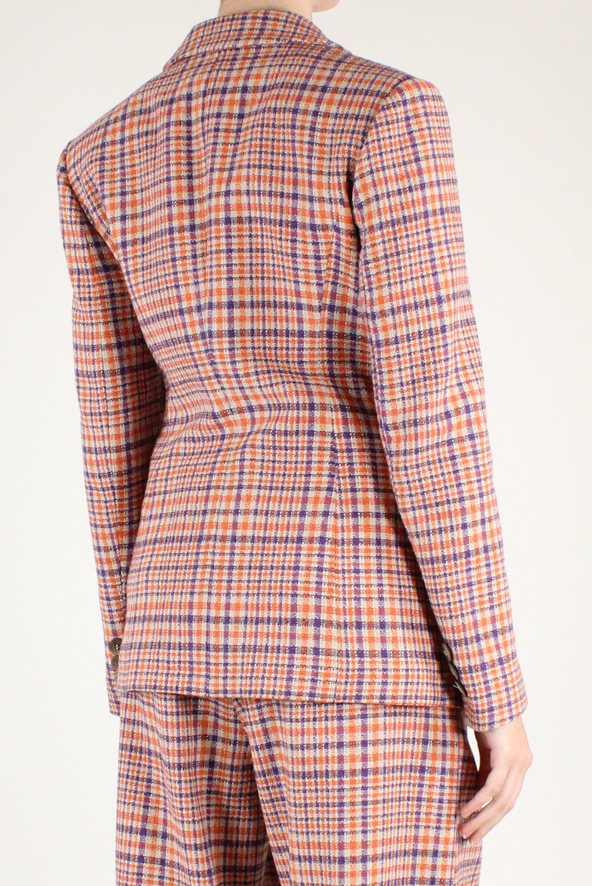 Blazer doppiopetto in tartan. Revers a lancia, con tasche a patta laterali, completamente foderato. Pantaloni coordinati disponibili.