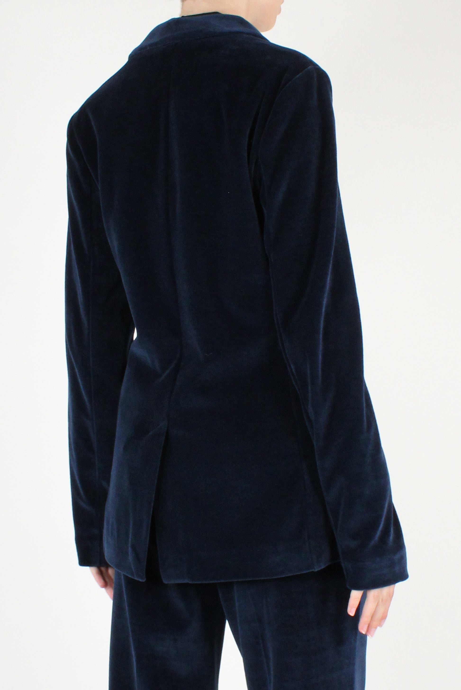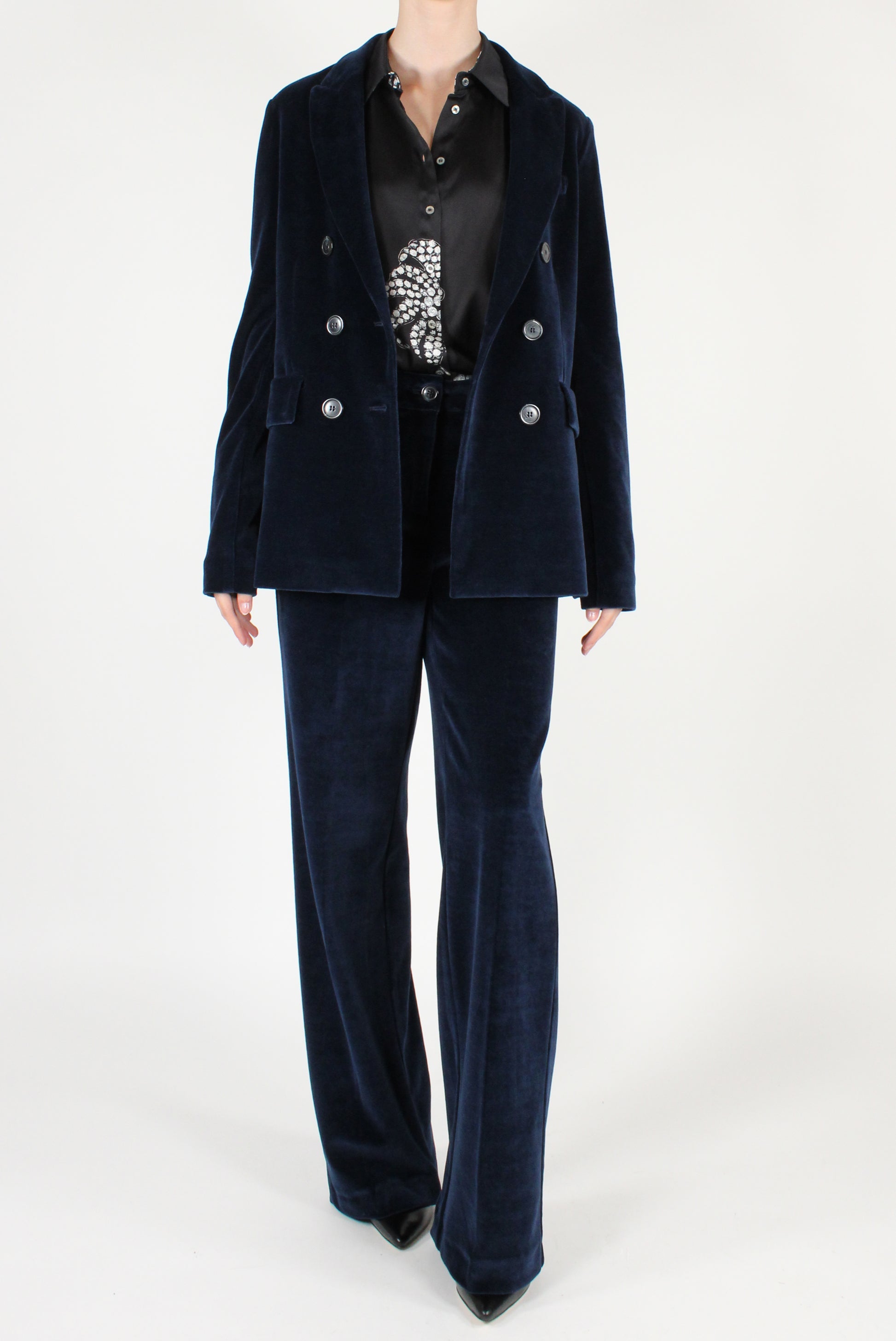 Blazer doppiopetto in velluto liscio. Con revers a lancia, a maniche lunghe con allacciatura a bottoni, tasche a patta e taschino a filetto sul lato sinistro. Taglio sciancrato con spacco sul retro, semi foderato. Pantaloni coordinati disponibili.