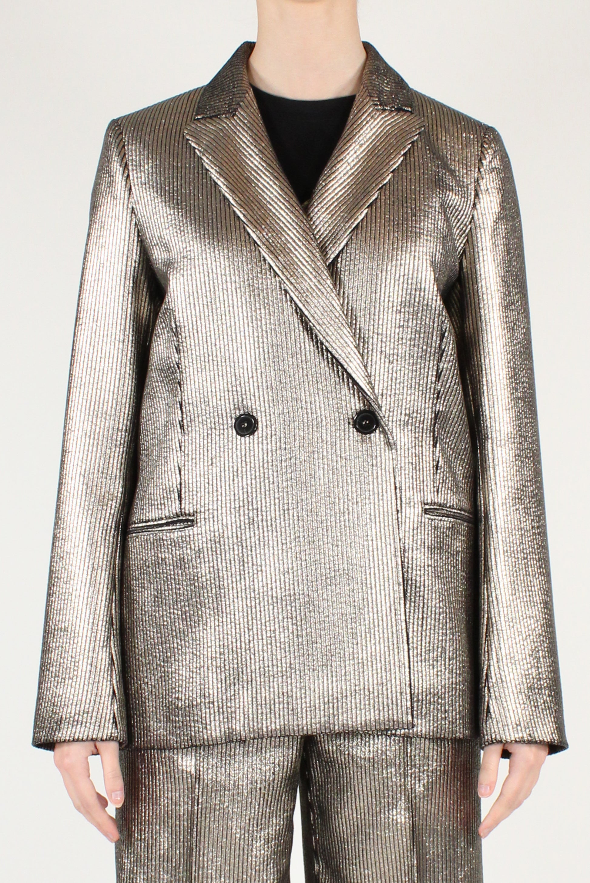 Blazer in velluto a coste metallizzato. Doppiopetto, revers a lancia, con tasche a filetto. Sciancrato, completamente foderato. Pantaloni coordinati disponibili.