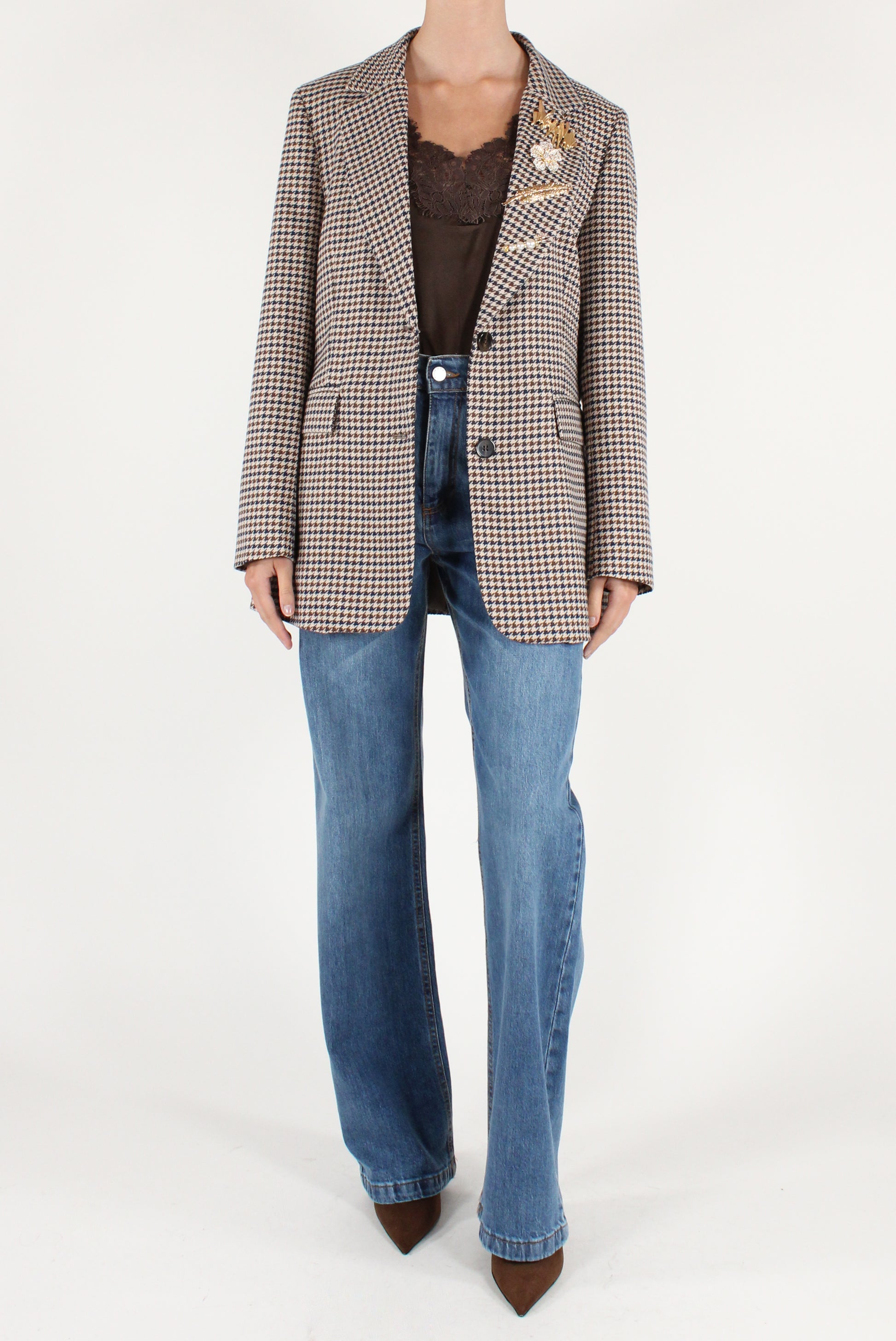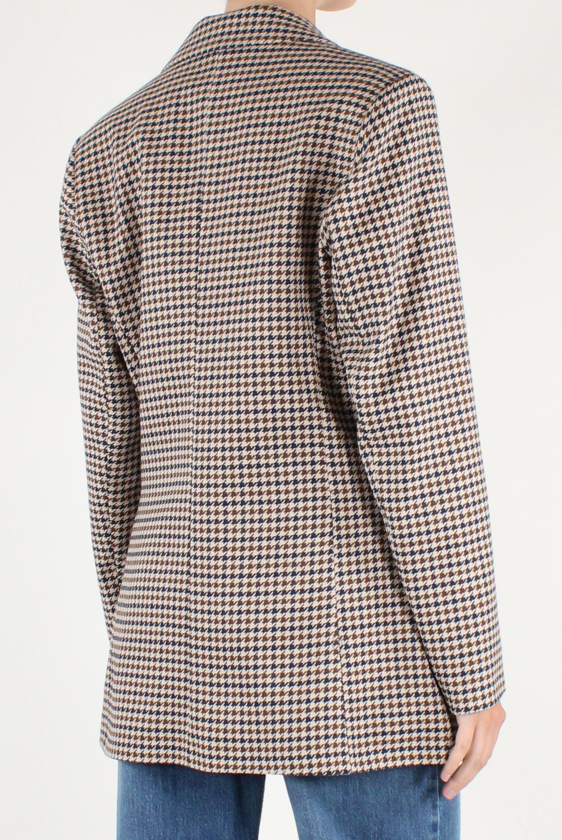 Blazer monopetto fantasia pied de poule con spille incluse variabili e removibili. Revers classici, allacciatura a doppio bottone, con tasche a patta laterali. Spalline strutturate, leggermente elasticizzato. Completamente foderato.