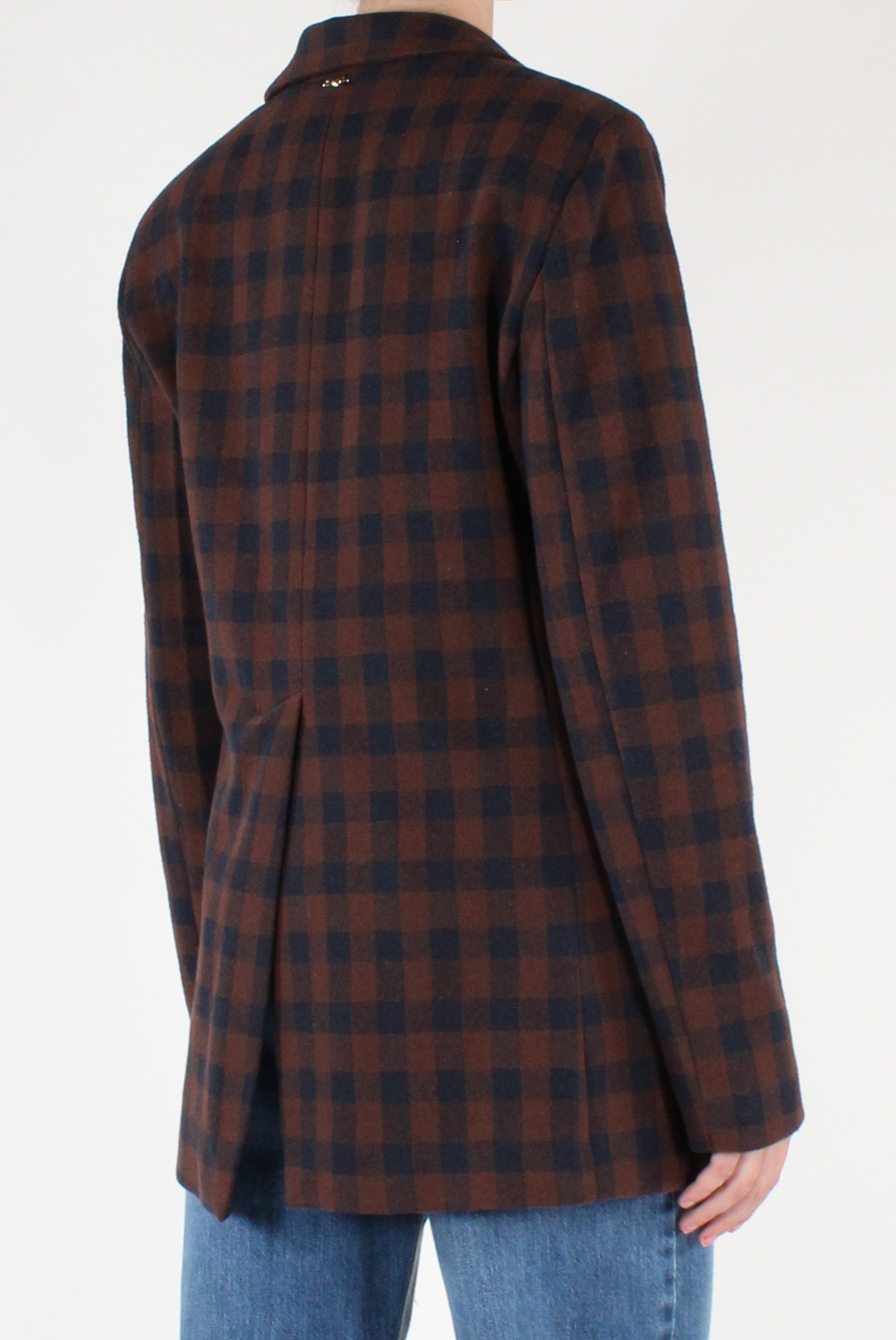 Blazer monopetto a quadri bicolore. Revers a lancia, con allacciatura a bottone e tasche a patta. Completamente foderato.