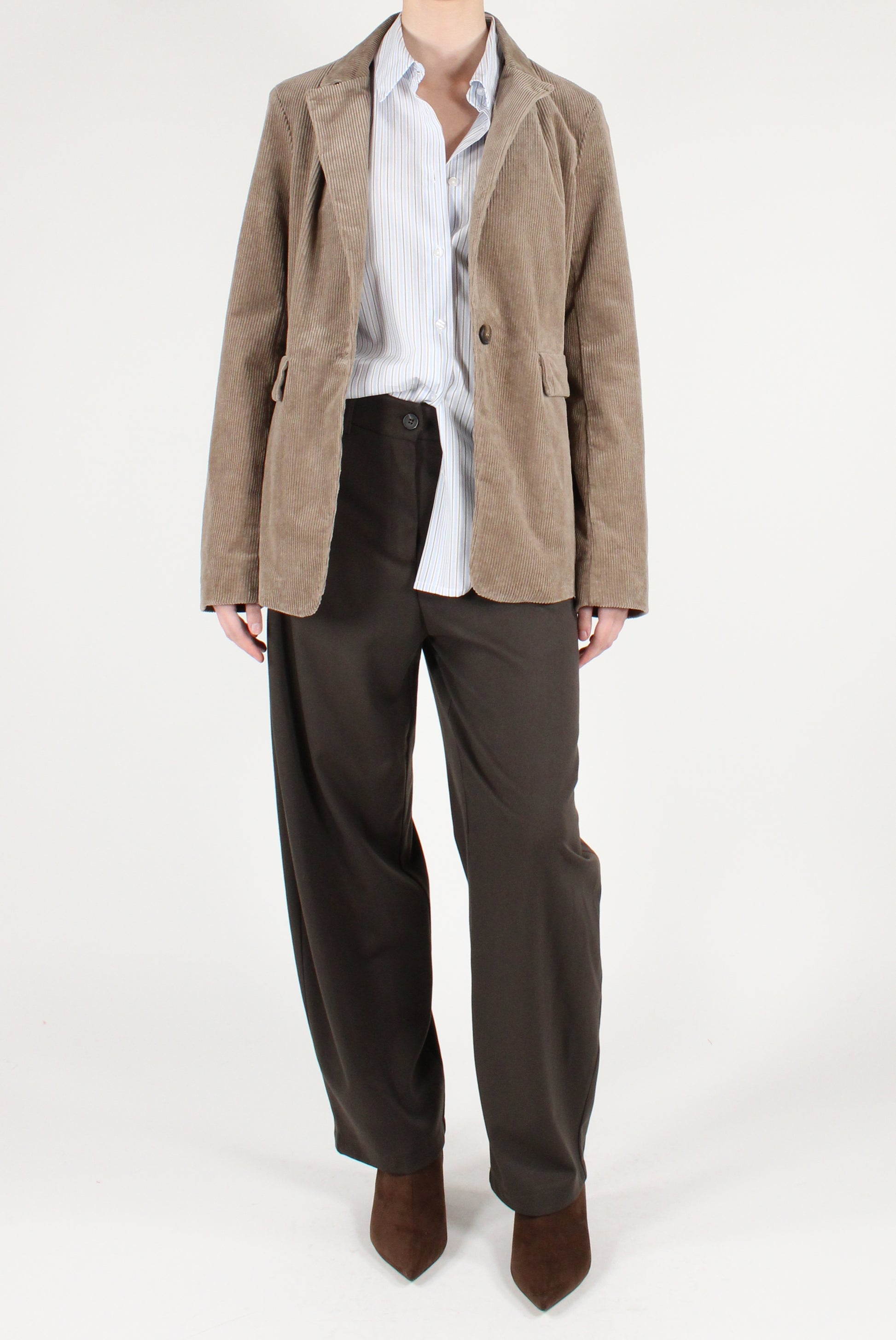 Blazer monopetto in velluto a coste. Revers classici, a maniche lunghe con allacciatura mono bottone. Con tasche a patta laterali, dettaglio spacco sul retro, completamente foderato.
