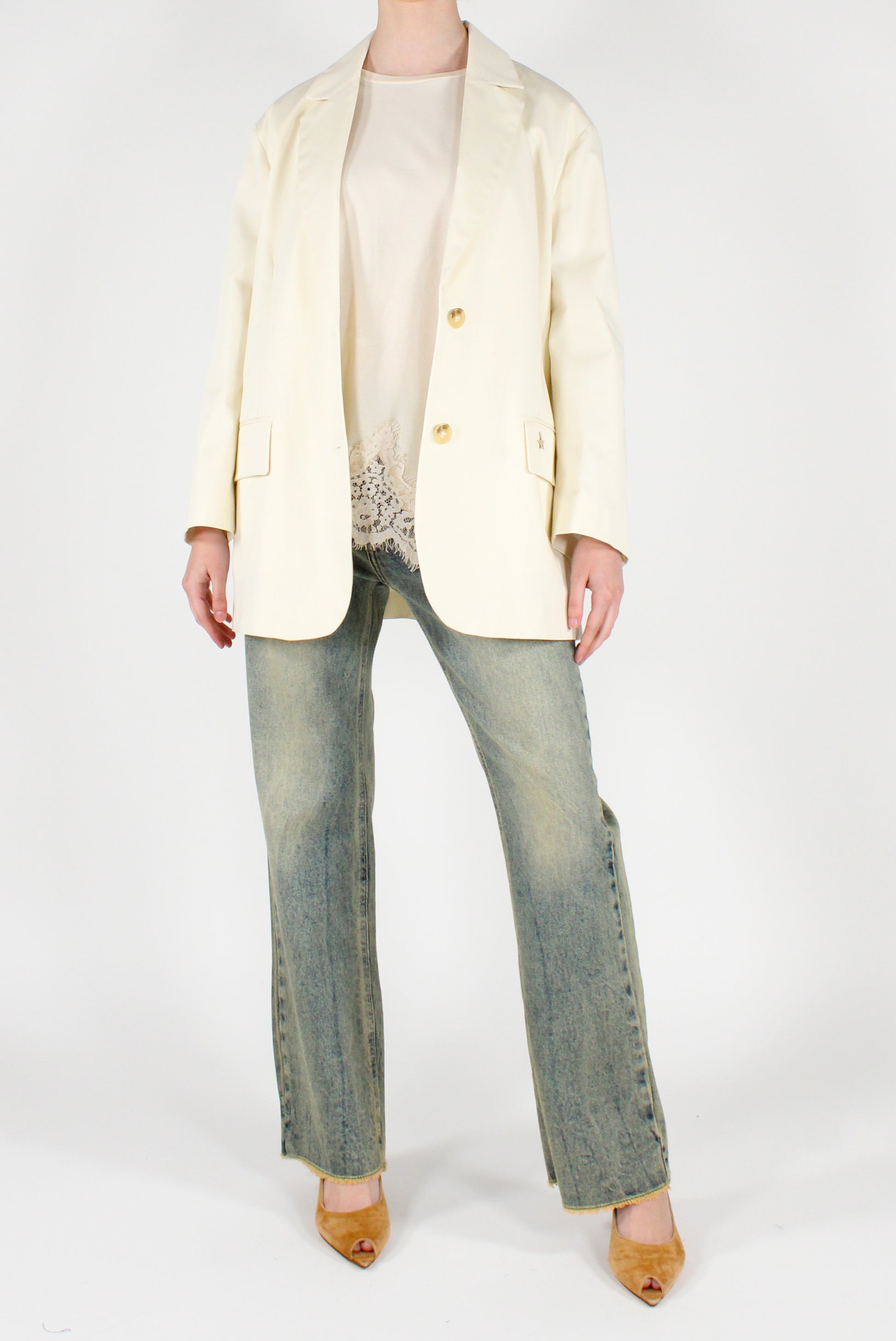 Blazer monopetto da donna in cotone leggermente elasticizzato. Modello over con revers classici, maniche lunghe e chiusura con bottoni. Tasche a patta e spalle scese per una linea rilassata e contemporanea. Sfoderato, ideale per la mezza stagione.
