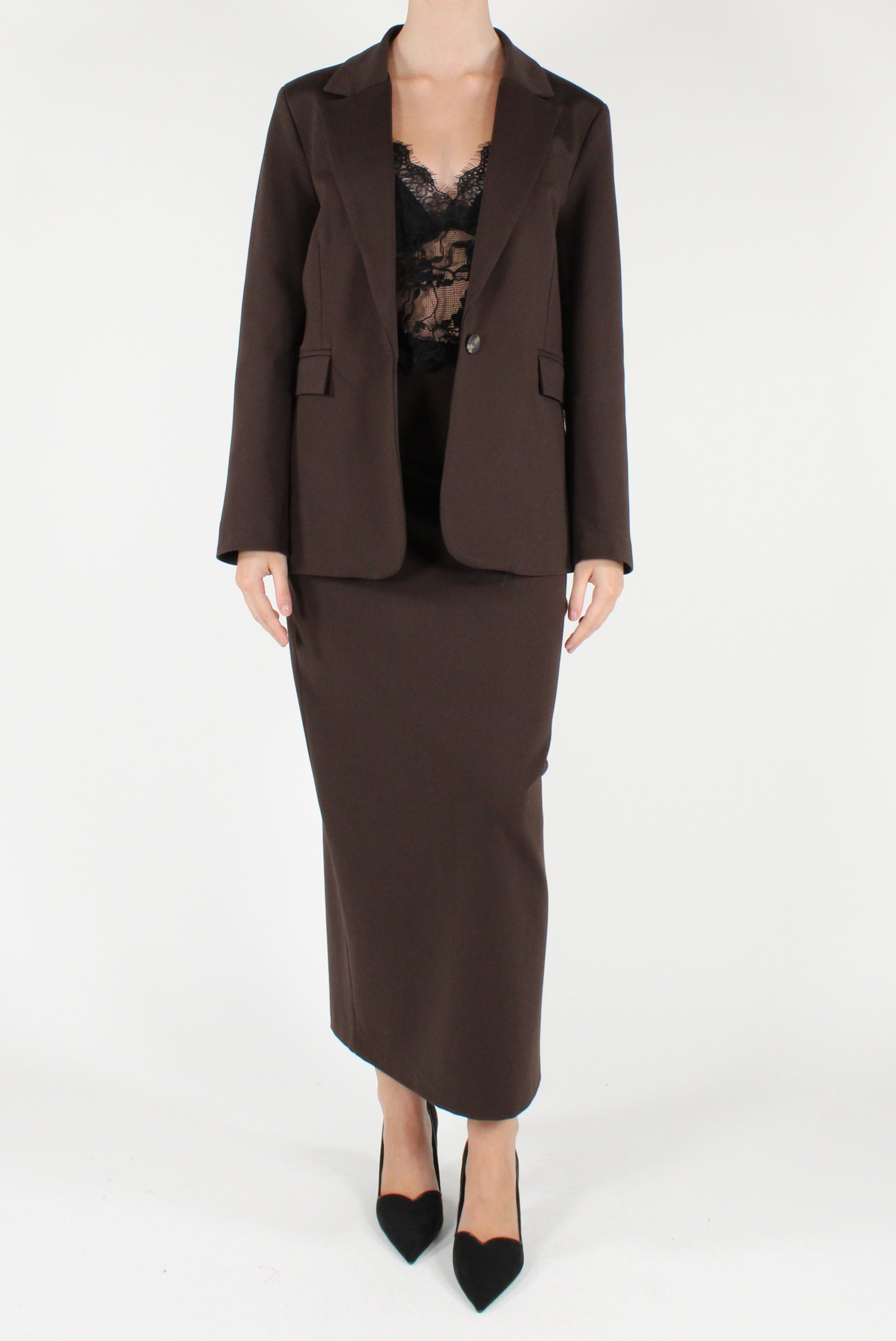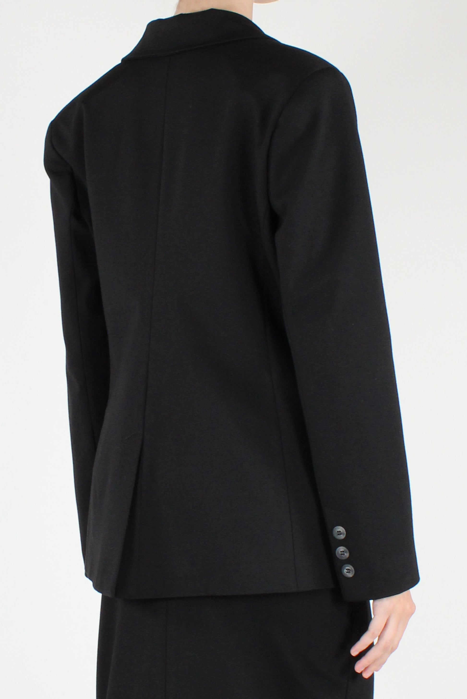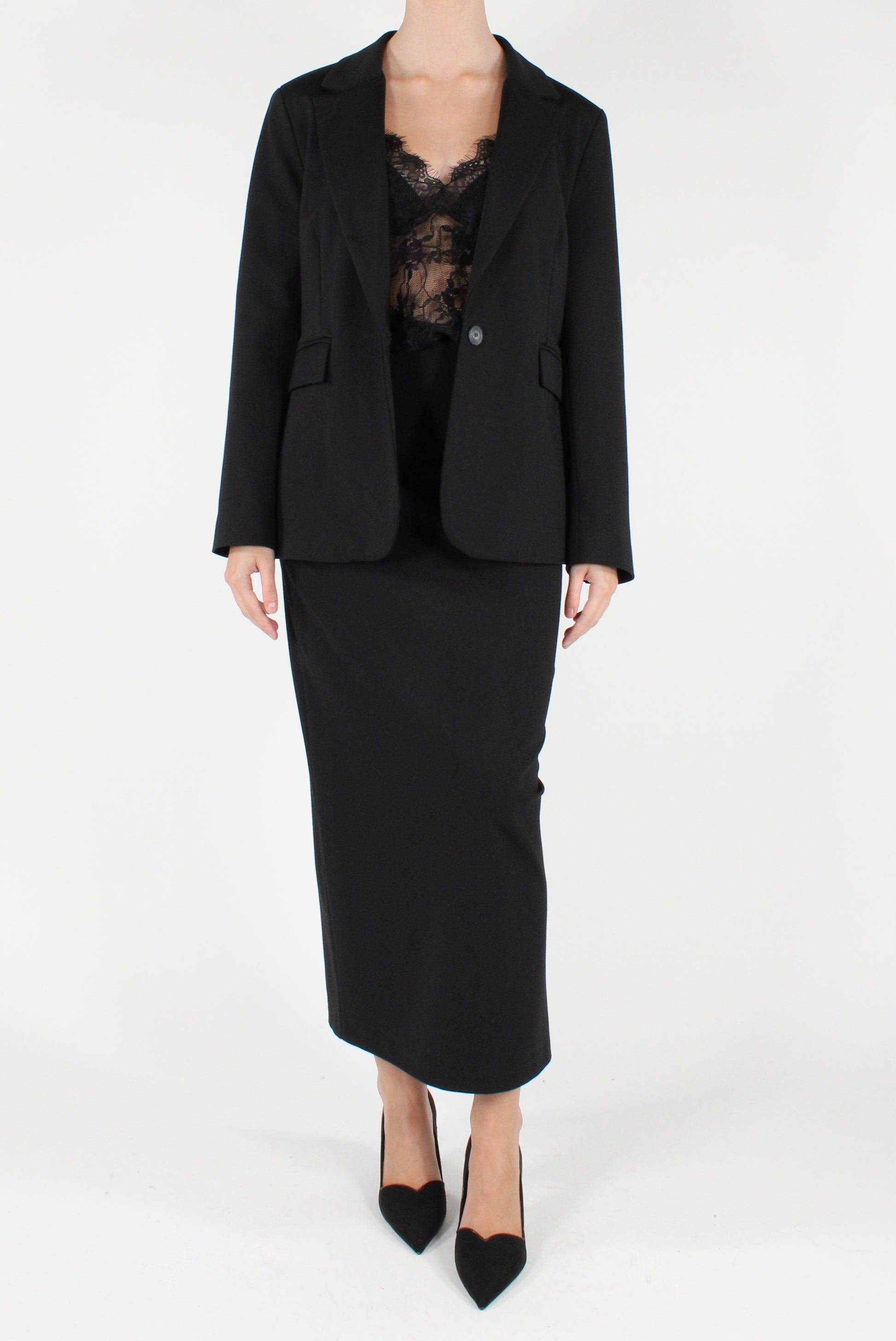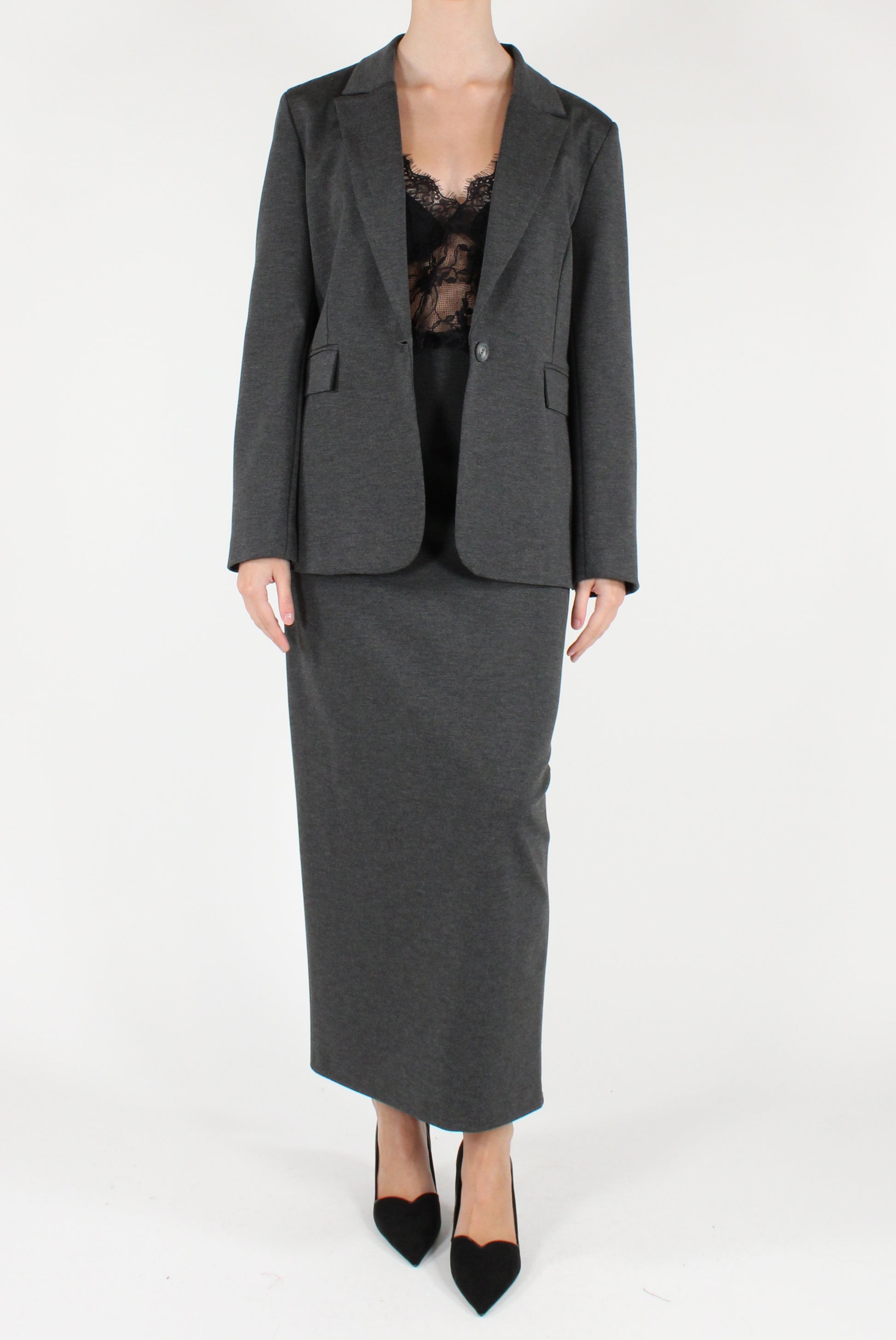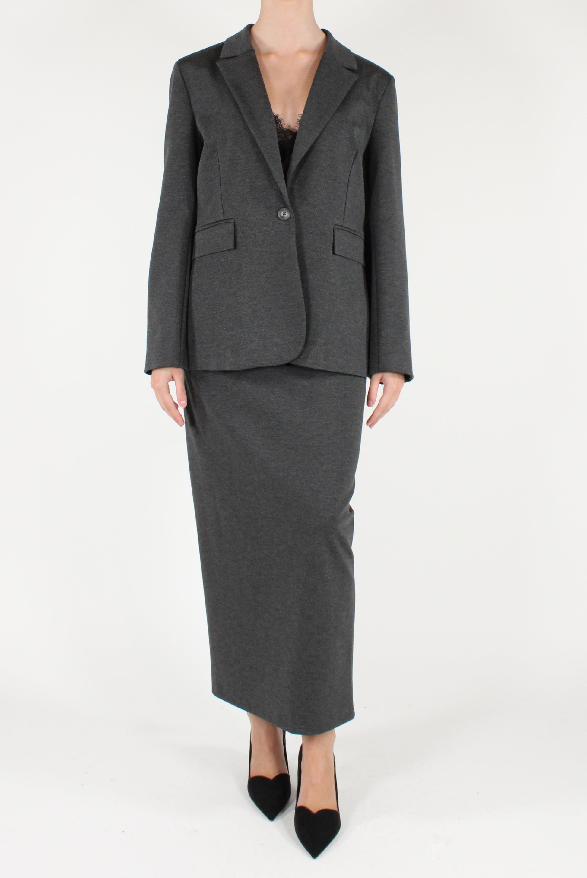 Blazer monopetto slim fit in punto Milano. Elasticizzato, revers a lancia con allacciatura mono bottone e finte tasche a patta. Completamente foderato, con spacco sul retro. Gonna a tubino coordinata disponibile.