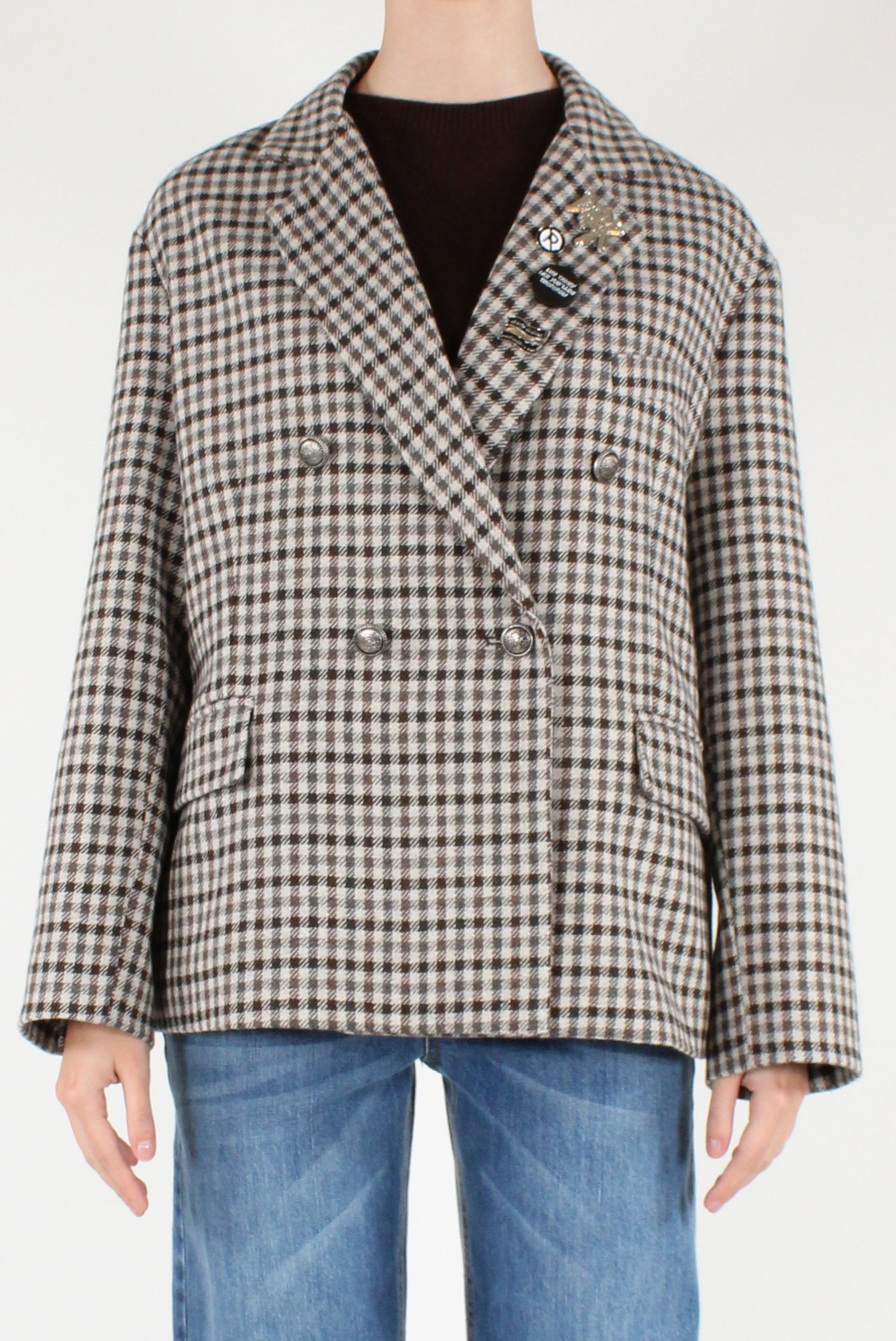 Blazer over doppiopetto a quadretti in misto lana con spille incluse variabili e removibili. Revers classici, allacciatura a due bottoni con stemma, con tasche a patta laterali. Completamente foderato.