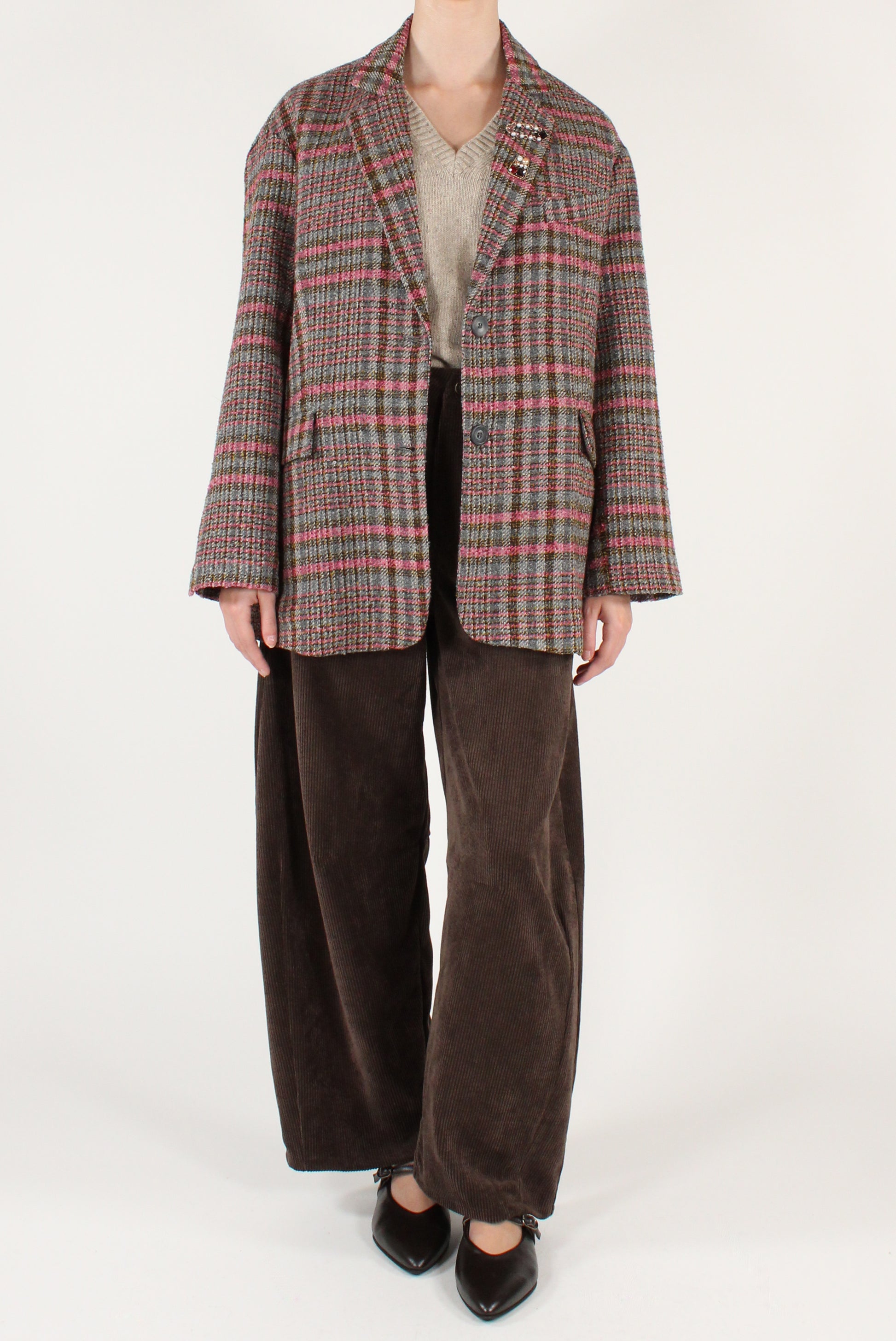 Blazer over in tartan multicolore con spille incluse variabili e removibili. Monopetto, a maniche lunghe con allacciatura a bottone. Con tasche a patta e dettaglio finto taschino davanti. Taglio over a spalle scese, con spacchi laterali, completamente foderata.