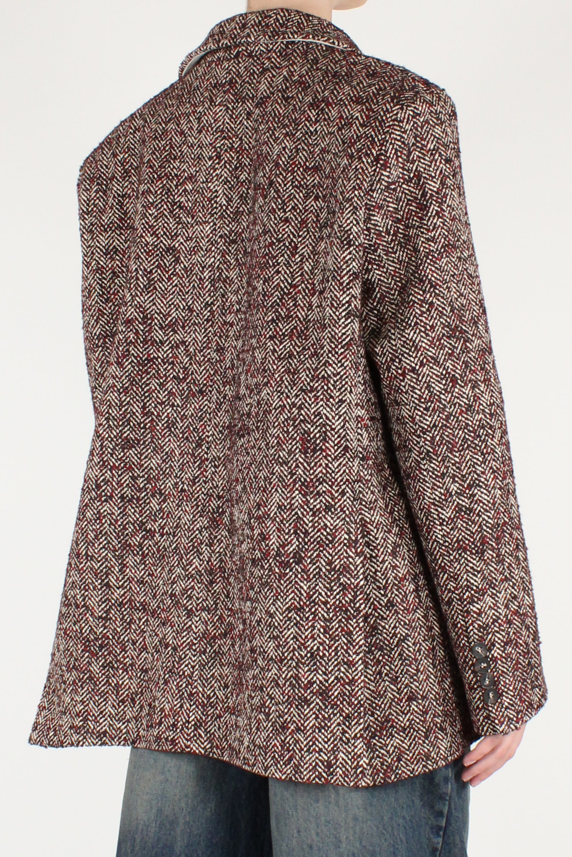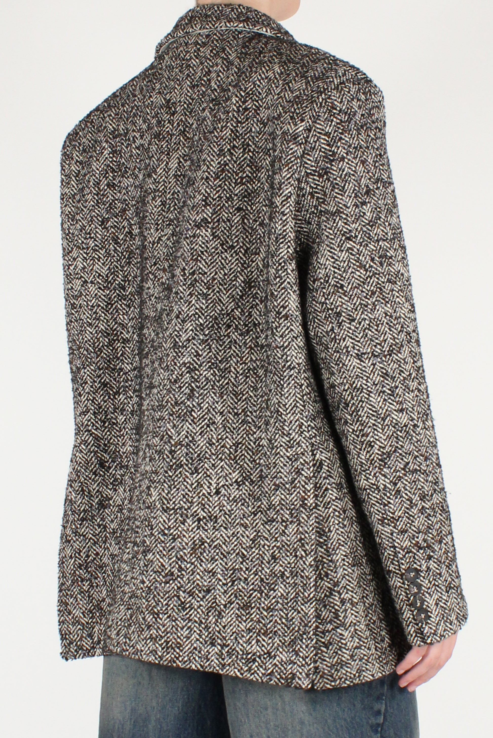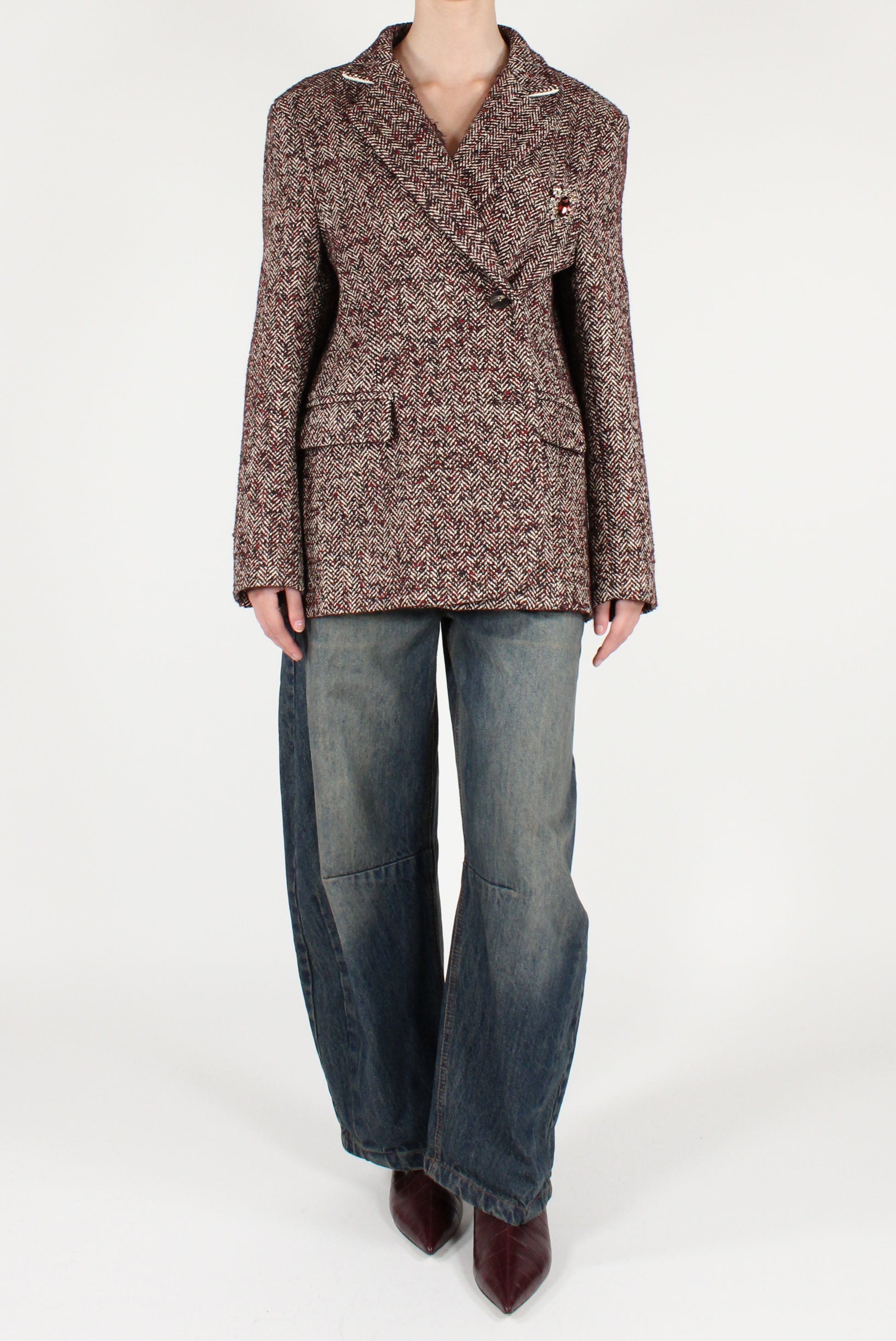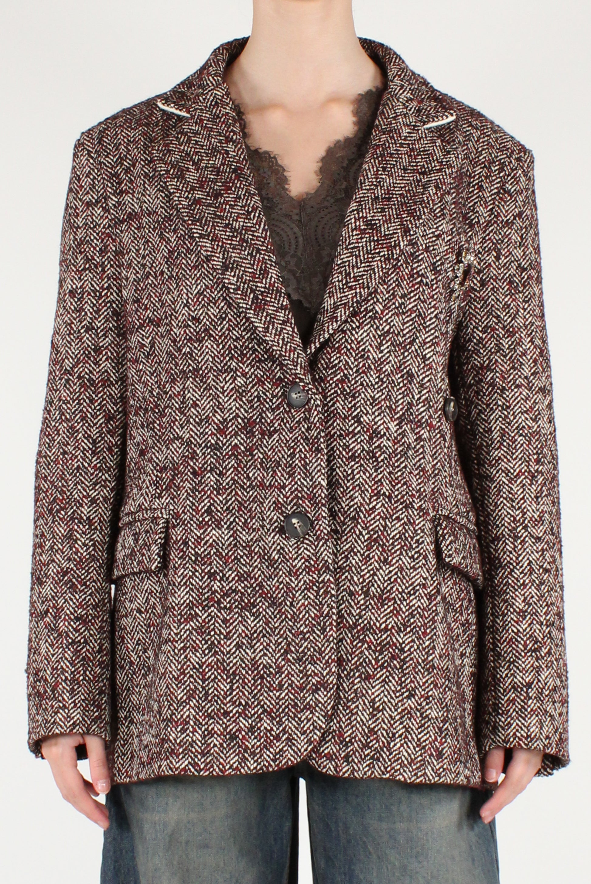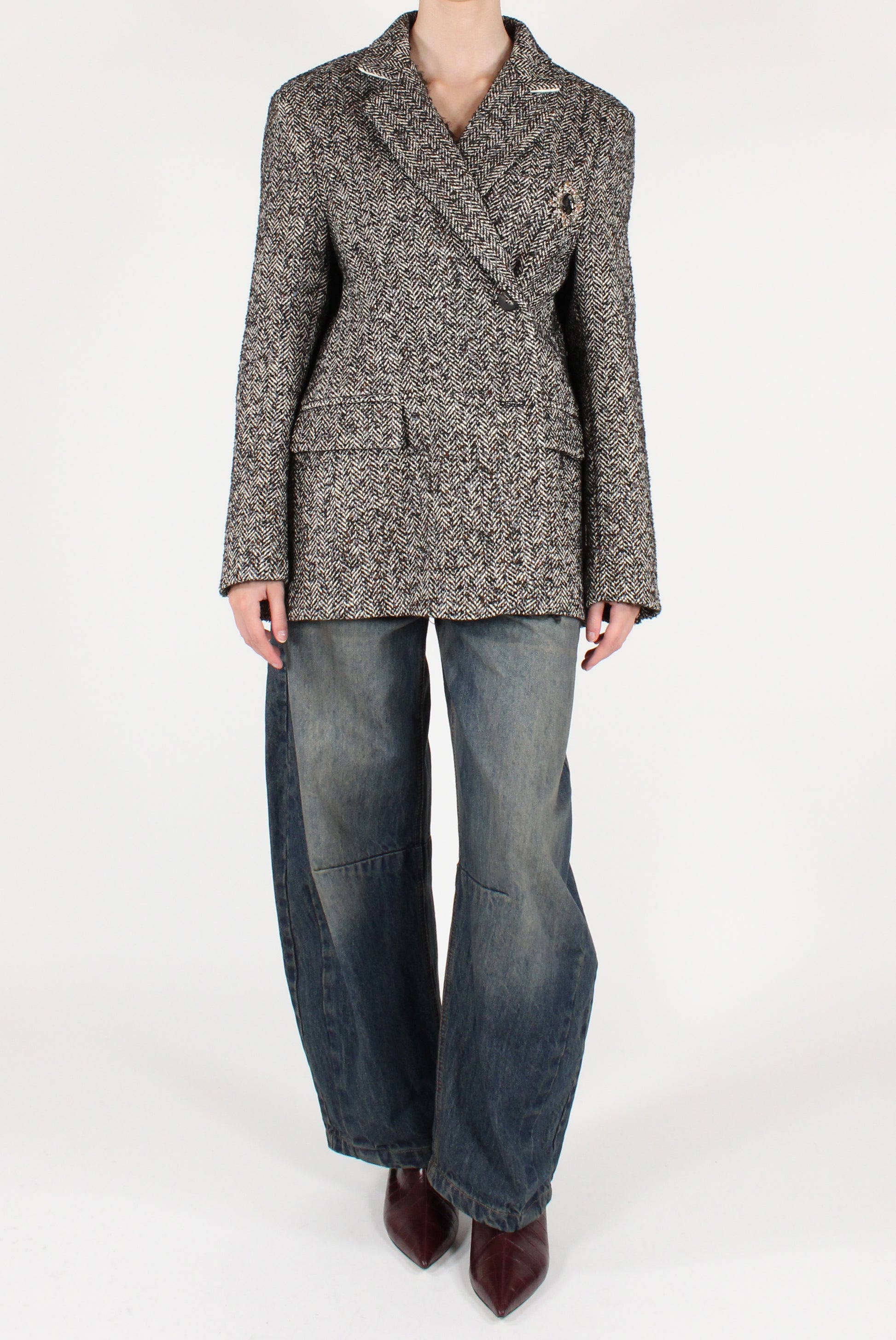 Blazer over spigato con spilla inclusa variabile e removibile. Con revers a lancia, allacciatura a bottoni e bottone ulteriore per rendere la vestibilità più sciancrata. Con tasche laterali a patta, taschino sul davanti e spalline strutturate. Completamente foderato, con spacchi laterali.