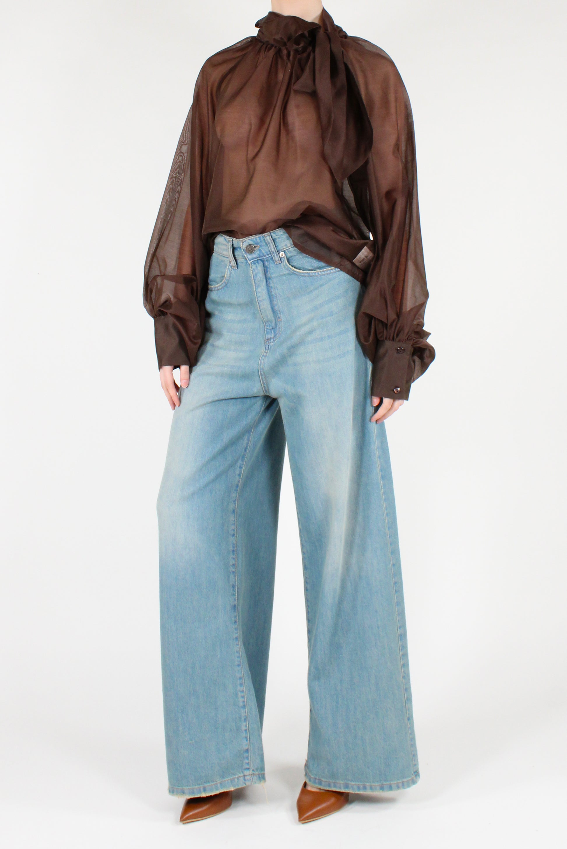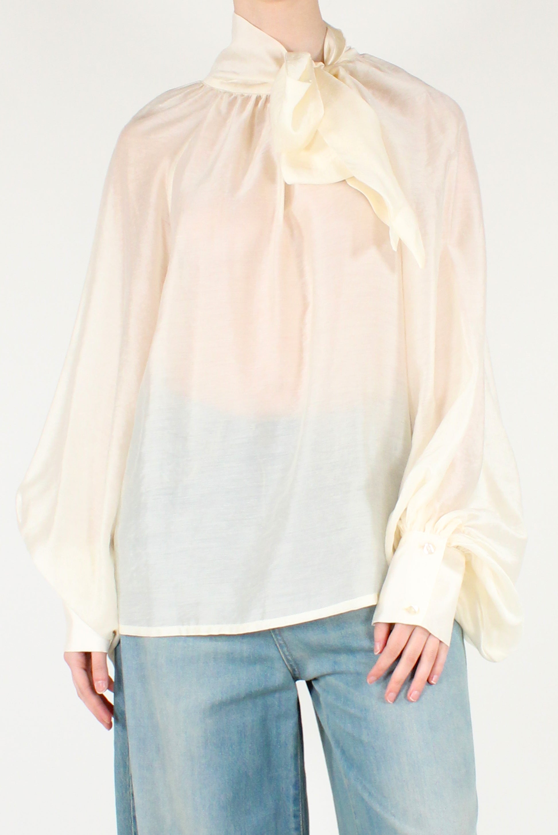 Blusa over da donna in mussola misto lyocell, leggera e fluida. Modello con fiocco regolabile laterale e maniche lunghe a sbuffo. Linea morbida e contemporanea, perfetta per look femminili e versatili.