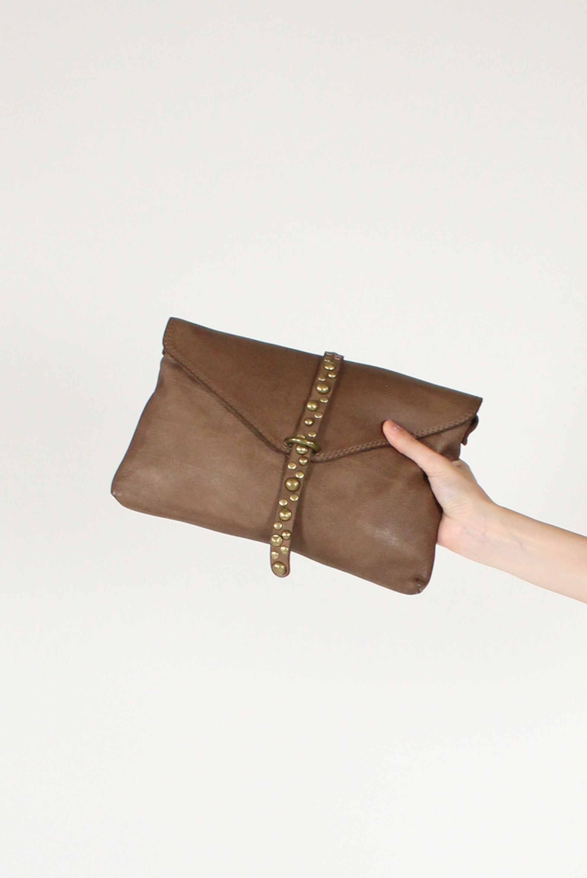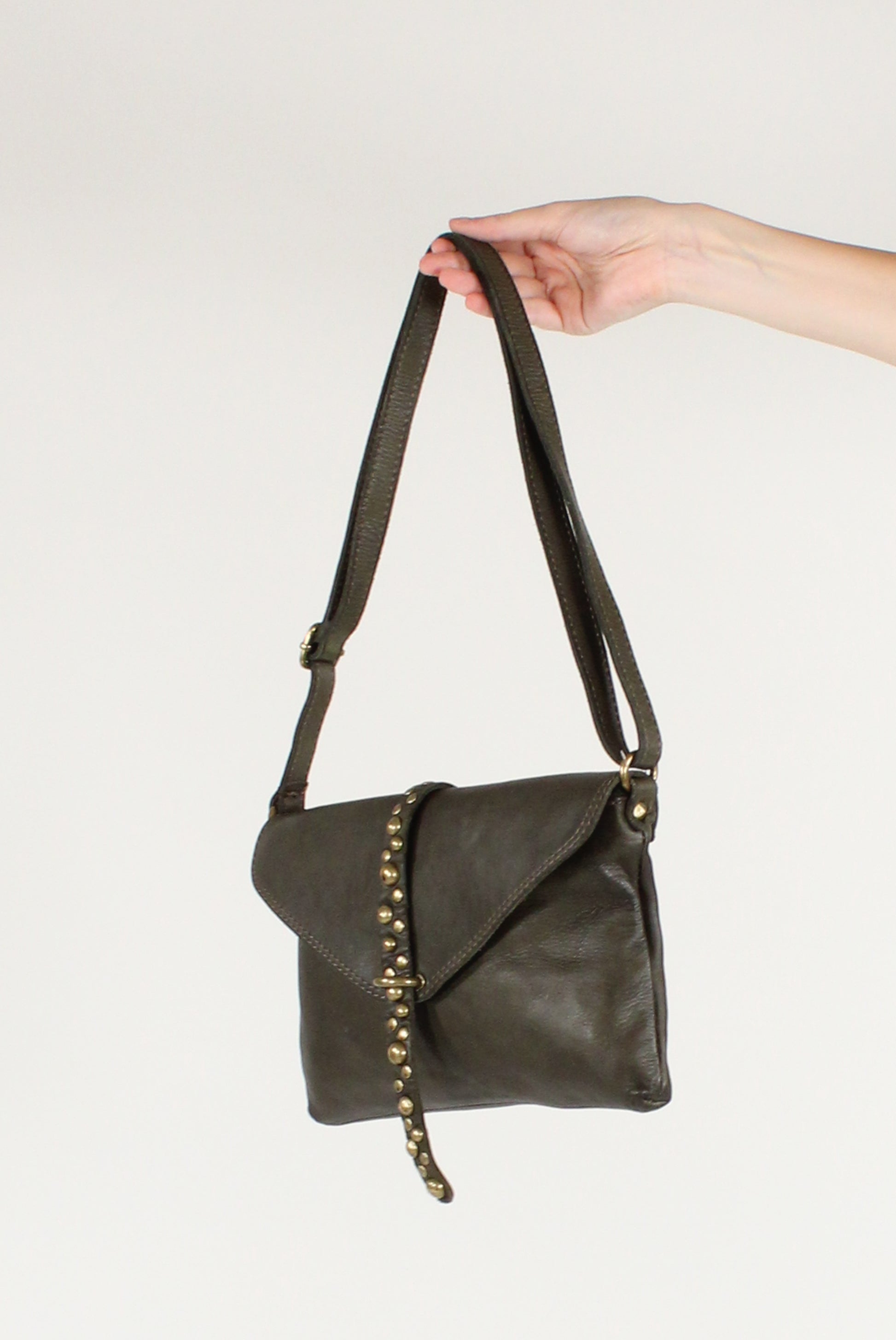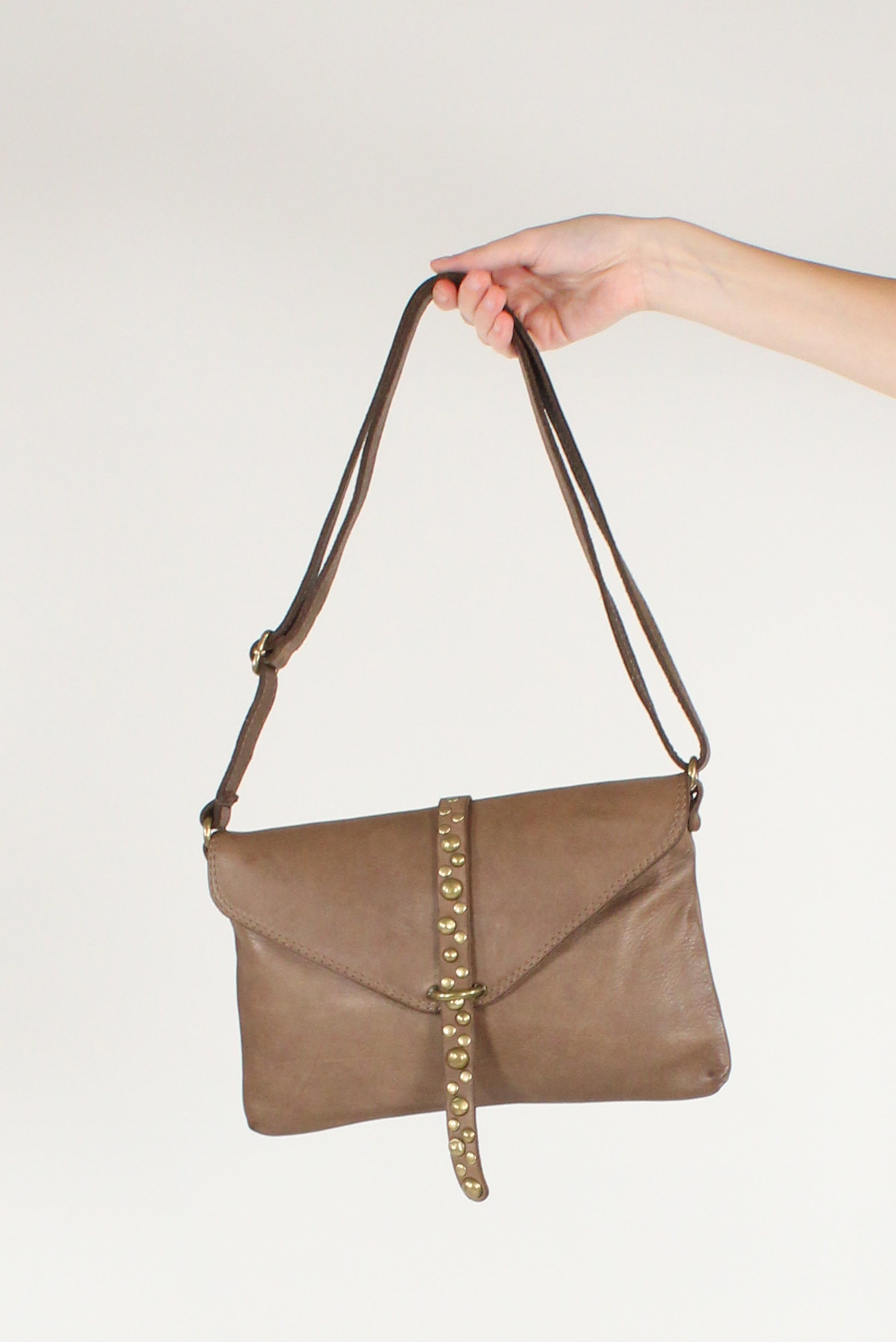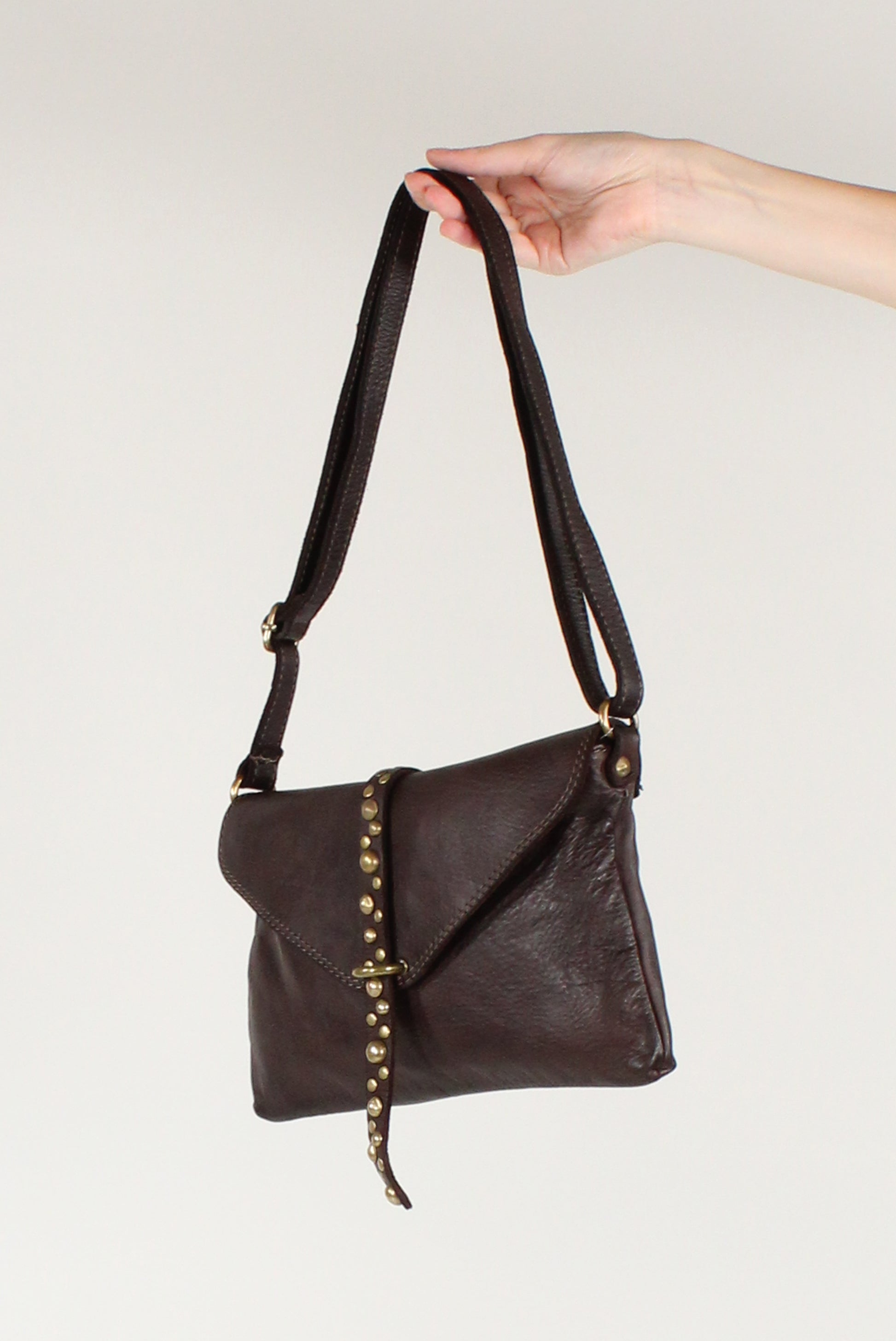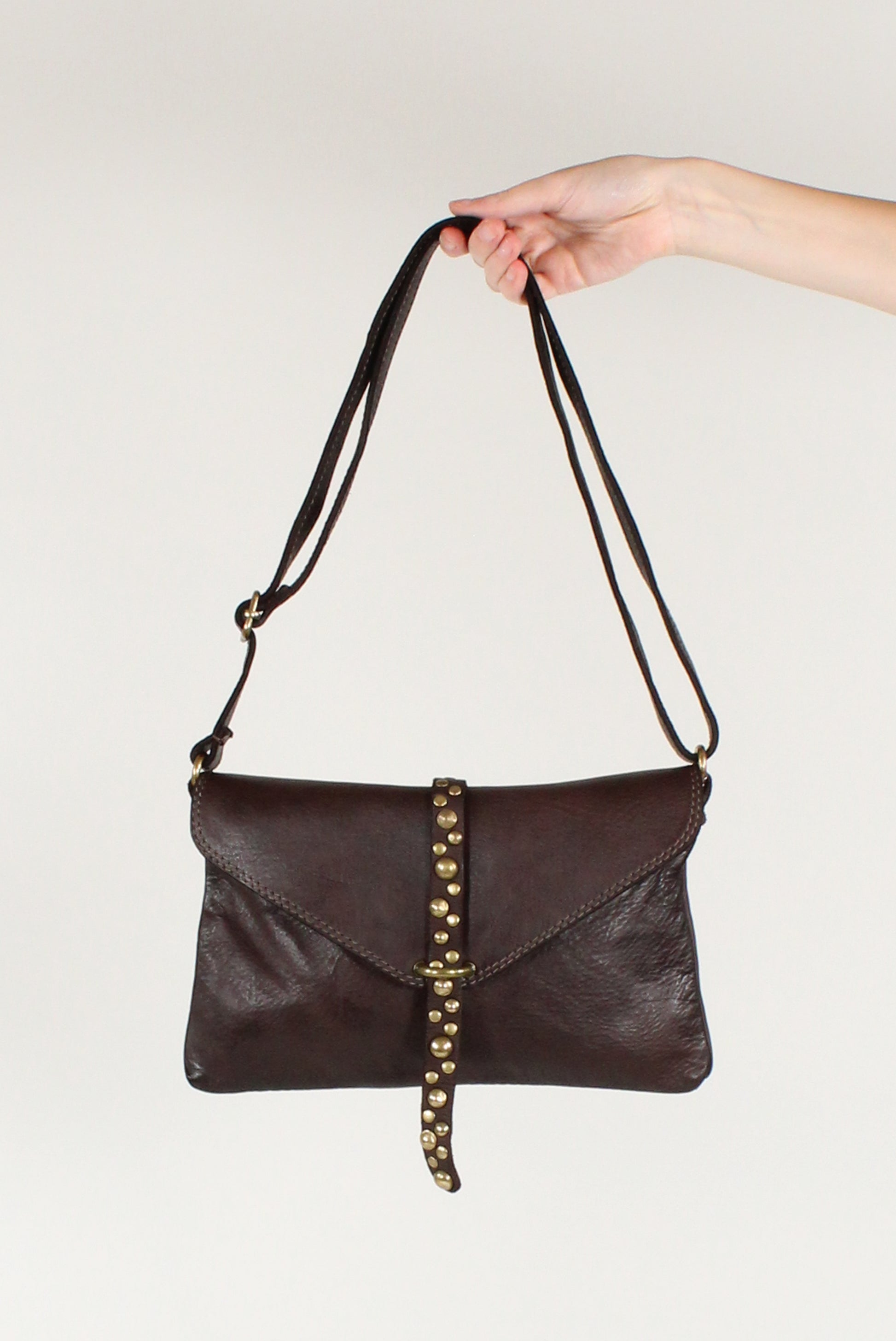 Borsetta in pelle con chiusura a patta modello busta da lettere. Con bottone magnetico e fascia borchiata. A uno scomparto, con una tasca interna con chiusura a zip e tasca sul retro, tracolla inclusa regolabile. Dimensioni: 19x29x4 cm.