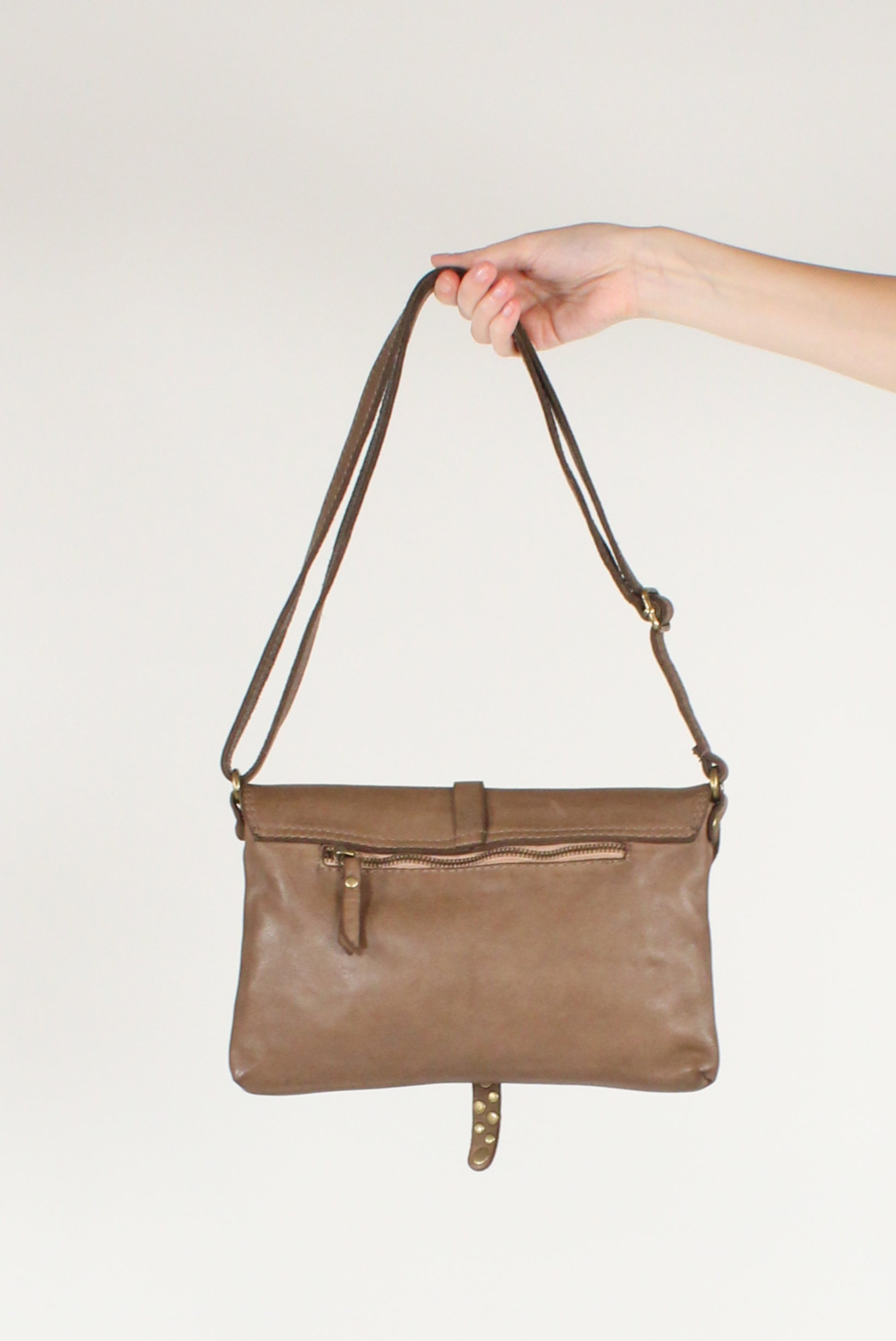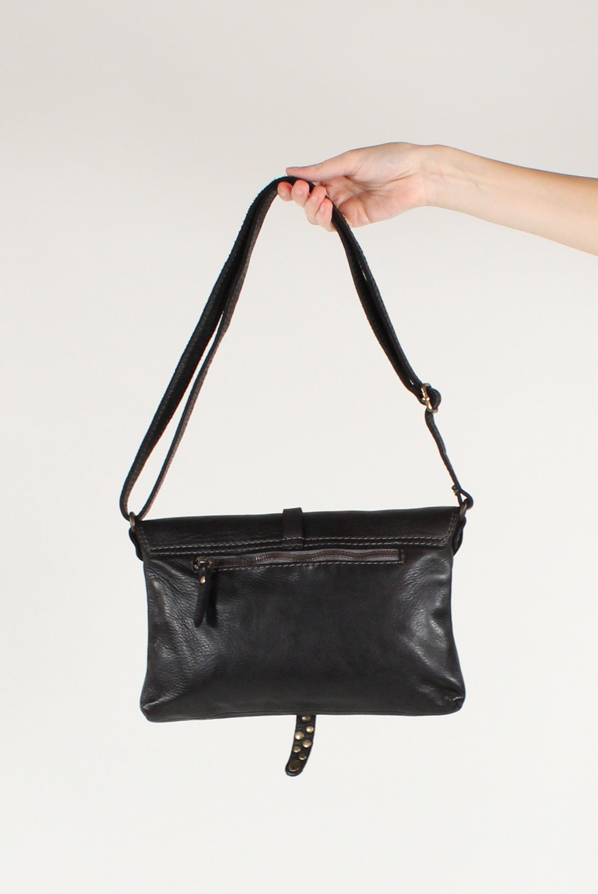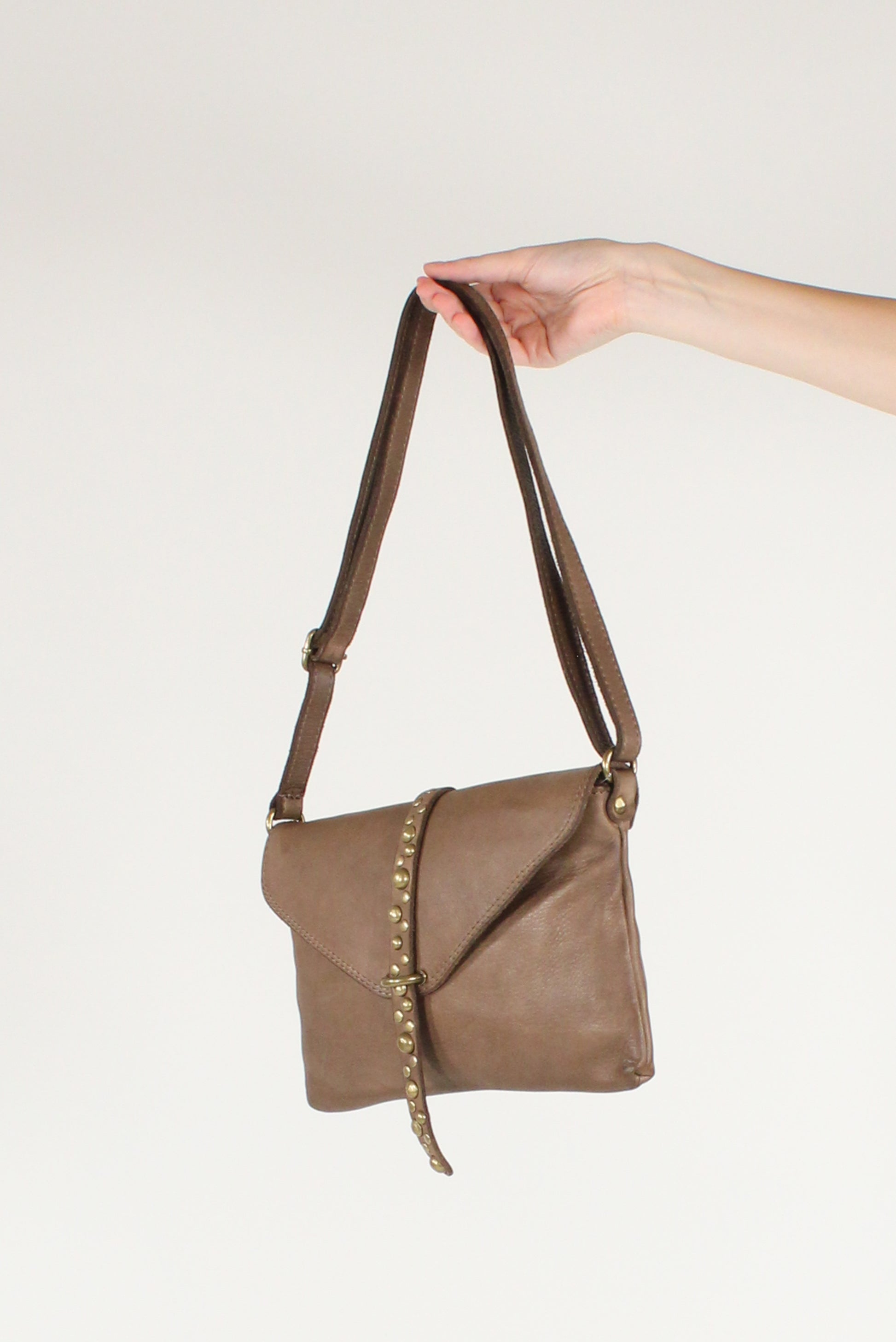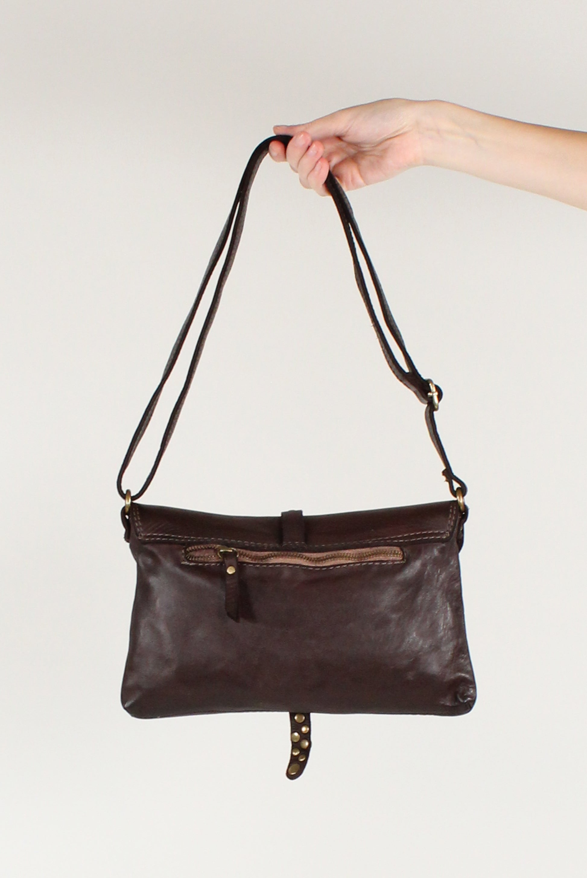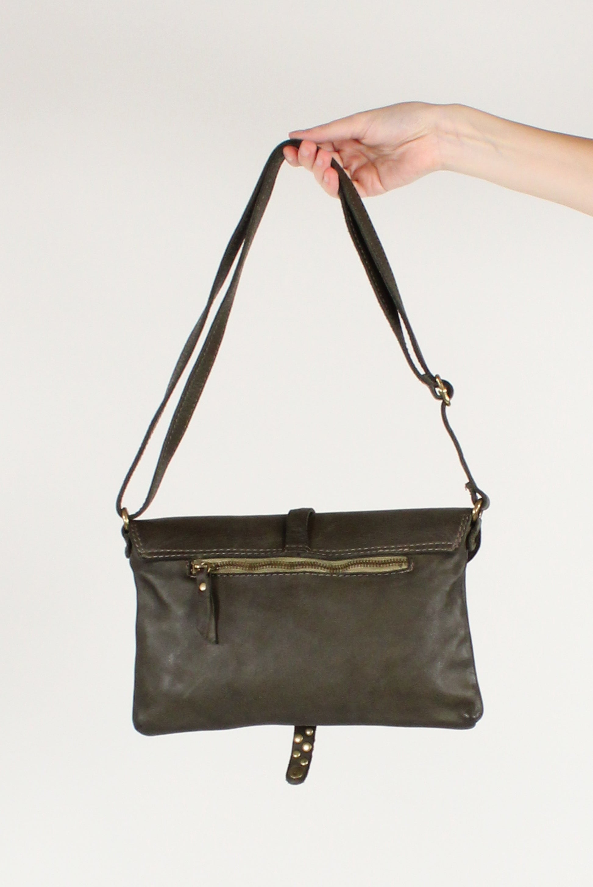 Borsetta in pelle con chiusura a patta modello busta da lettere. Con bottone magnetico e fascia borchiata. A uno scomparto, con una tasca interna con chiusura a zip e tasca sul retro, tracolla inclusa regolabile. Dimensioni: 19x29x4 cm.