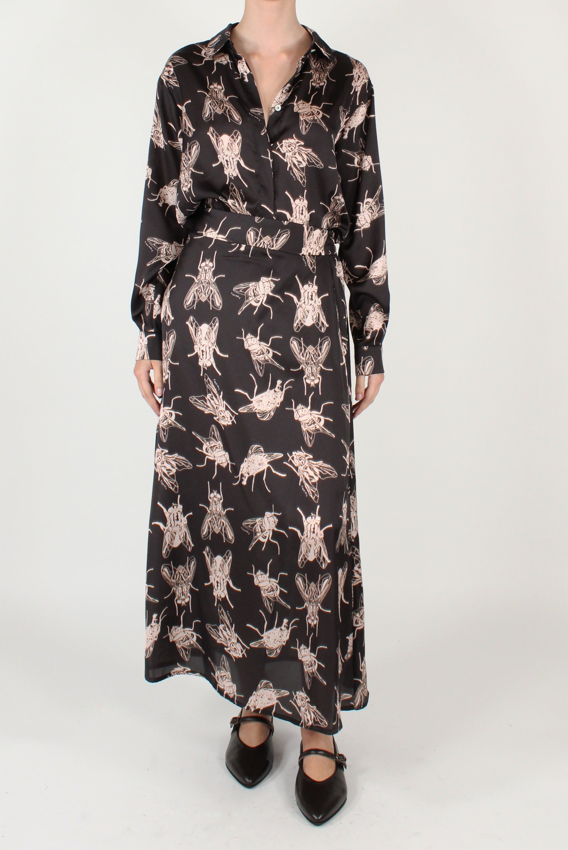 Camicia a maniche lunghe stampa mosche. Colletto classico, allacciatura nascosta con dettaglio bottone. Modello stondato sul fondo, con vestibilità regolare e una pince sul retro. Gonna coordinata disponibile.
