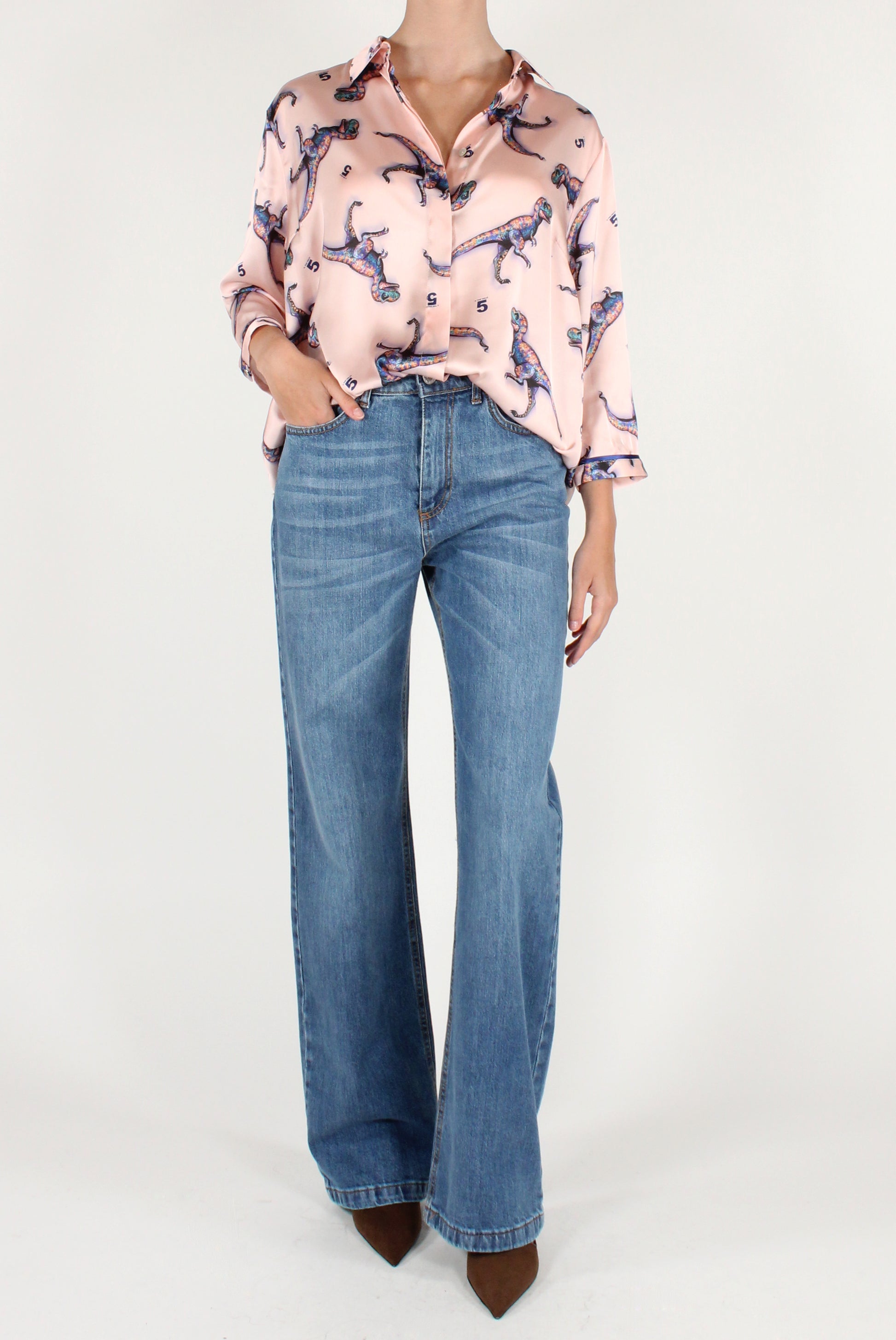 Camicia a maniche a 3/4 stampa t-rex. Colletto classico, allacciatura nascosta con dettaglio bottone. Vestibilità regolare, gonna coordinata disponibile.