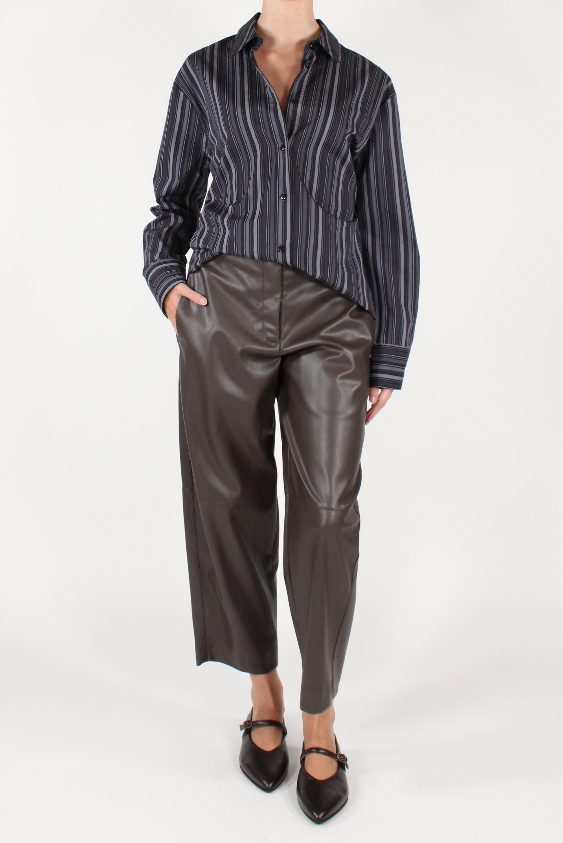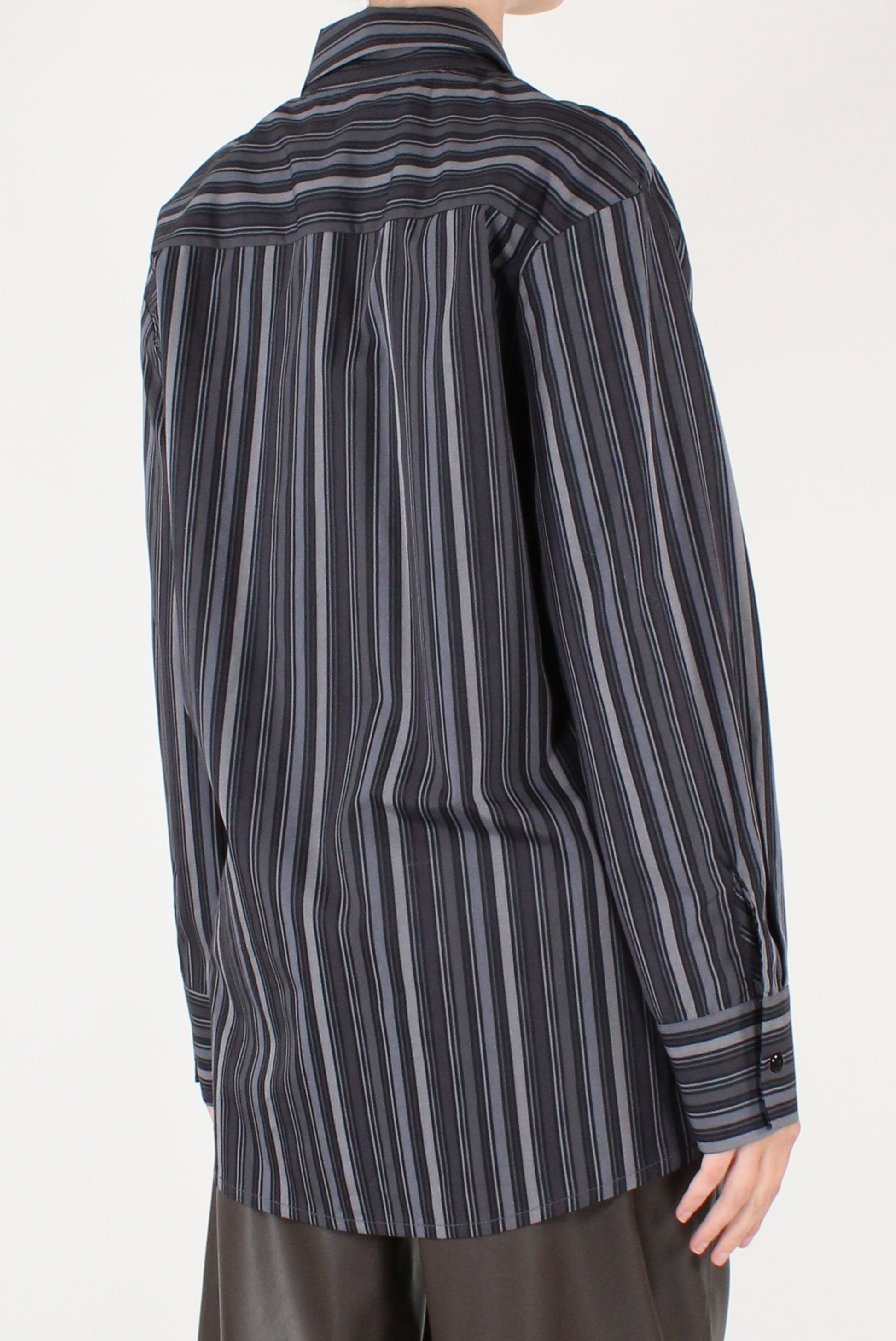 Camicia over a righe in cotone. Colletto classico, a maniche lunghe con allacciatura a bottoni, fondo leggermente stondato.