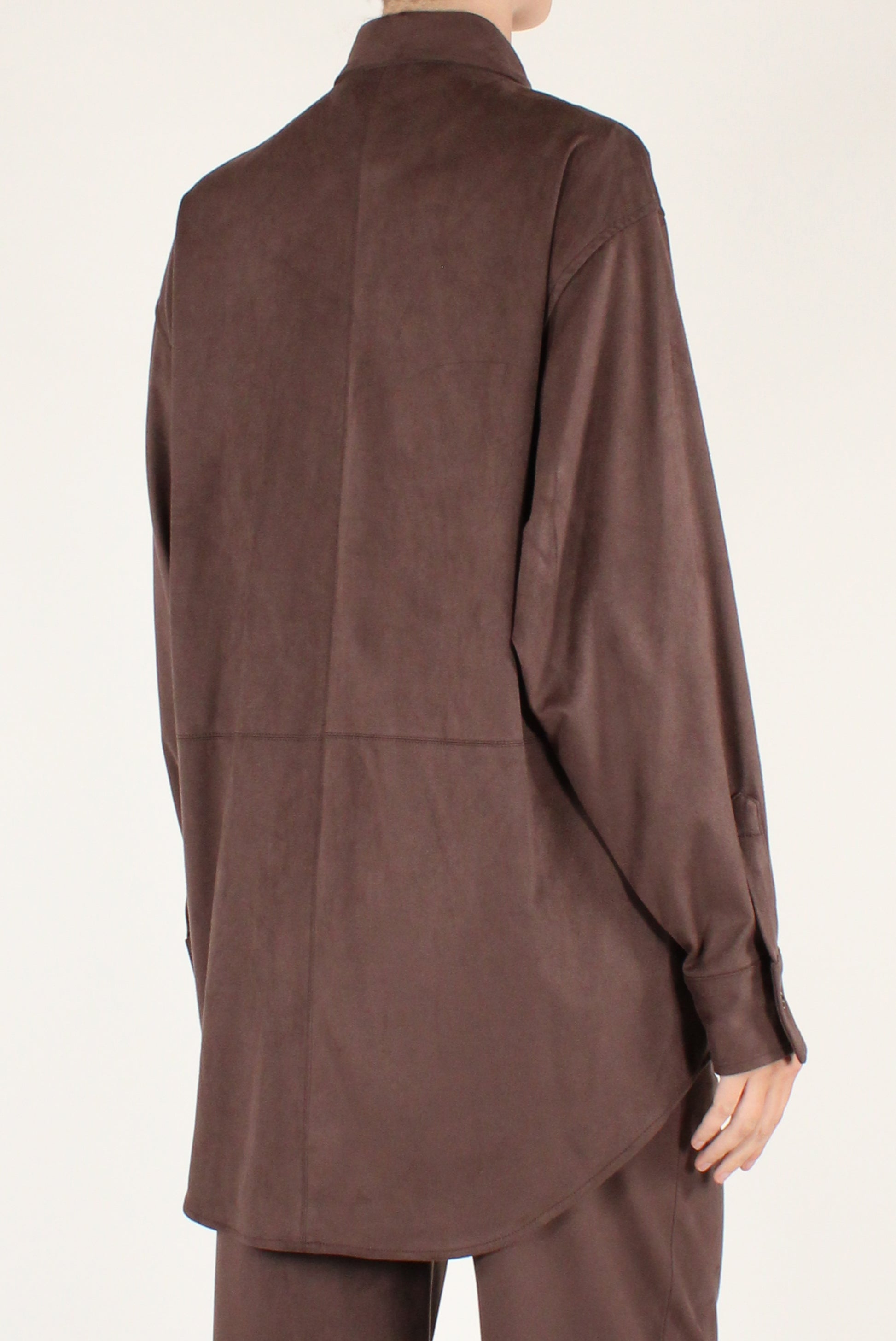 Camicia over in eco camoscio, elasticizzata. Colletto classico, a maniche lunghe, con allacciatura a bottoni. Dettaglio cucitura a vista e fondo stondato.