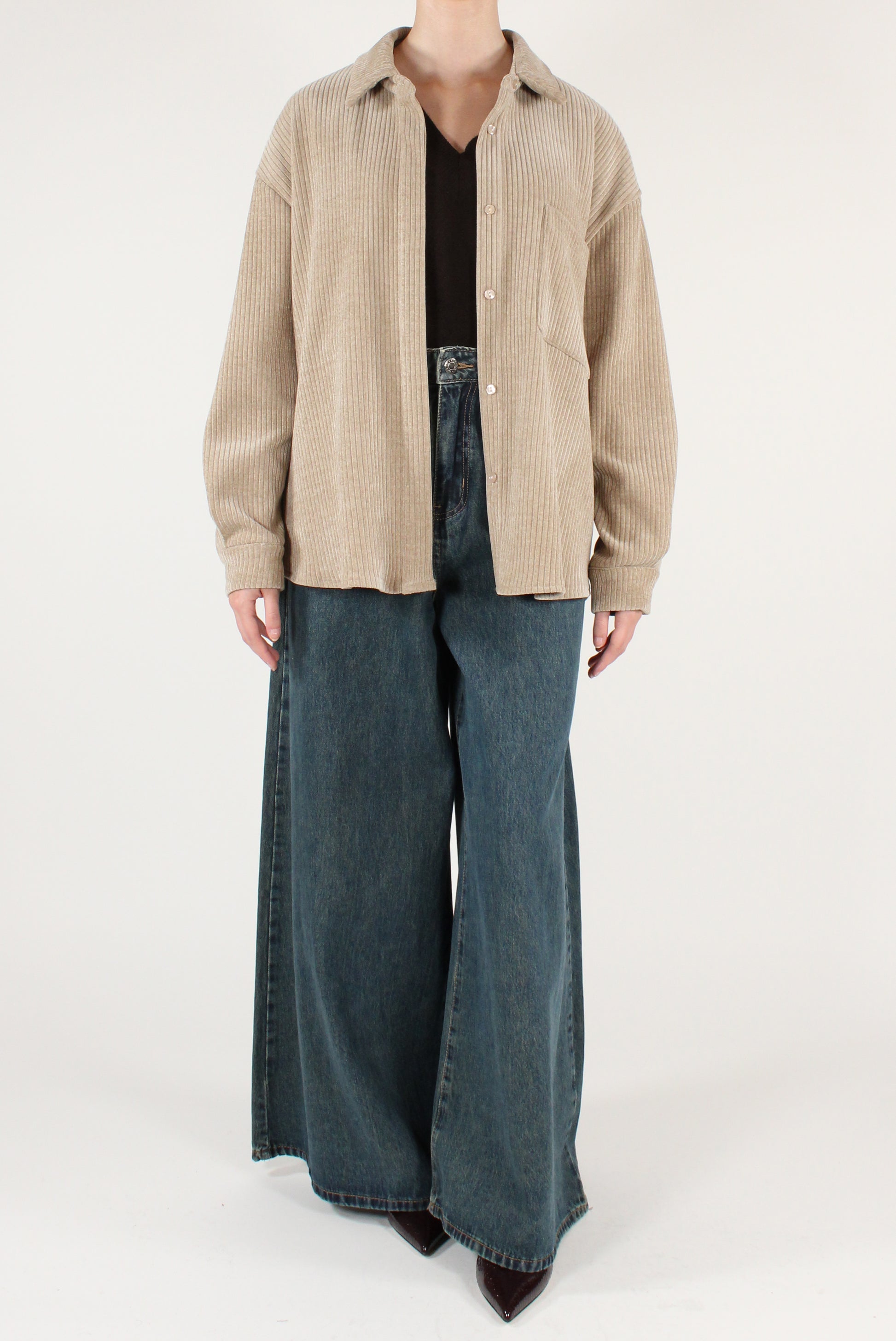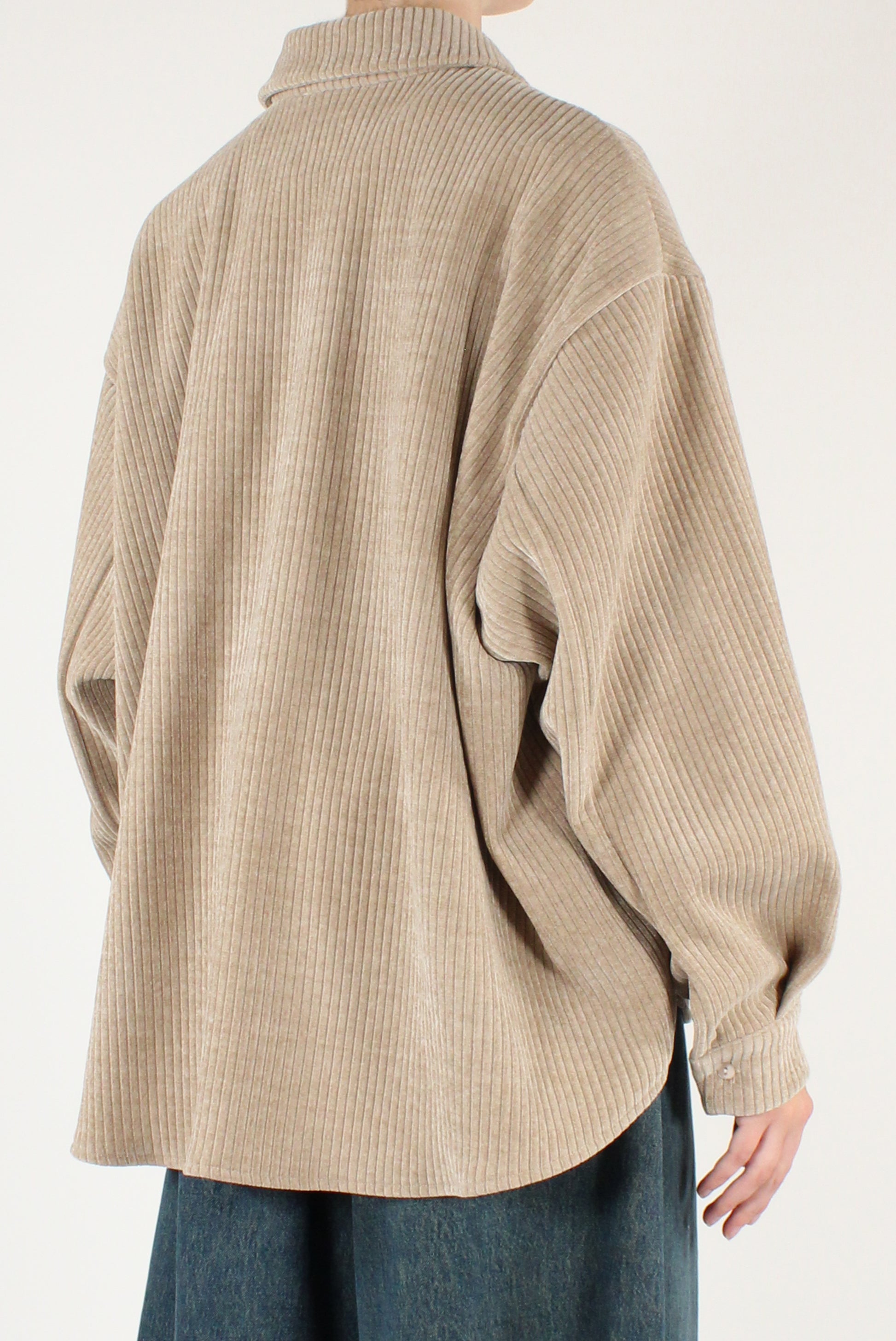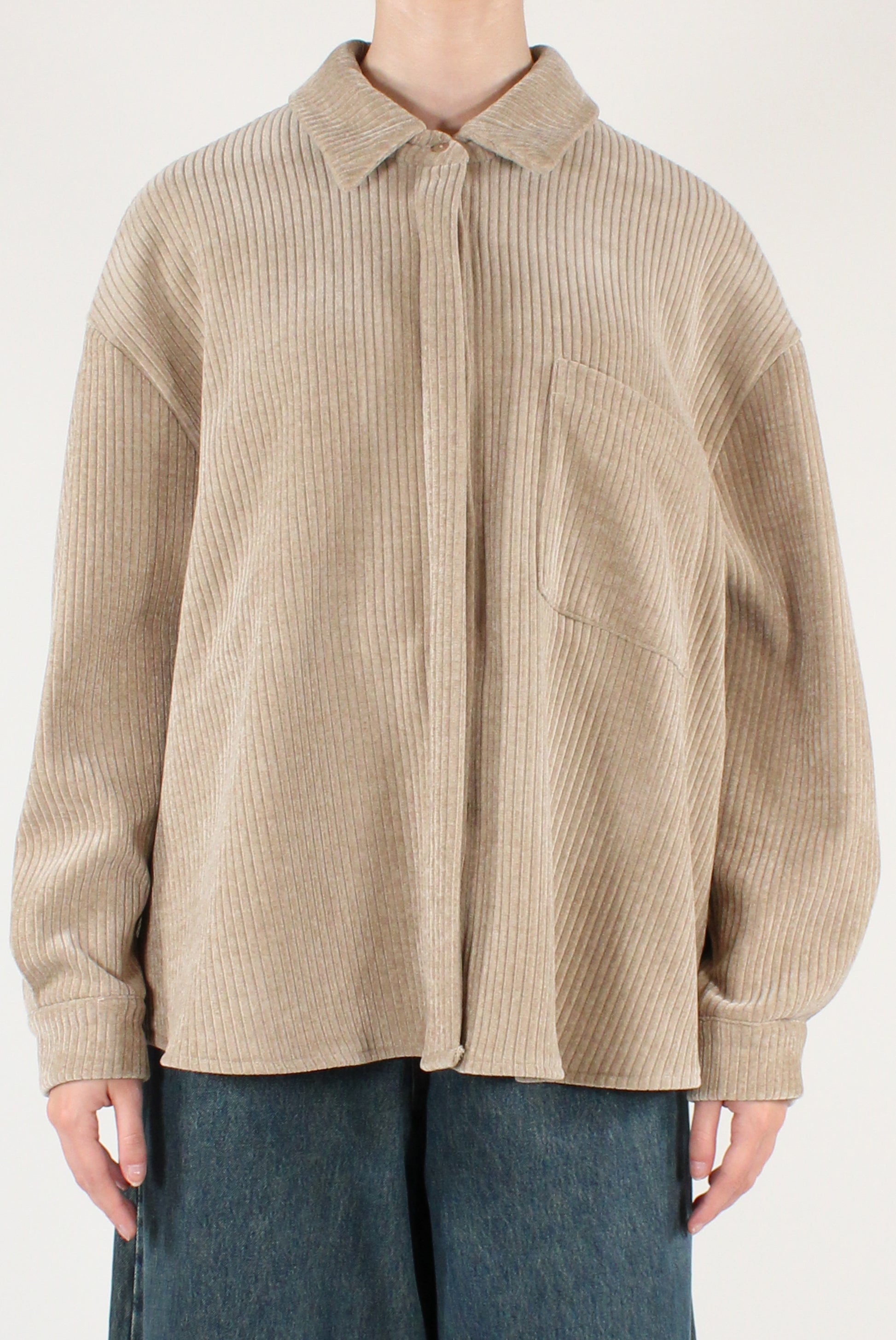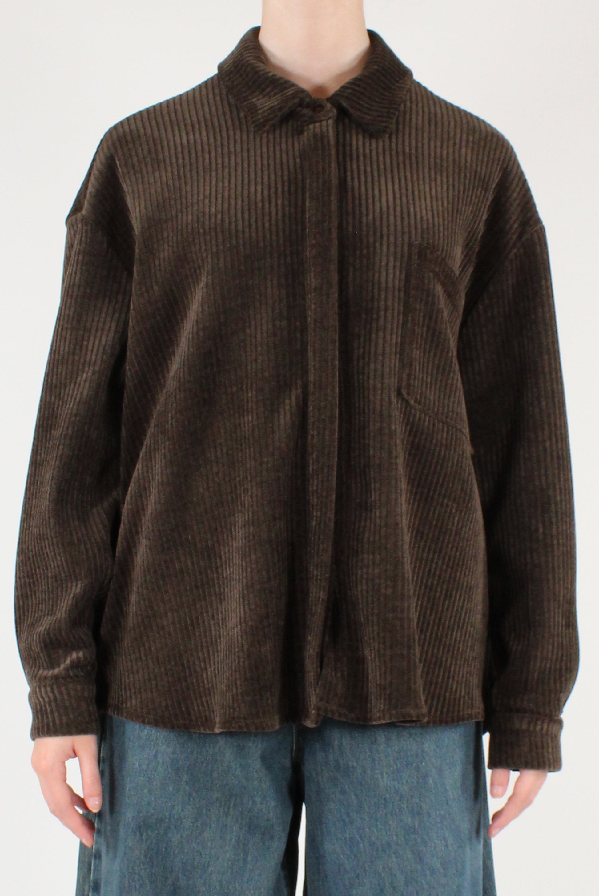 Camicia over in velluto a coste. Colletto classico, a maniche lunghe con abbottonatura nascosta. Dettaglio tasca applicata e fondo stondato.